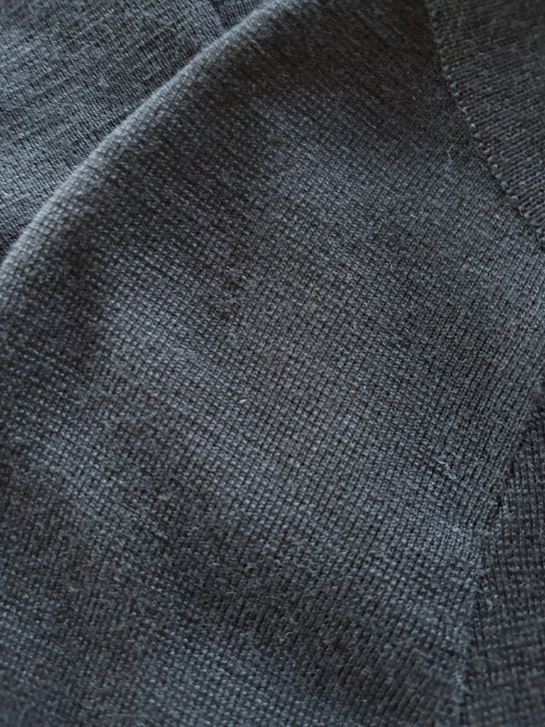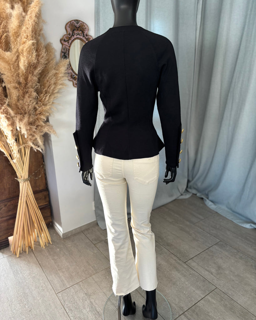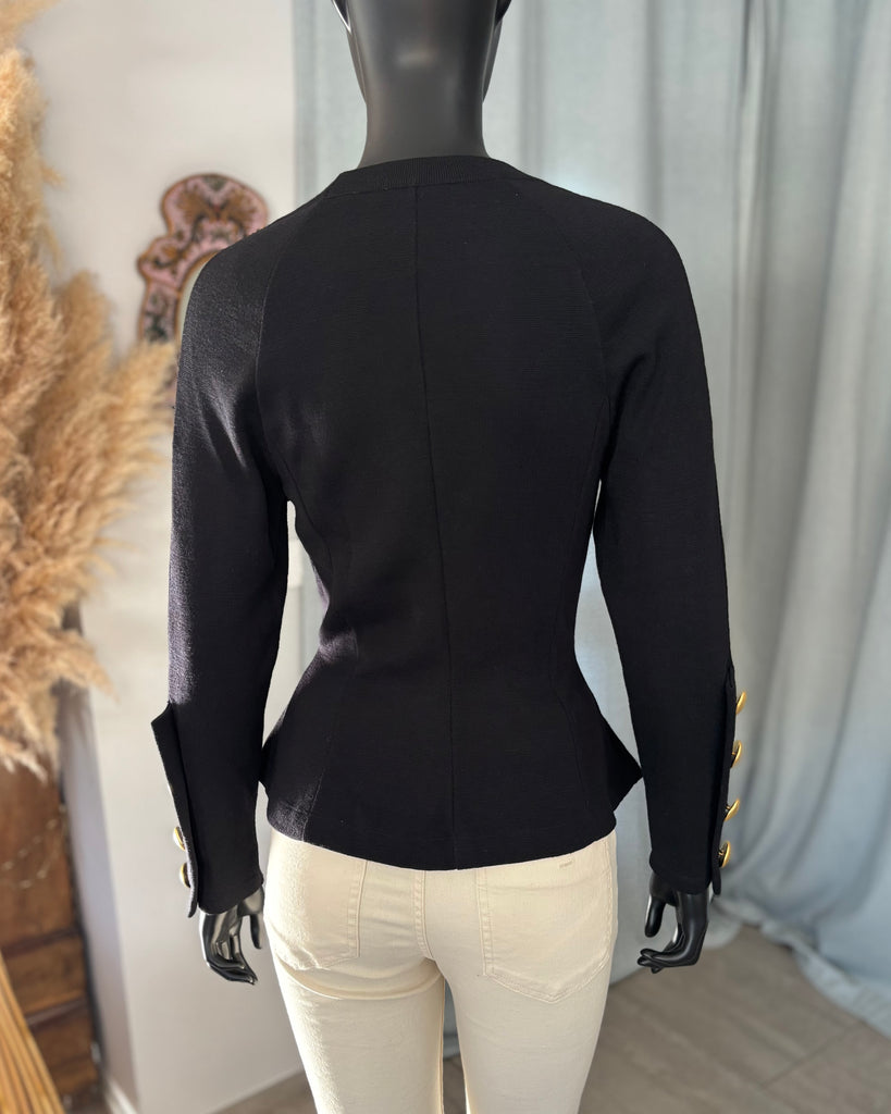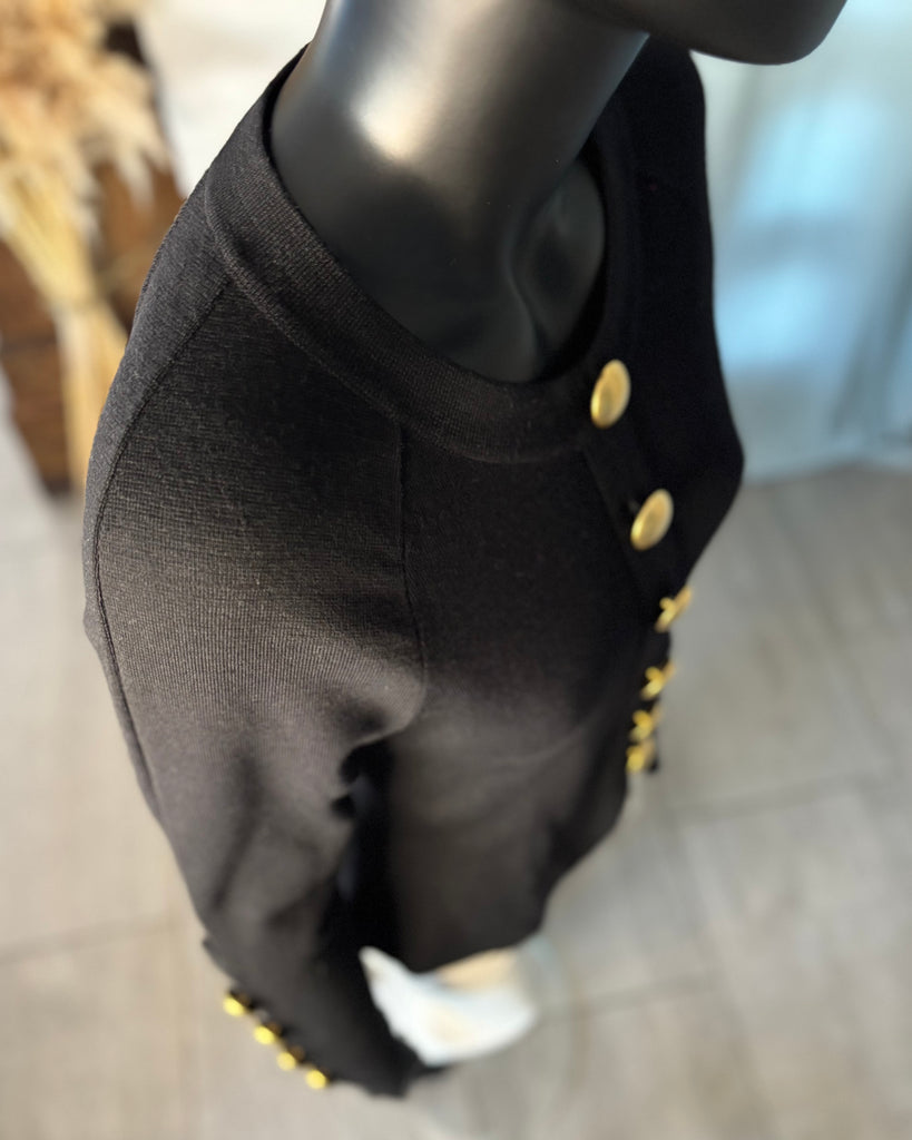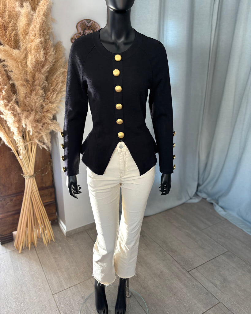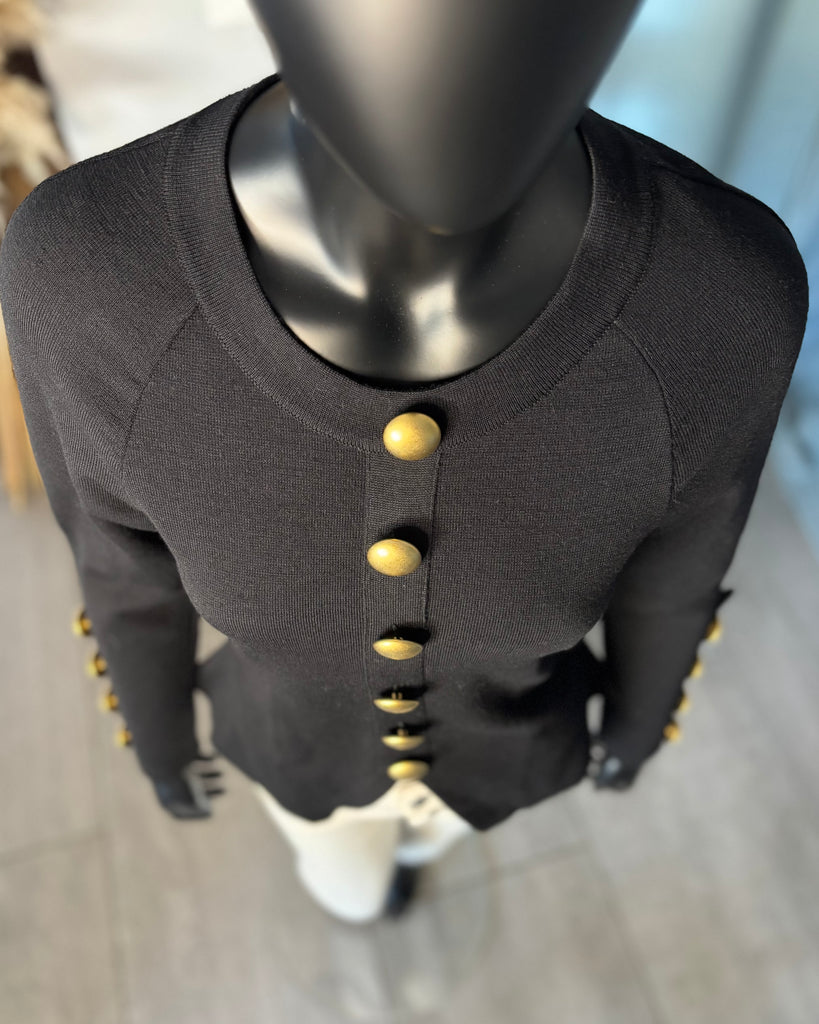 Pull en laine noire. Coupe ajustée à la taille avec découpe en pointe à l’avant et droite à l’arrière. Encolure ronde, gros boutons dorés effet polissé décoratifs. Manches raglan avec épaules légèrement marquées et poignets avec découpe et gros boutons décoratifs.