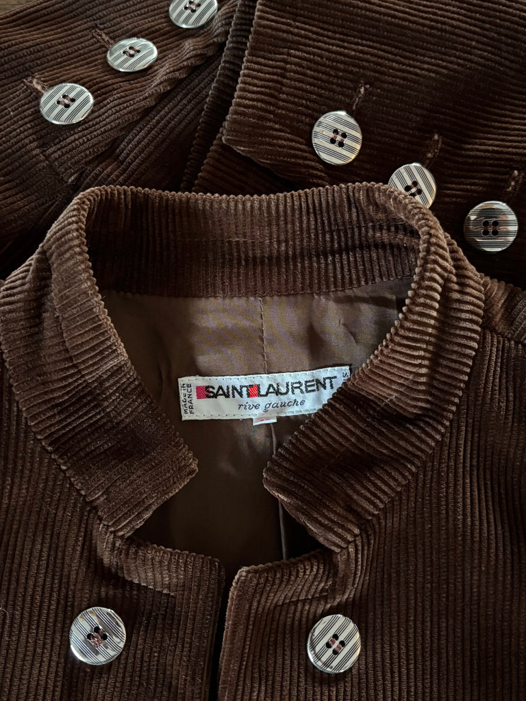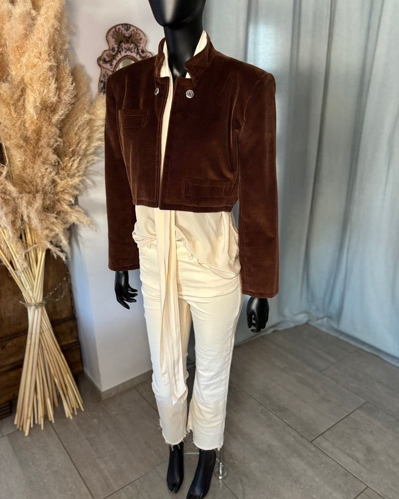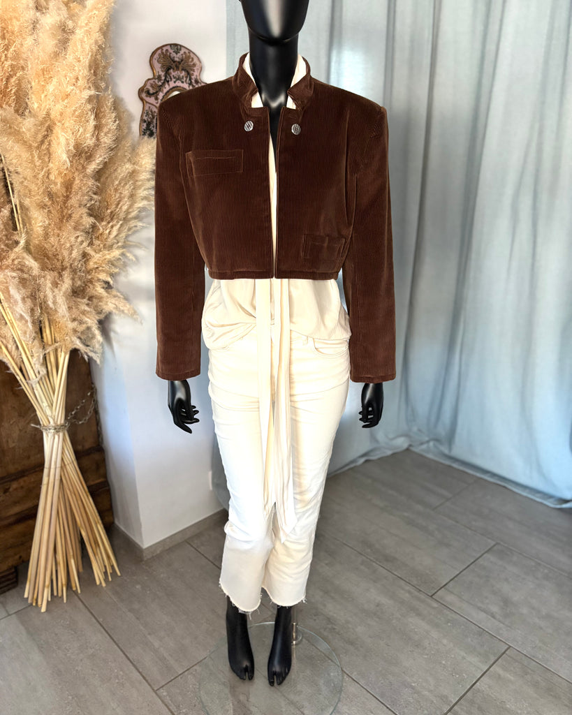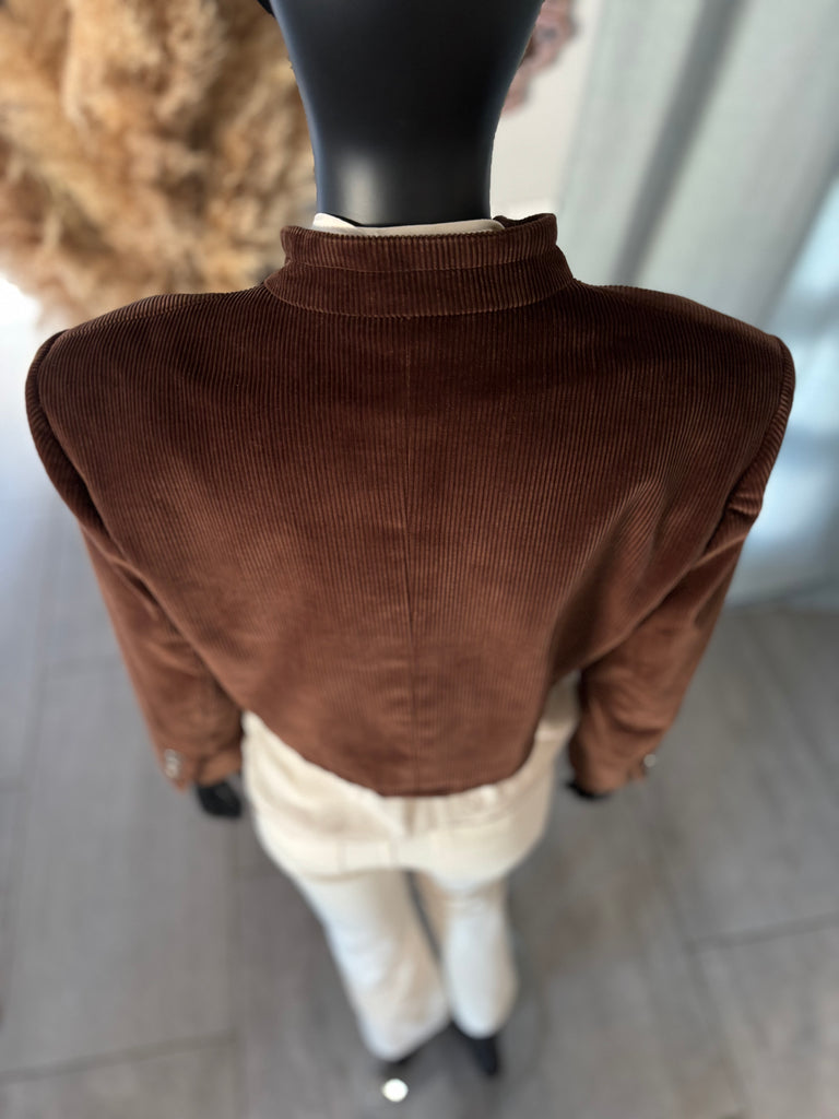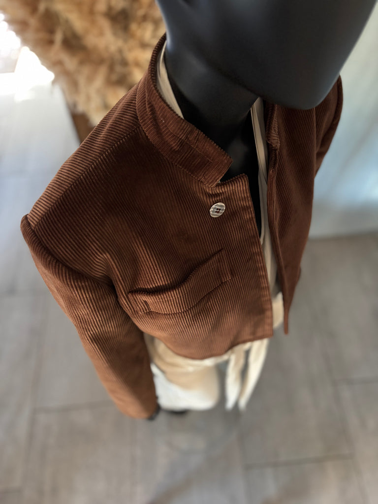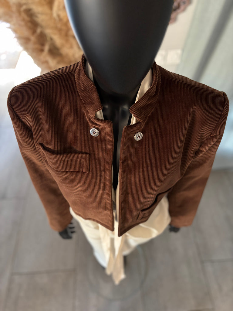 Veste courte/ Spencer en velours côtelé de couleur camel. Petit col montant, pas de fermeture, boutons décoratifs. Épaules structurées par des épaulettes épaisses, manches 7/8 et poignets terminés par 3 boutons. Une pochette et une petite poche passepoilées. Doublé.