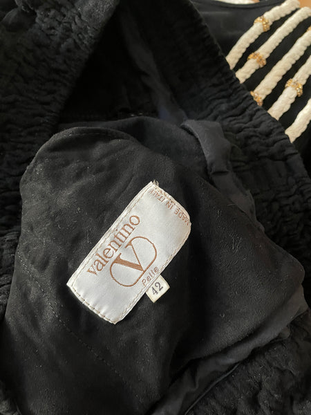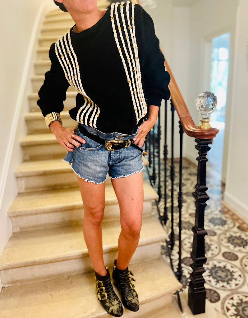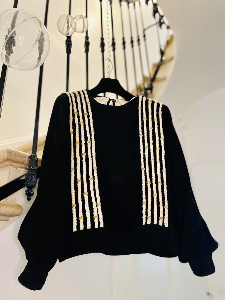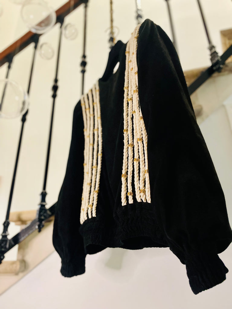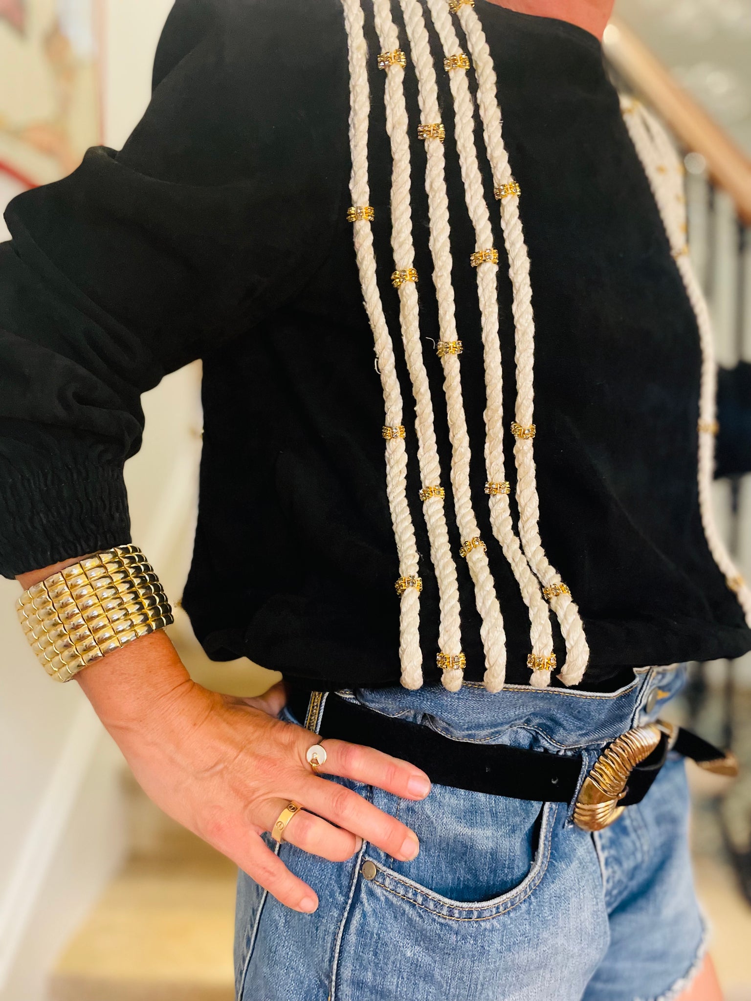 Sweat en peau très souple de couleur noire, décoré de cordelettes torsadées en coton avec mini crochets dorés et strassés. Fermeture dans le dos avec 1 bouton. Poignets et ceinture élastiqués, 2 poches.