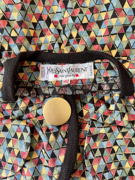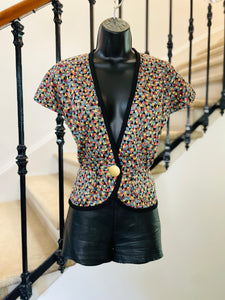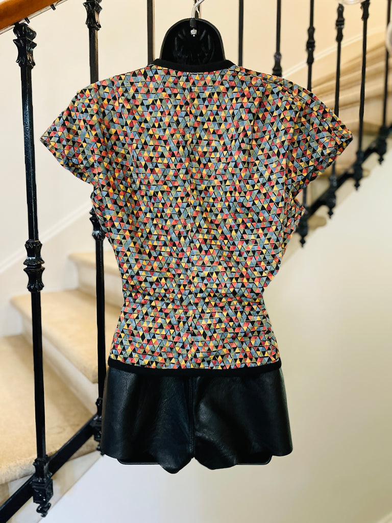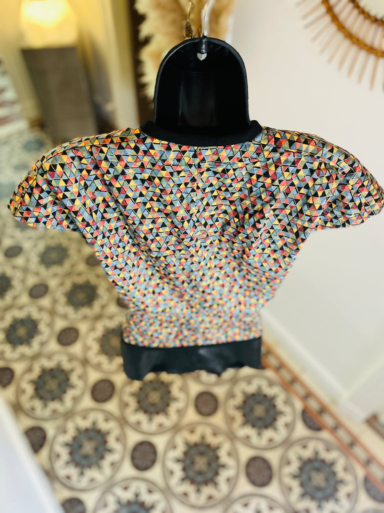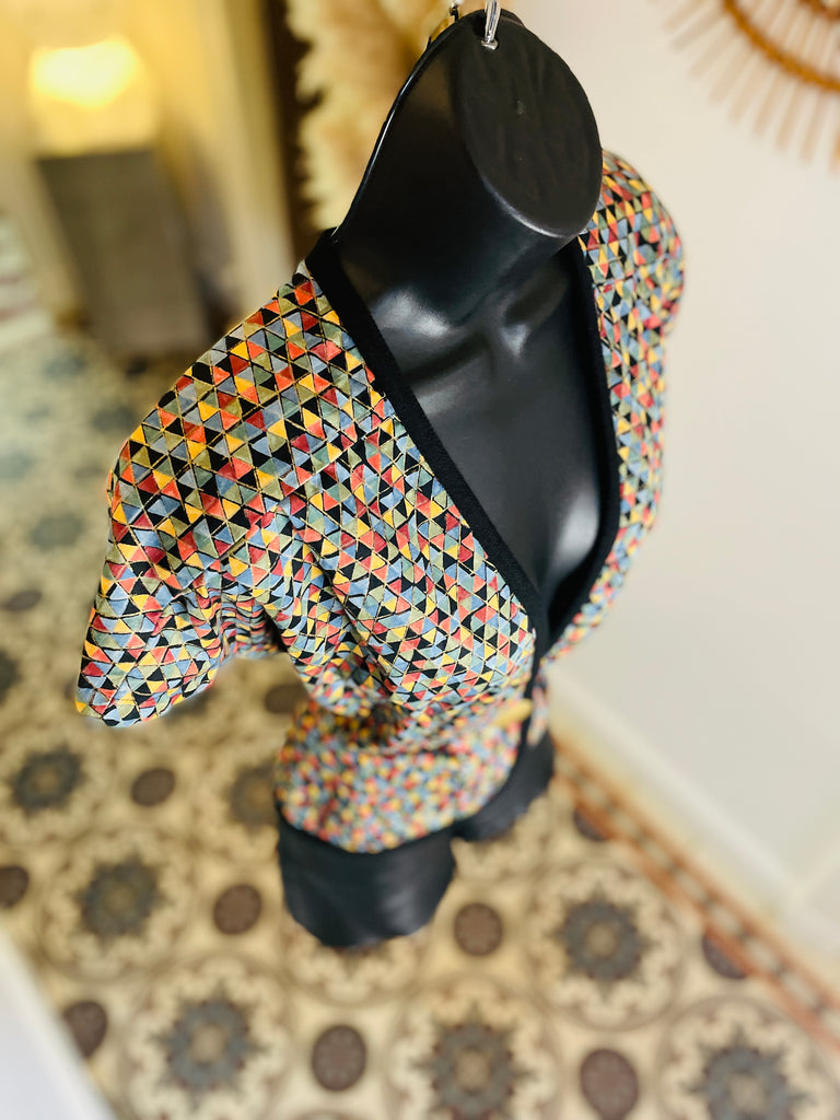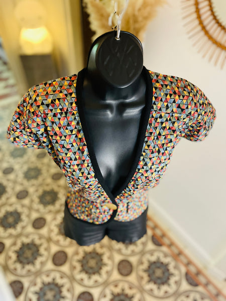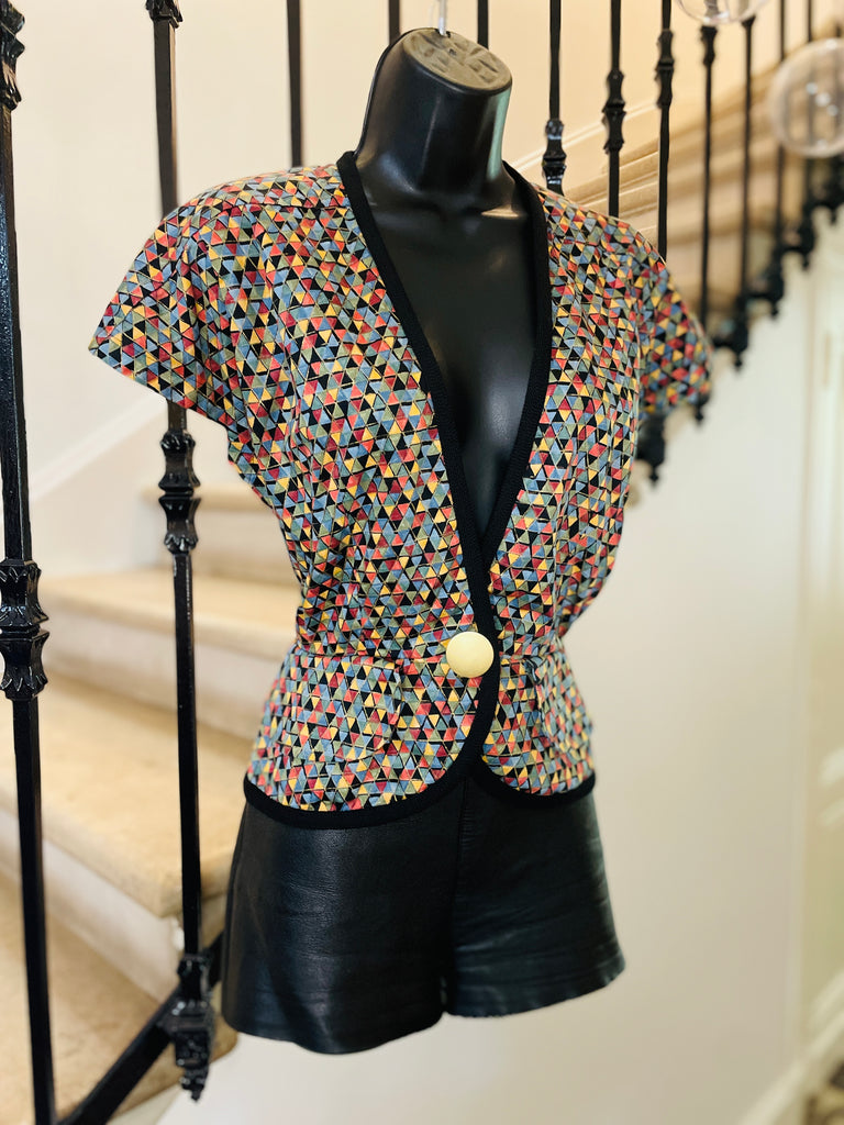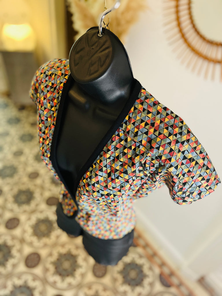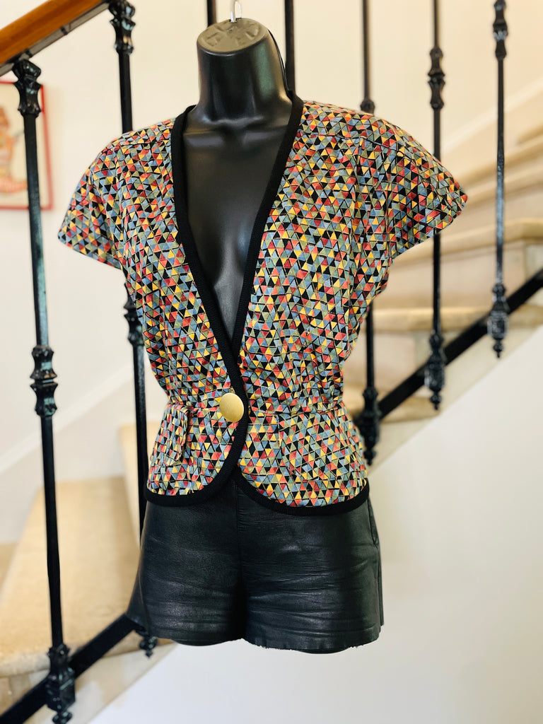 Top ou veste en coton à l’imprimé triangles dans des couleurs rouge, jaune, vert, bleu, noir et doré gansé d’un galon en laine noire. Coupe ajustée à la taille et sur les hanches avec fermeture par 1 gros bouton doré mate, décolleté en V profond, jeu de plis au niveau des épaules à l’avant et dans le dos, manches courtes raglan façon mancherons et 2 petites poches avec rabat.