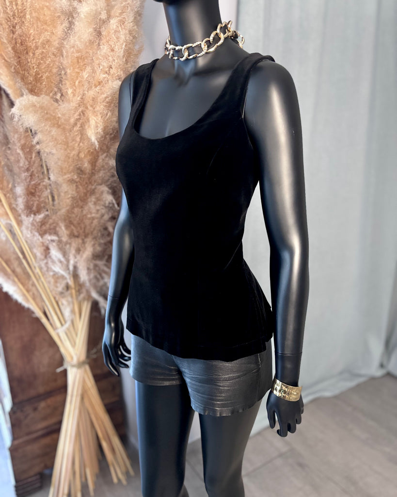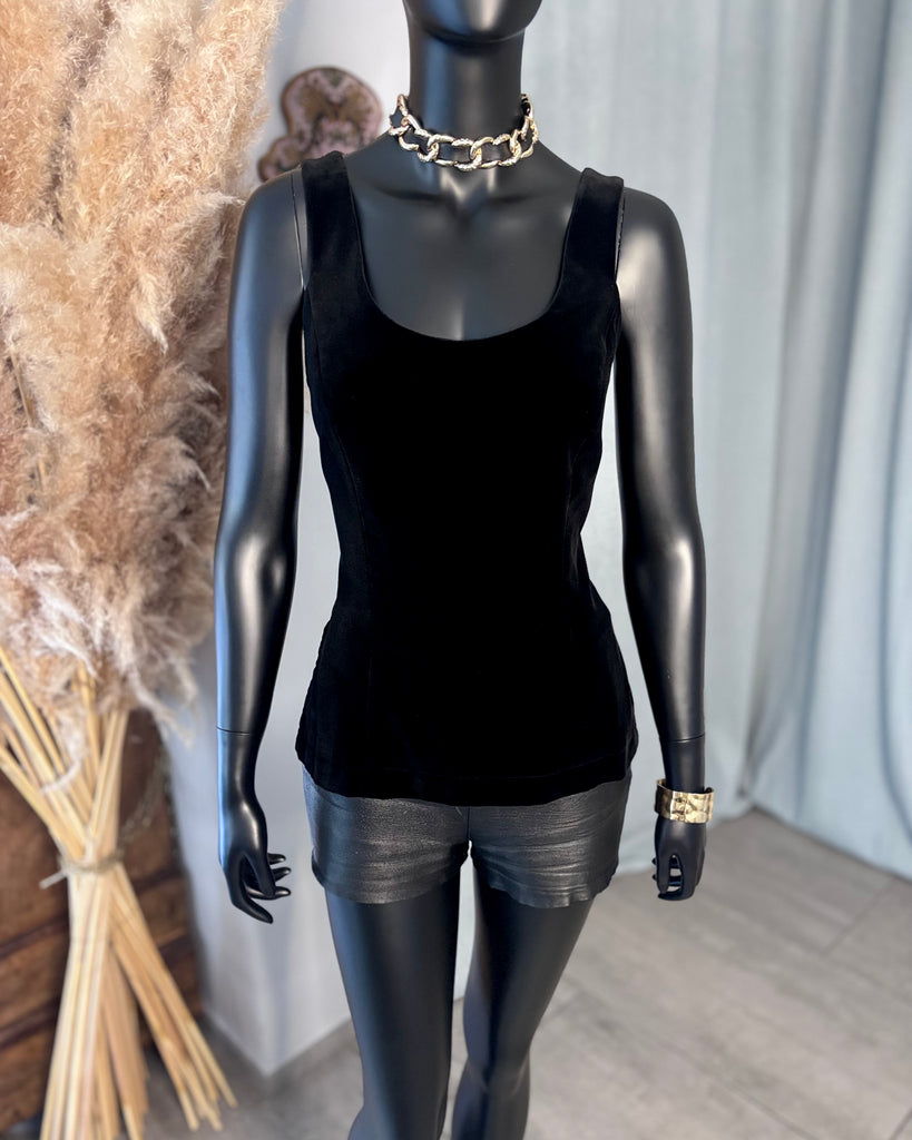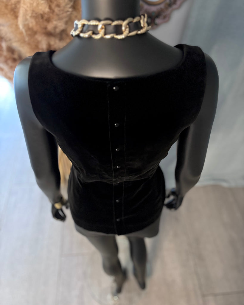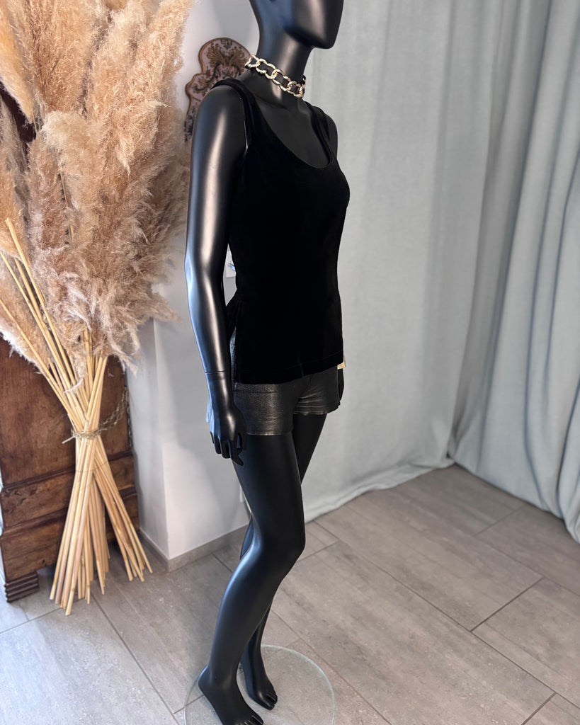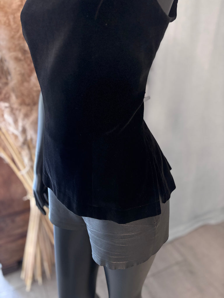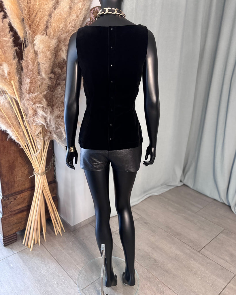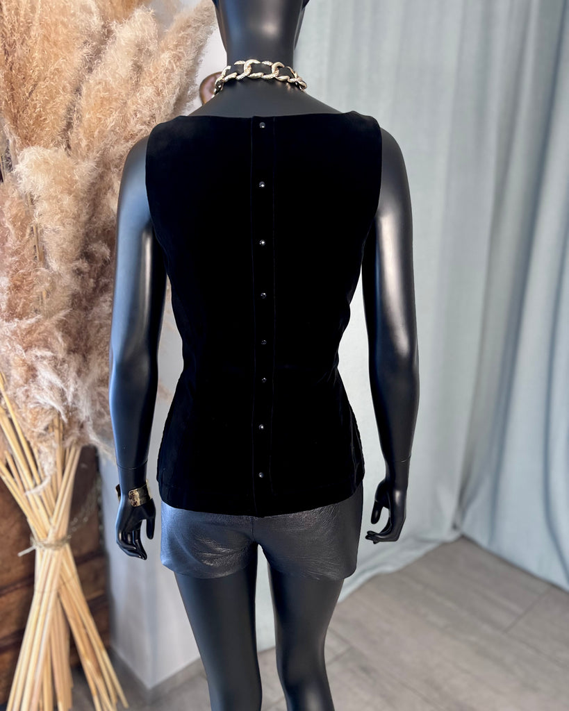 Top sans manches, en velours ras noir. Coupe ajustée, décolleté dégagé en arrondi sur l’avant, haut et carré dans le dos, 2 fentes latérales. Fermeture dans le dos par boutons pression noirs. Doublé.