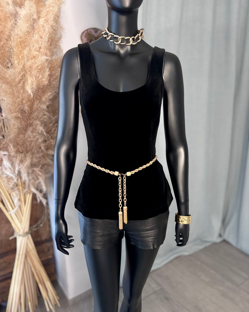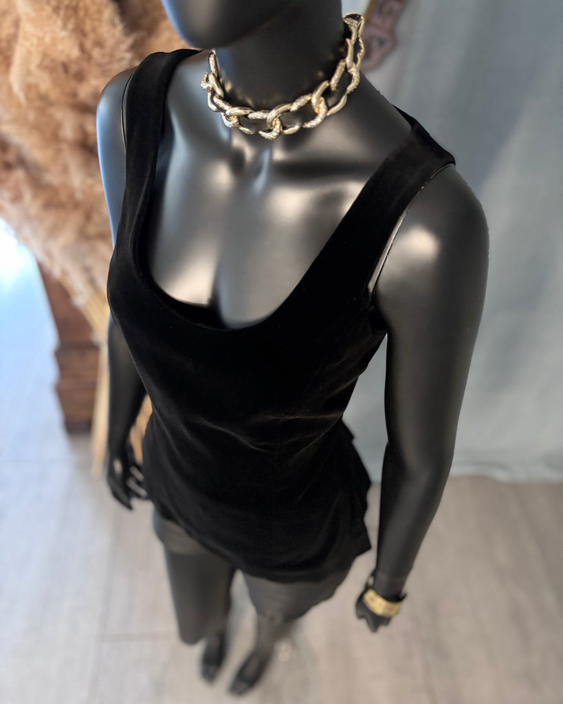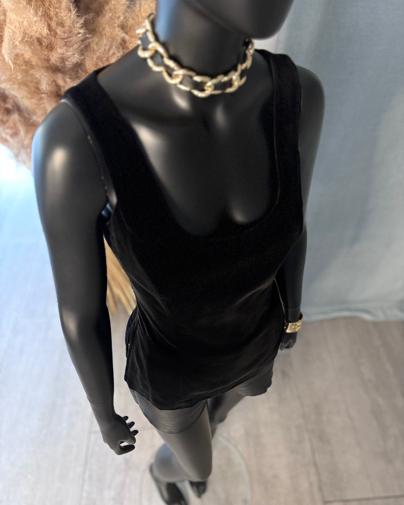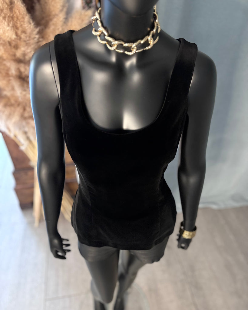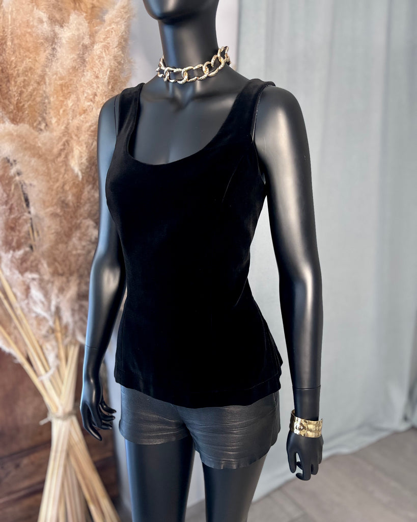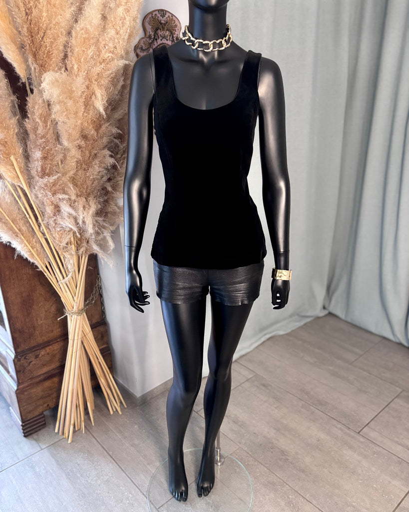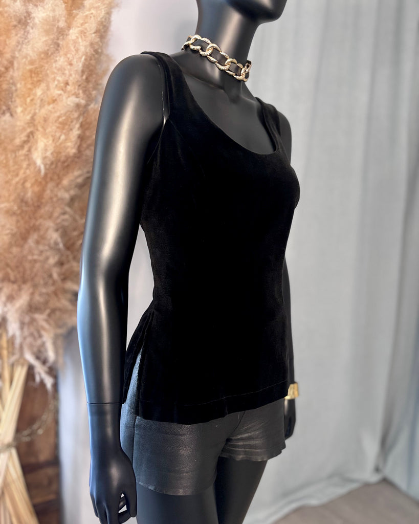 Top sans manches, en velours ras noir. Coupe ajustée, décolleté dégagé en arrondi sur l’avant, haut et carré dans le dos, 2 fentes latérales. Fermeture dans le dos par boutons pression noirs. Doublé.