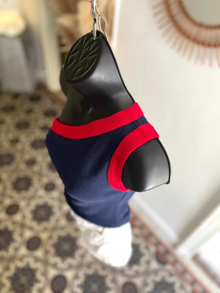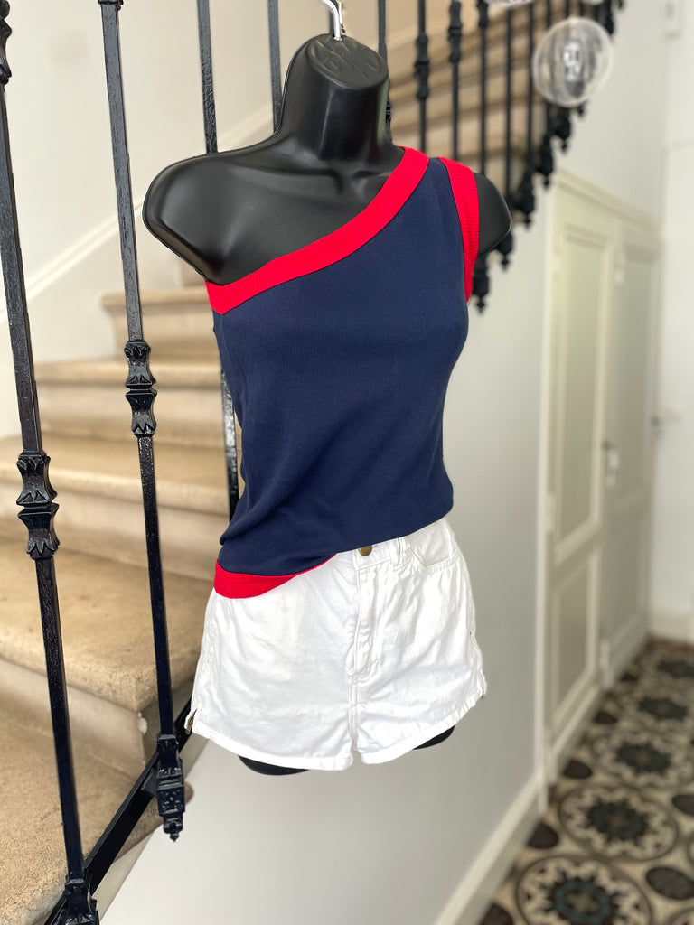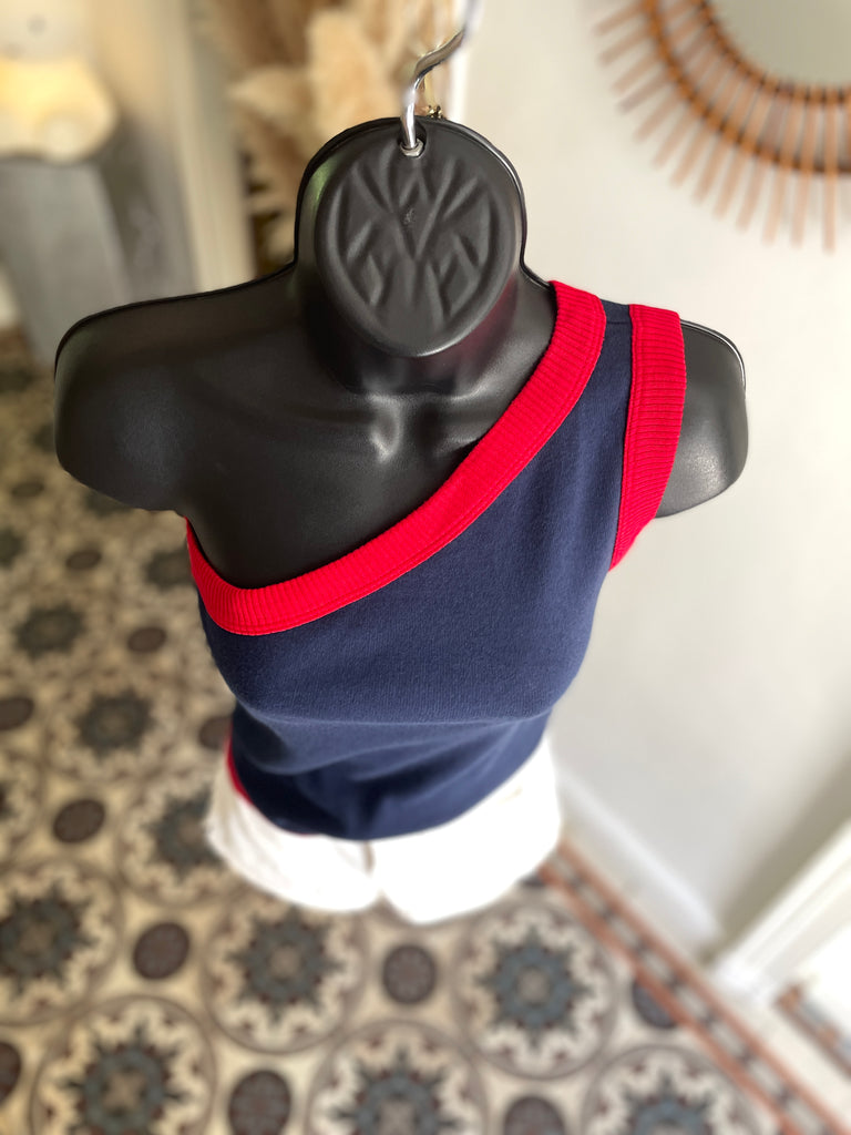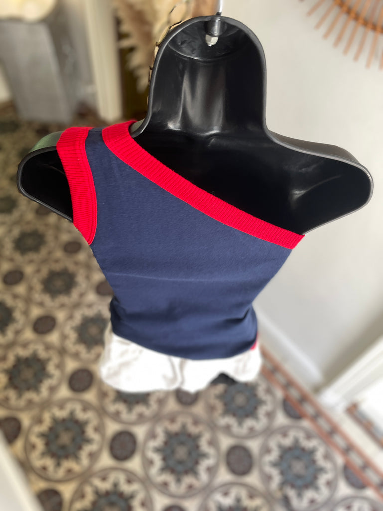 Top asymétrique en coton bleu marine gansé d’un bord côte rouge. Coupe droite.