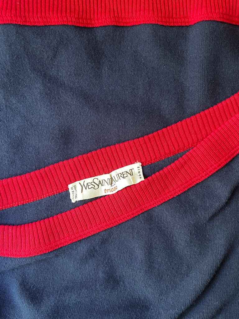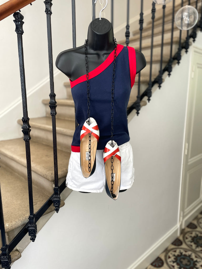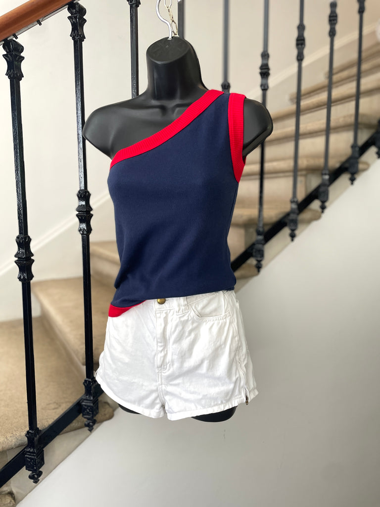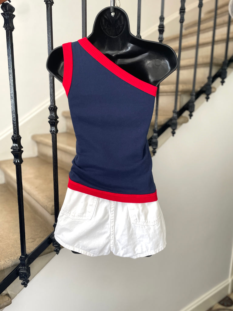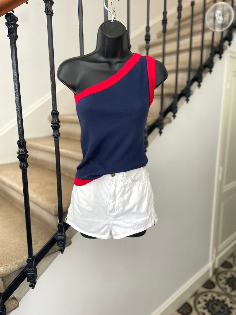 Top asymétrique en coton bleu marine gansé d’un bord côte rouge. Coupe droite.