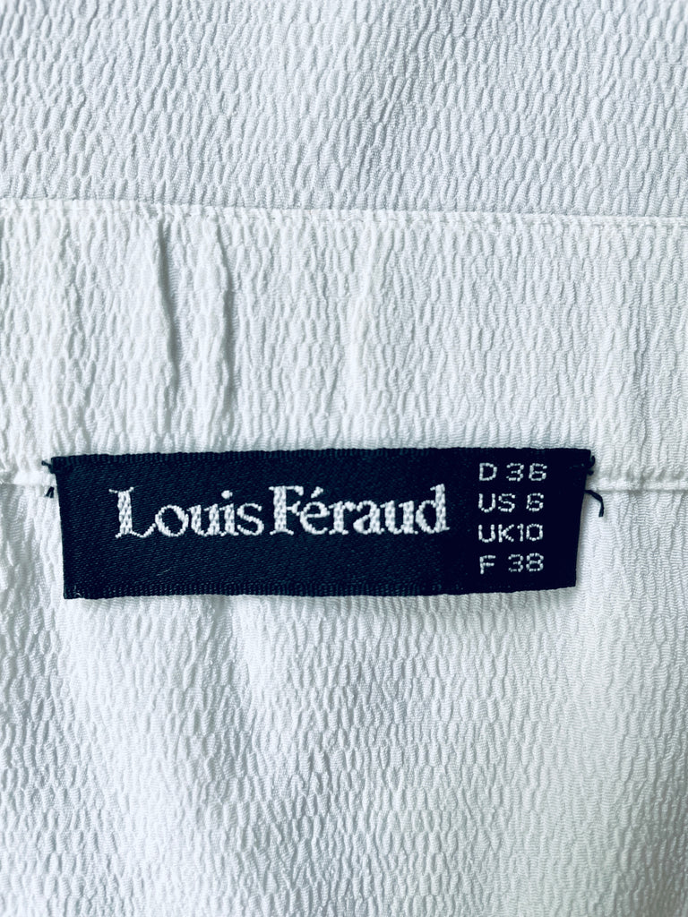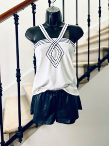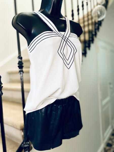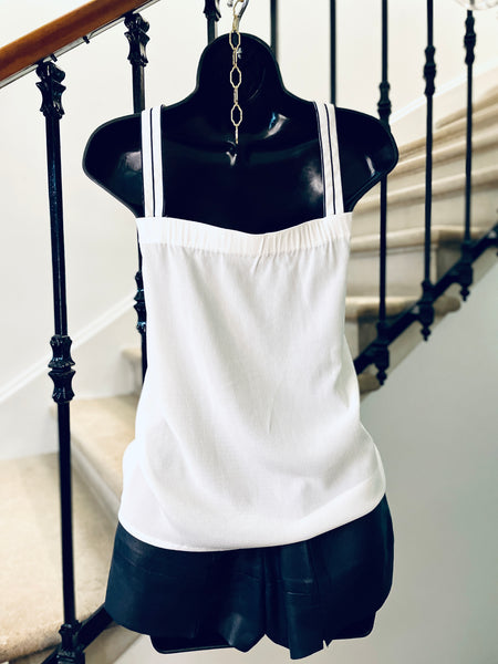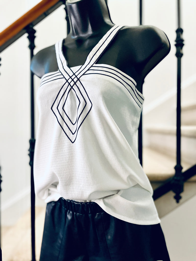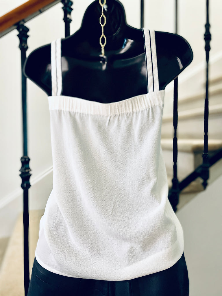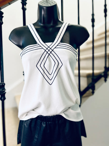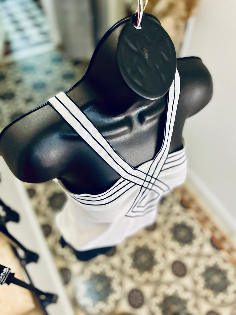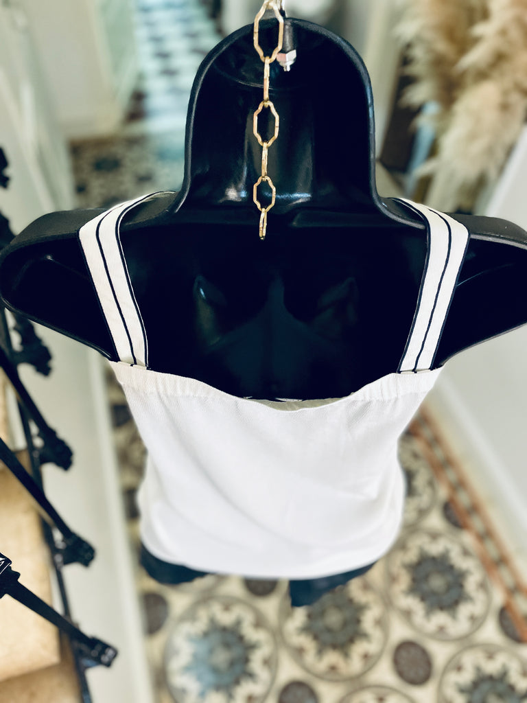 Top en polyester très finement gauffré de couleur blanc avec details bleu marine. Bretelles avec decoupe en biais à l’avant formant un losange sur la poitrine et droites à l’arrière. Dos elastiqué. Pas de fermeture, il faut l’enfiler.