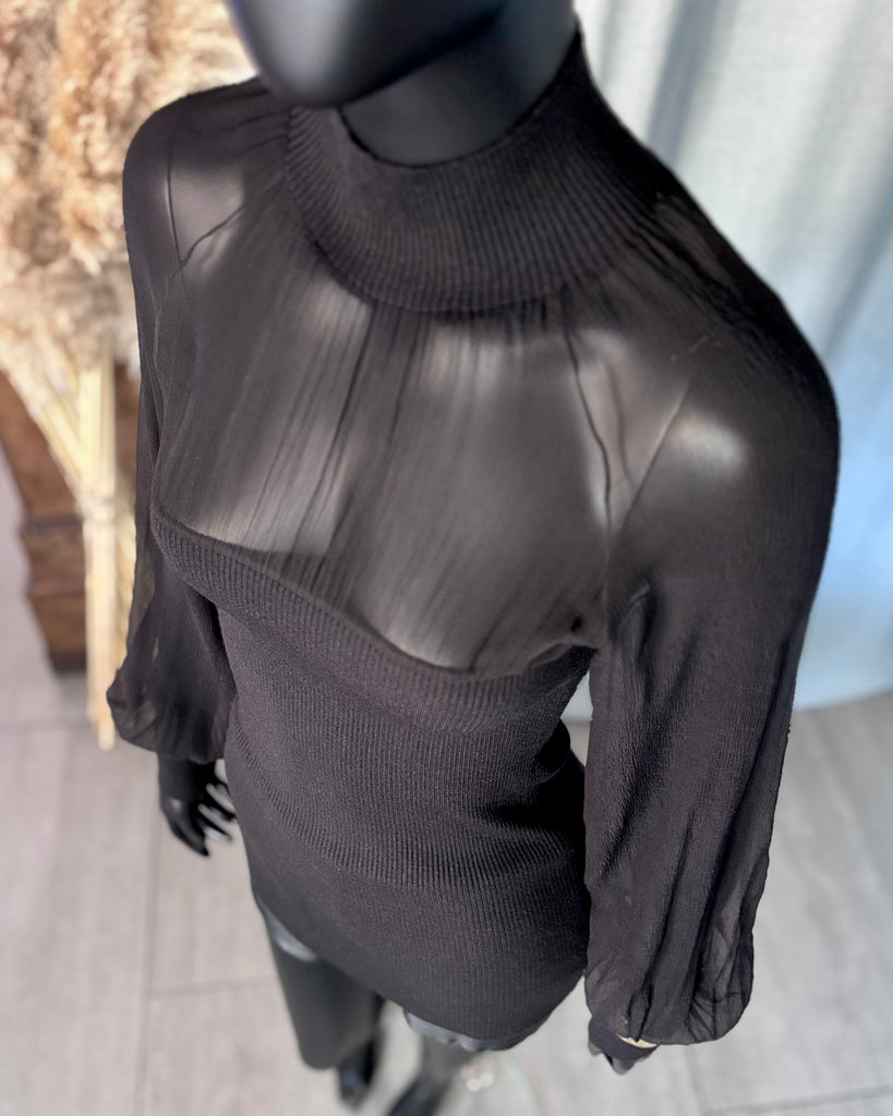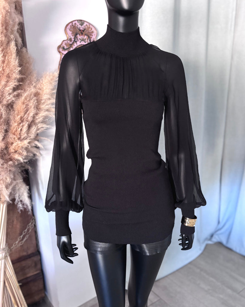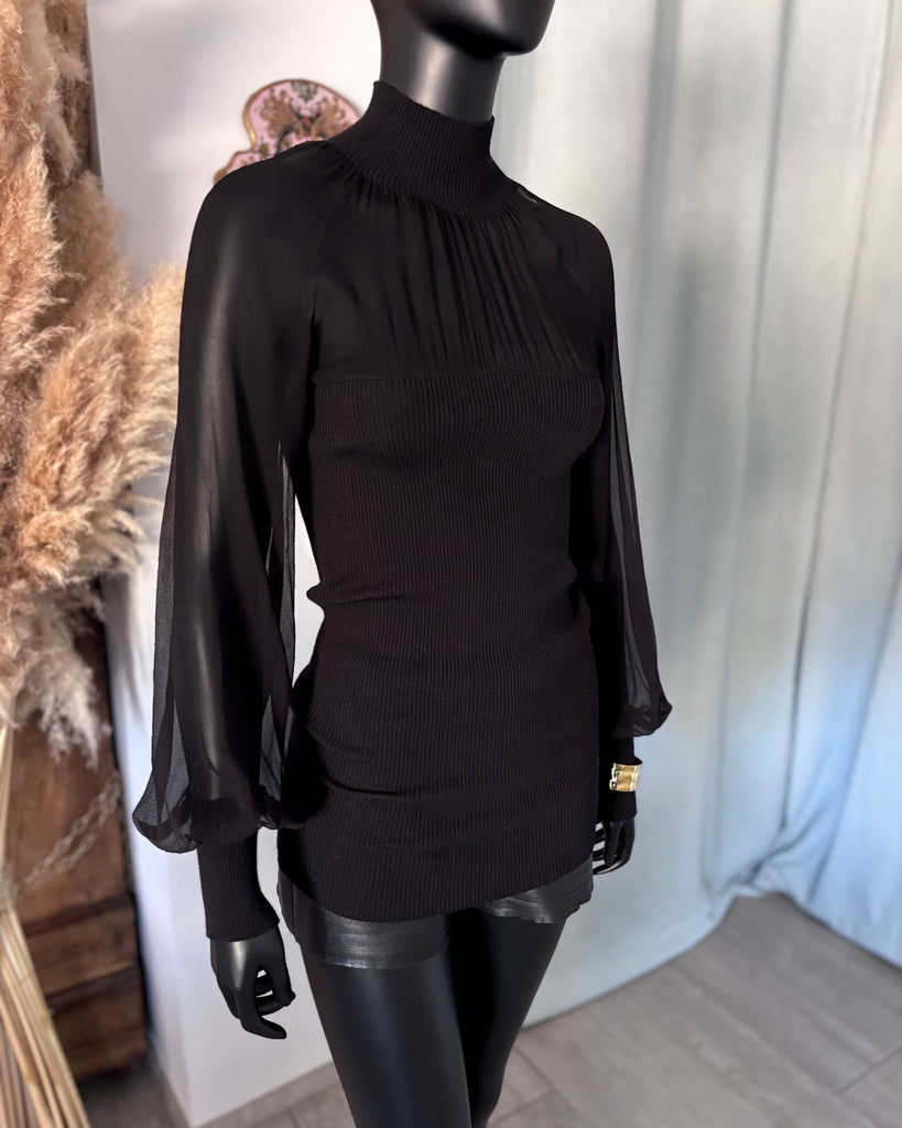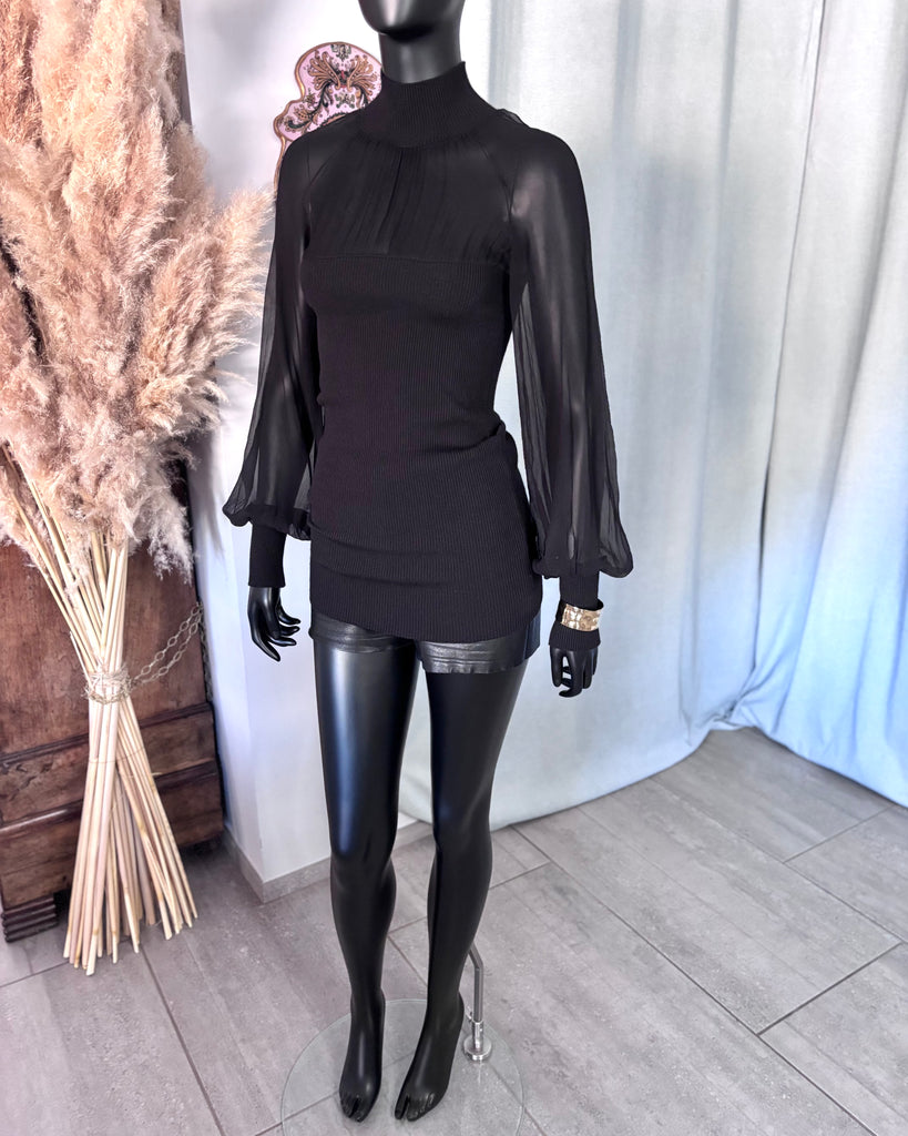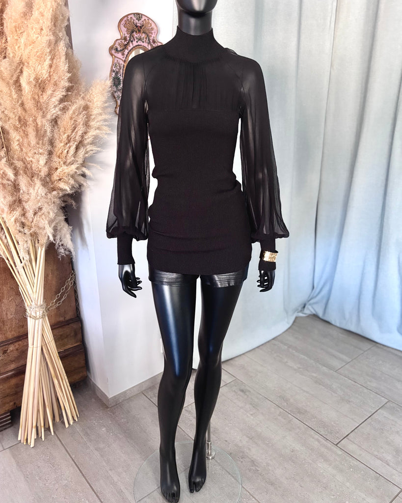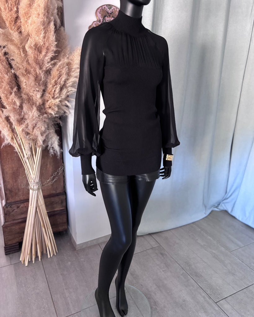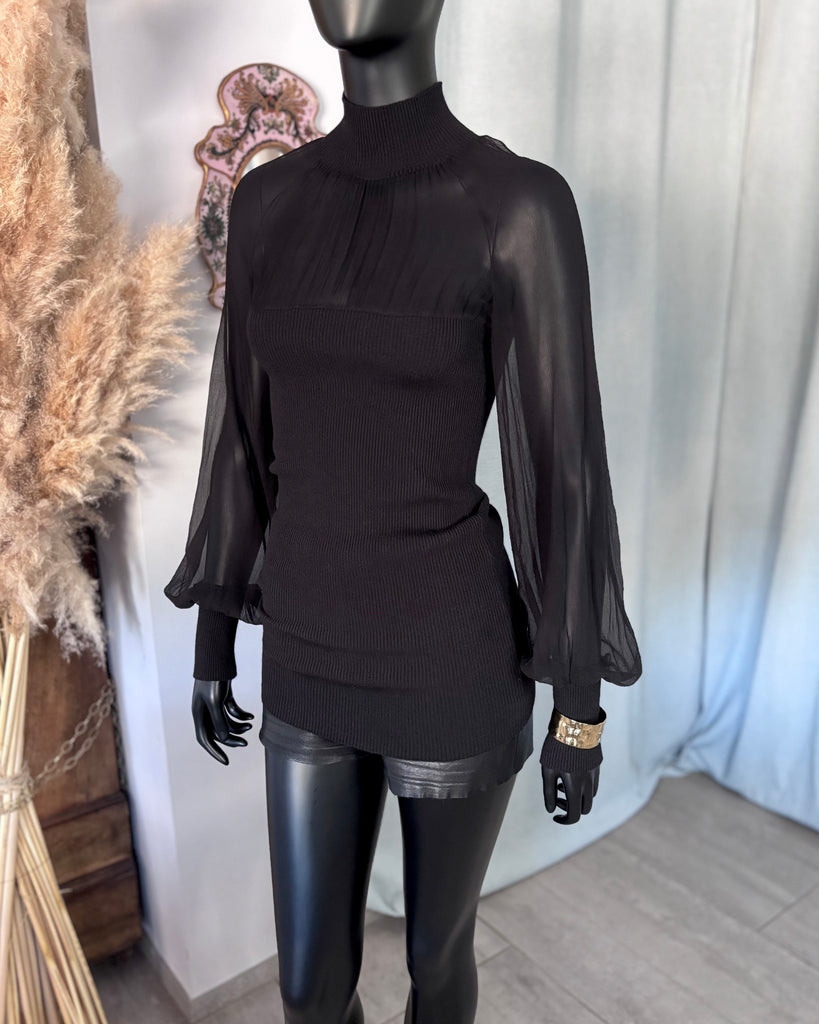 Top long en mousseline de soie et laine de couleur noire. Coupe près du corps, col montant et décolleté très dégagé avec jeu de plis. Manches raglan et bouffantes avec poignets resserrés. Non doublé.