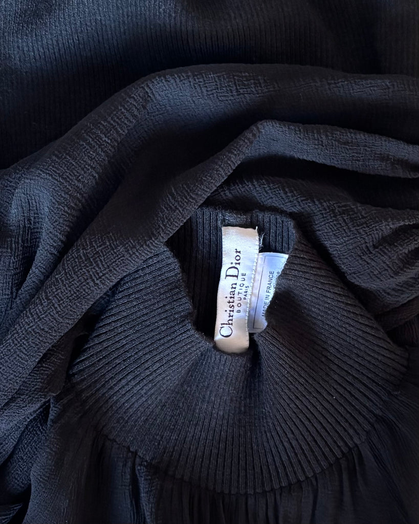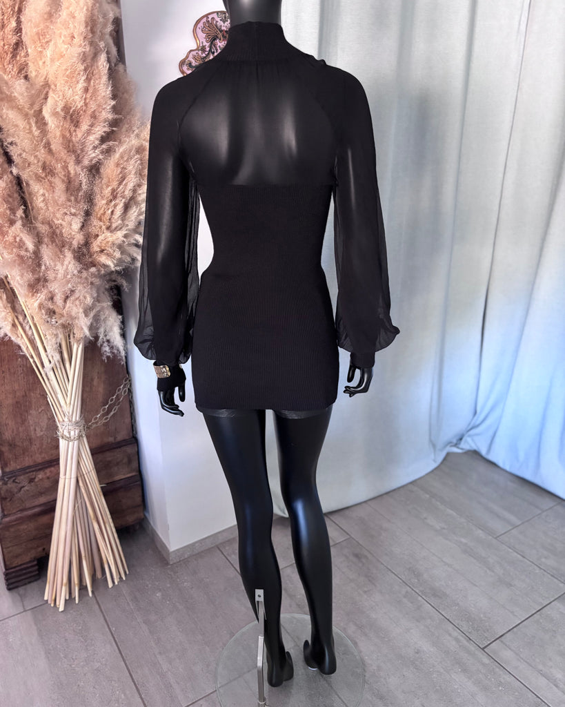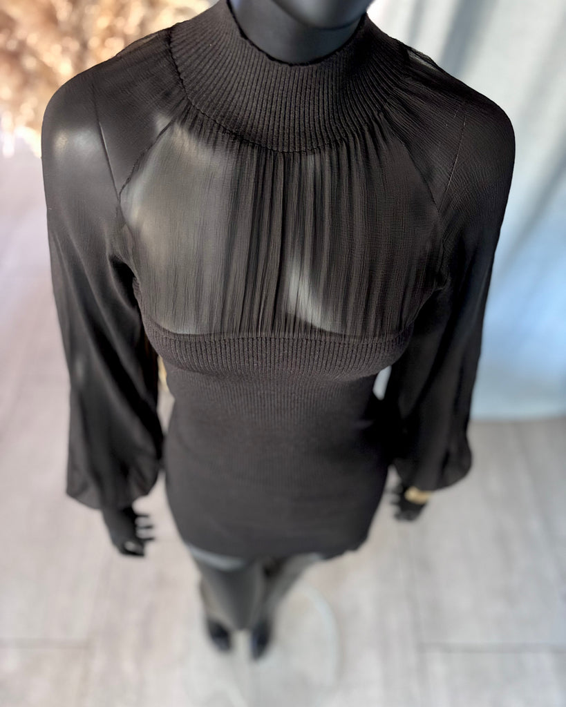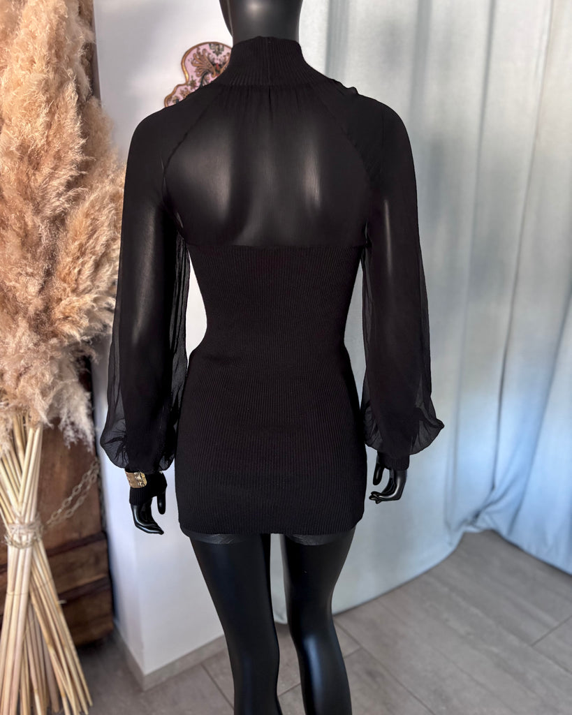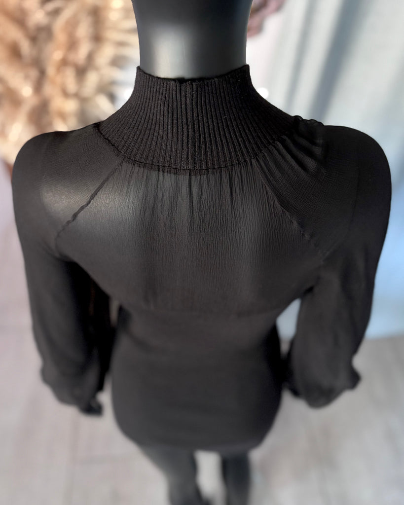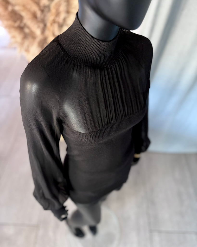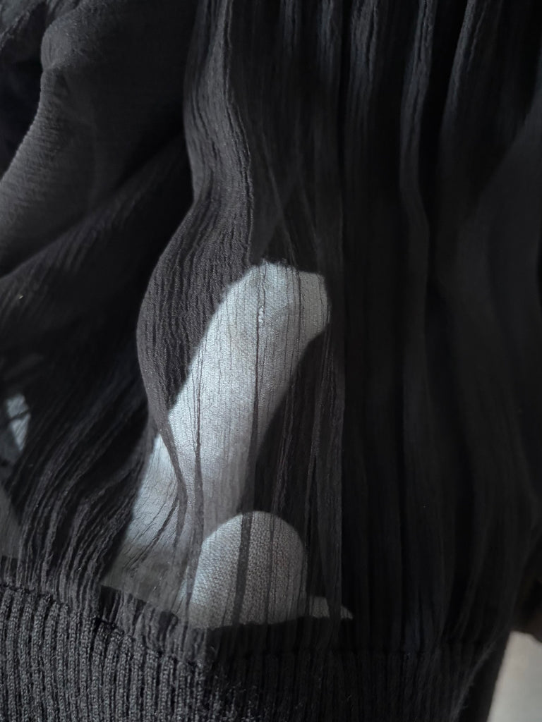 Top long en mousseline de soie et laine de couleur noire. Coupe près du corps, col montant et décolleté très dégagé avec jeu de plis. Manches raglan et bouffantes avec poignets resserrés. Non doublé.