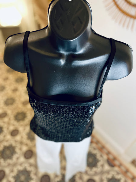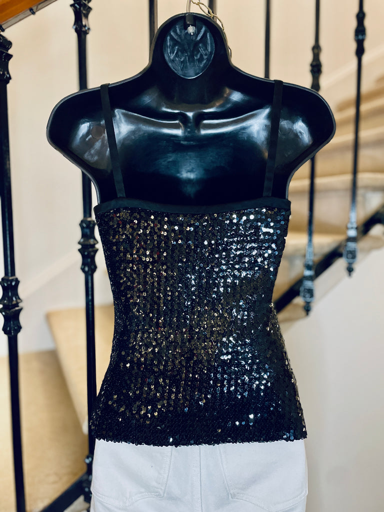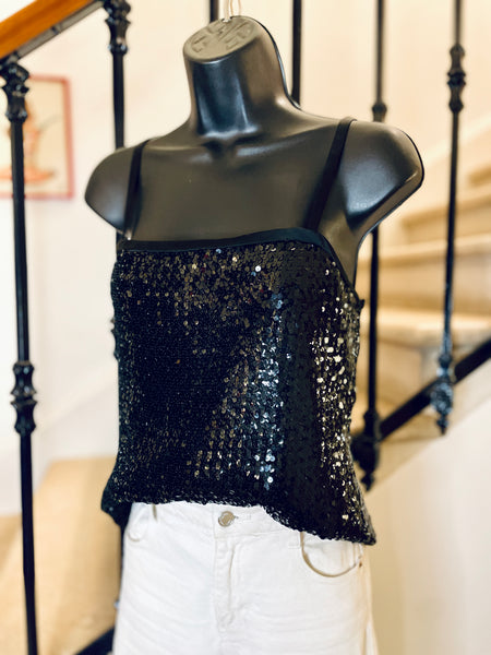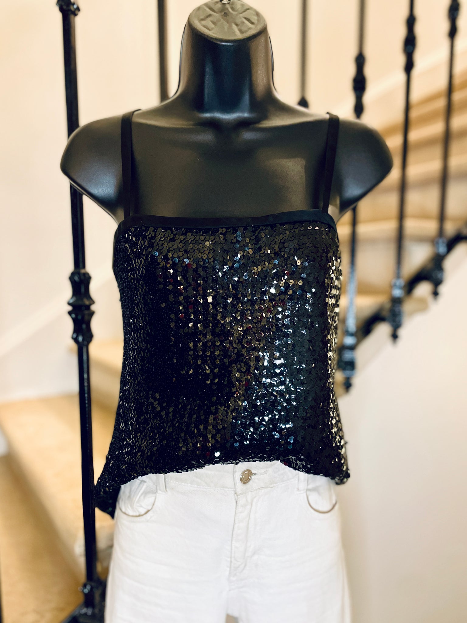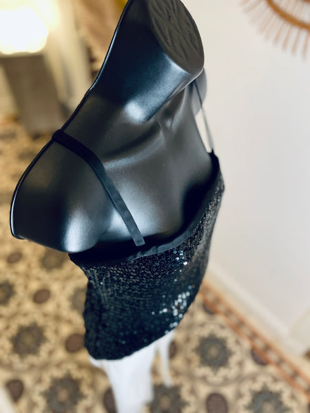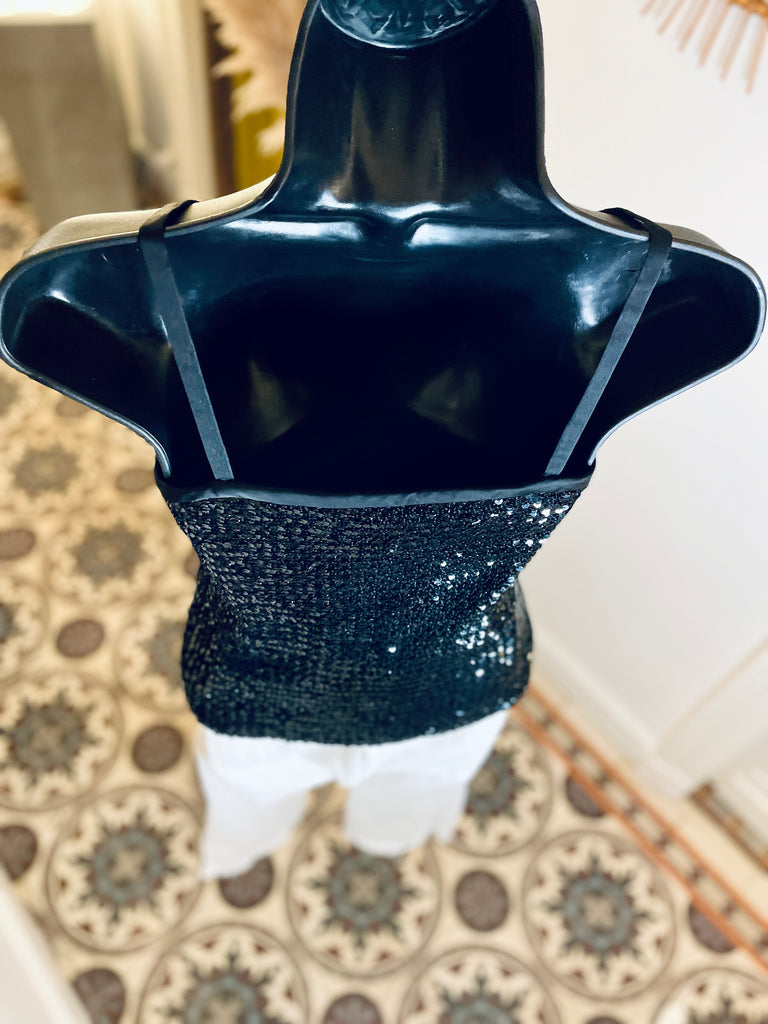 Top Ă bretelles fines en sequins bordĂ© de satin. Coupe droite, encolure droite avec dĂ©coupe lĂ©gĂšrement en pointe au niveau des bretelles. Fermeture latĂ©rale par zip masquĂ© et un petit crochet. DoublĂ©.Â