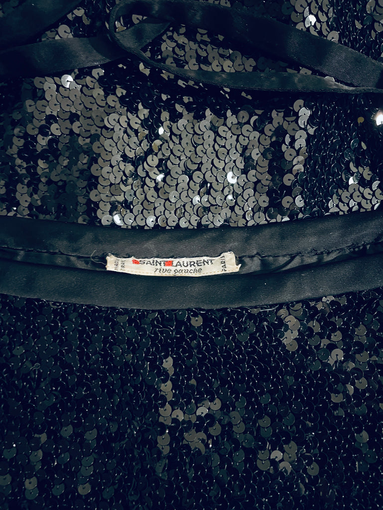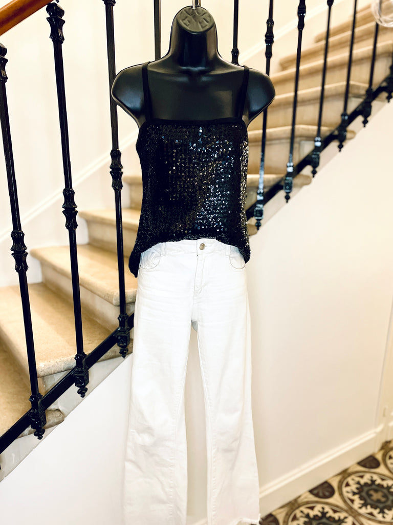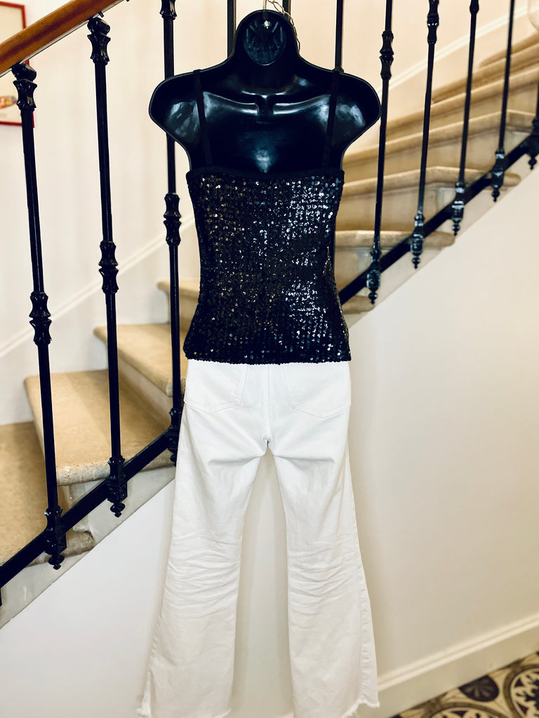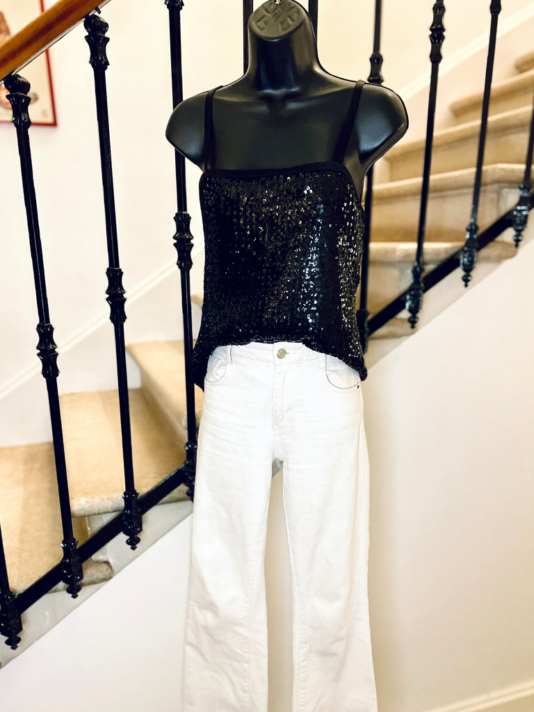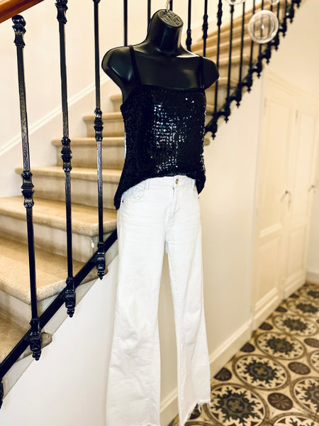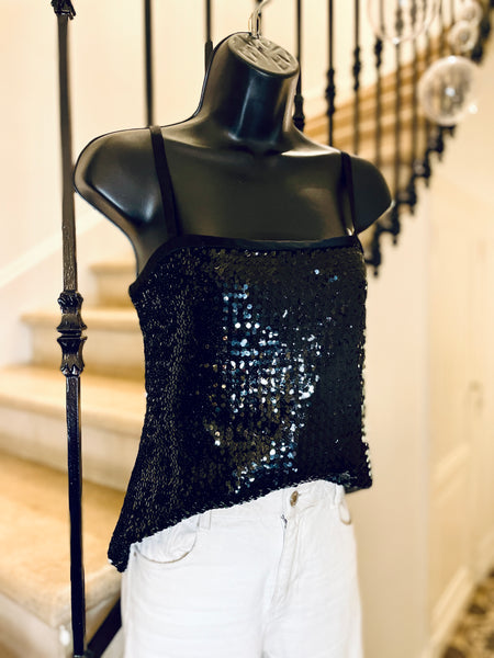 Top Ă bretelles fines en sequins bordĂ© de satin. Coupe droite, encolure droite avec dĂ©coupe lĂ©gĂšrement en pointe au niveau des bretelles. Fermeture latĂ©rale par zip masquĂ© et un petit crochet. DoublĂ©.Â