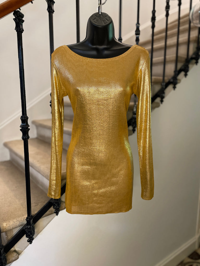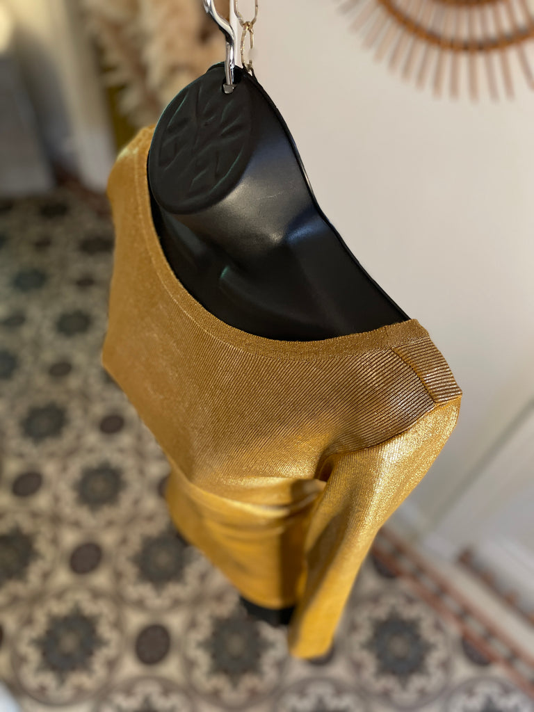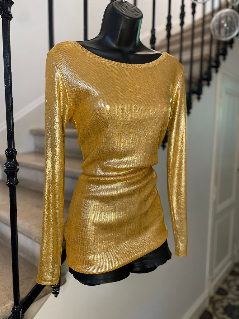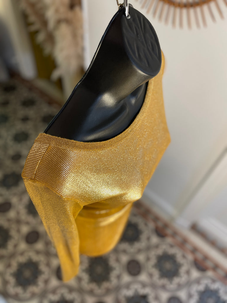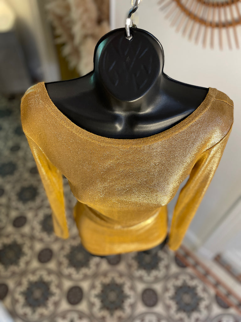 Top long ou mini robe en maille dorée cuivrée . Coupe ajustée, encolure dégagée sur l’avant et décolleté profond en arrondi dans le dos. Manches moulantes.