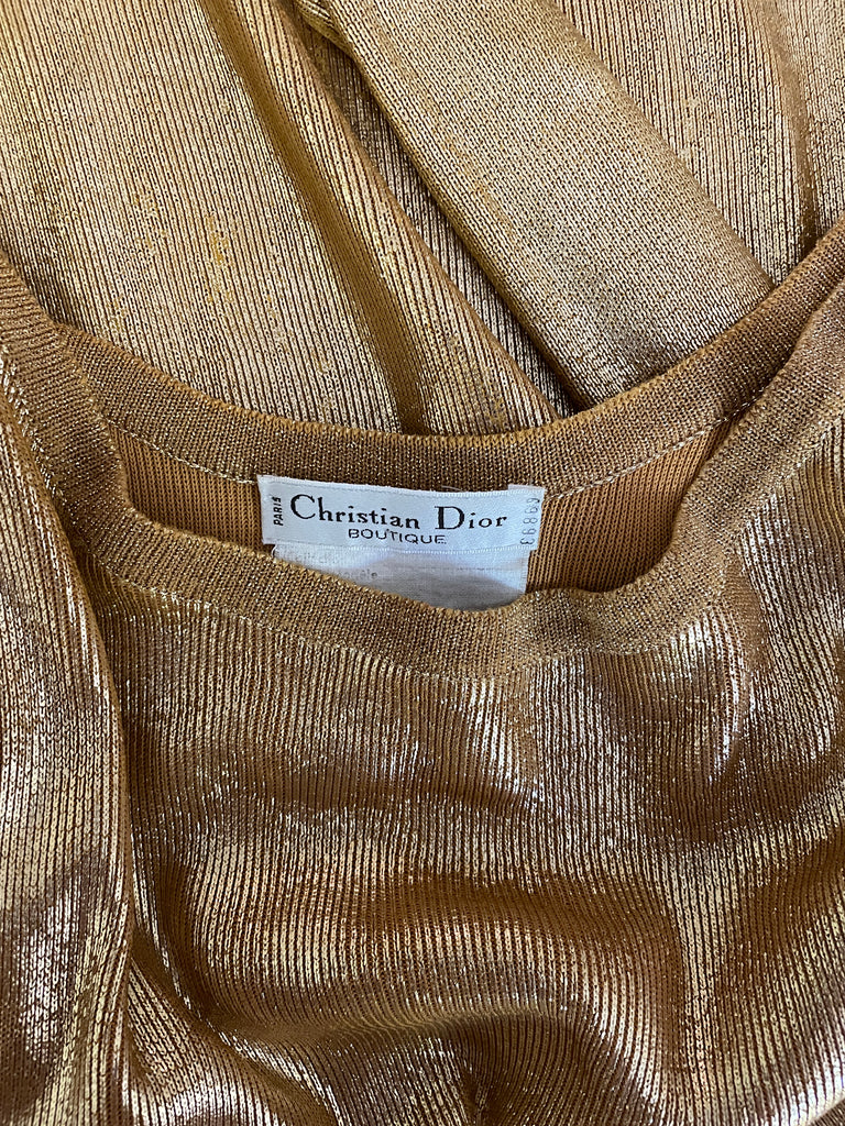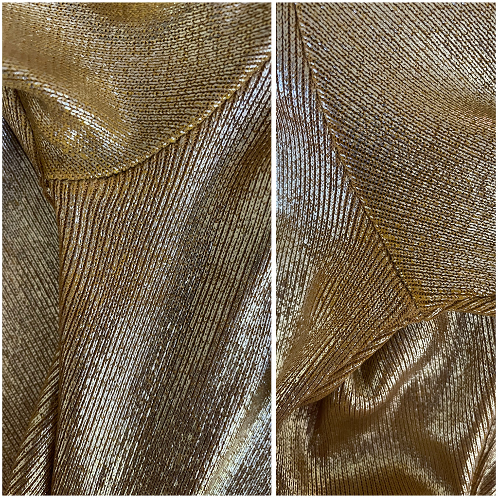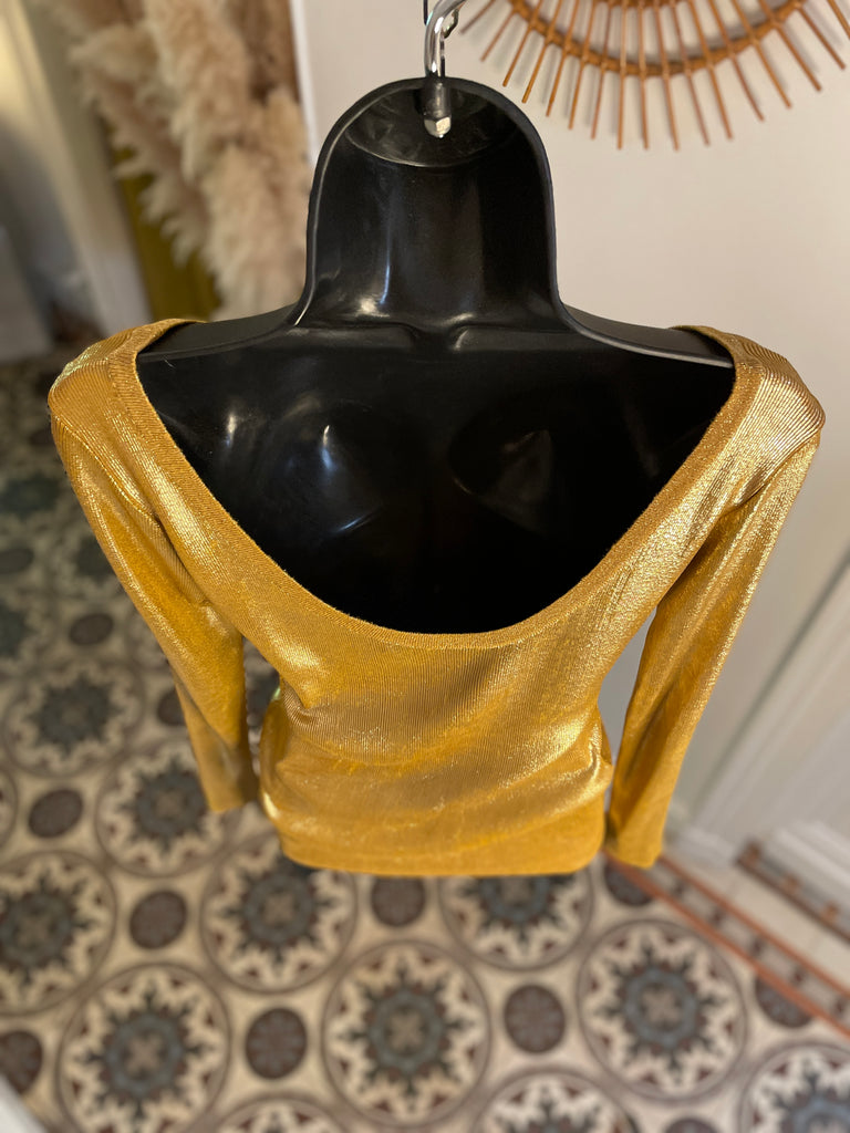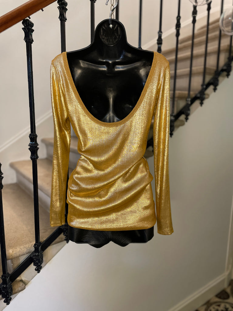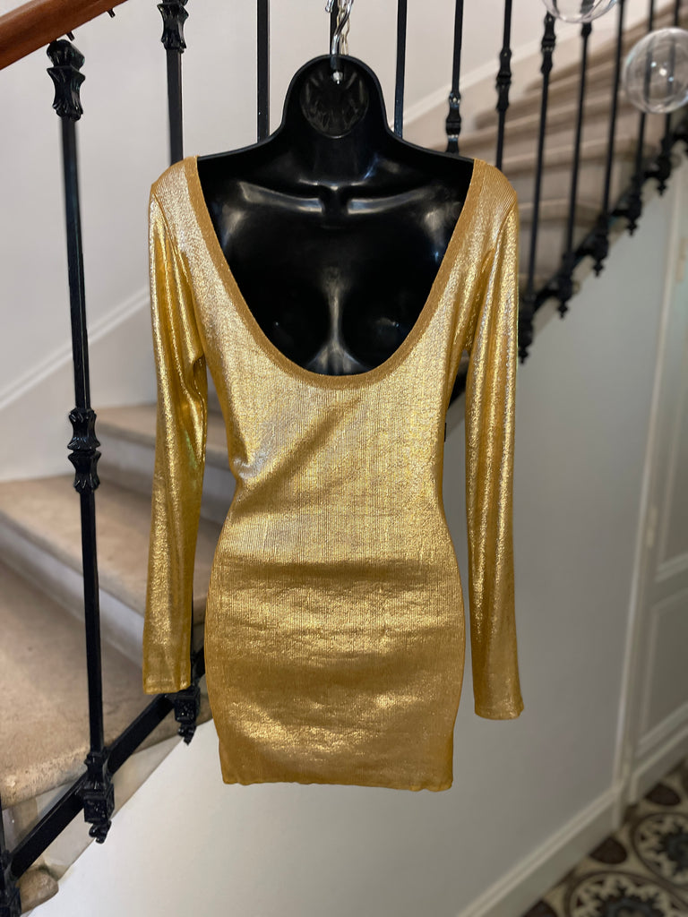 Top long ou mini robe en maille dorée cuivrée . Coupe ajustée, encolure dégagée sur l’avant et décolleté profond en arrondi dans le dos. Manches moulantes.