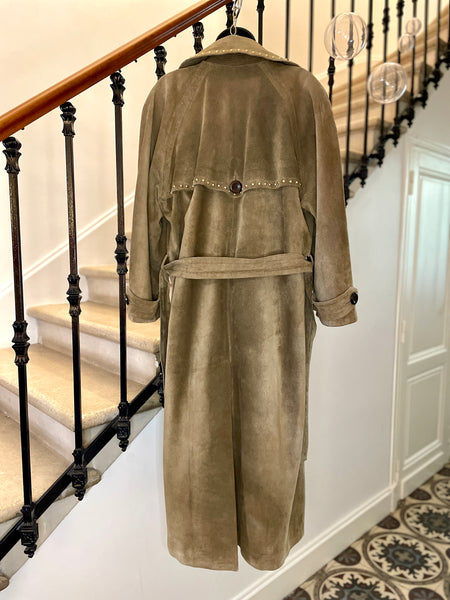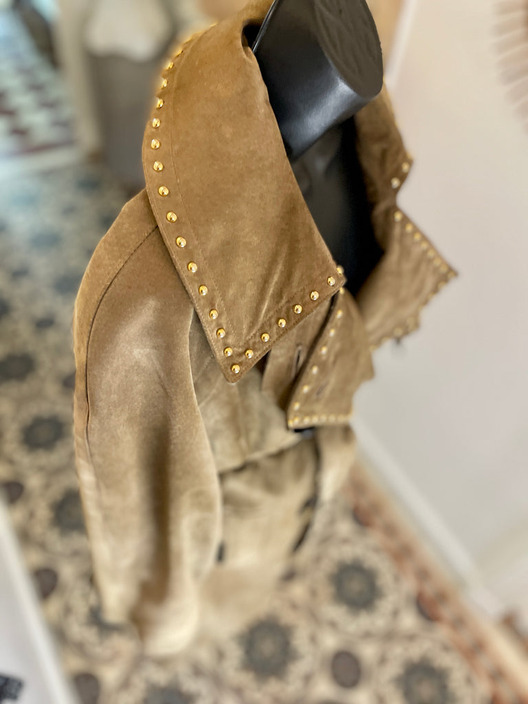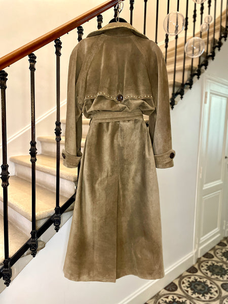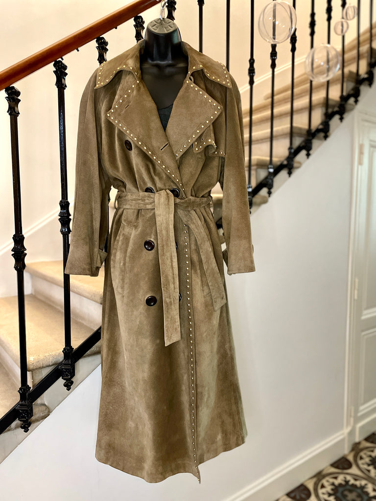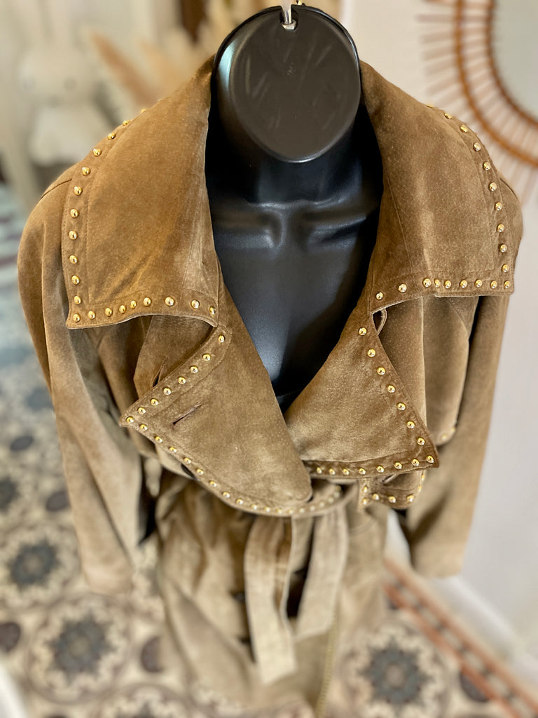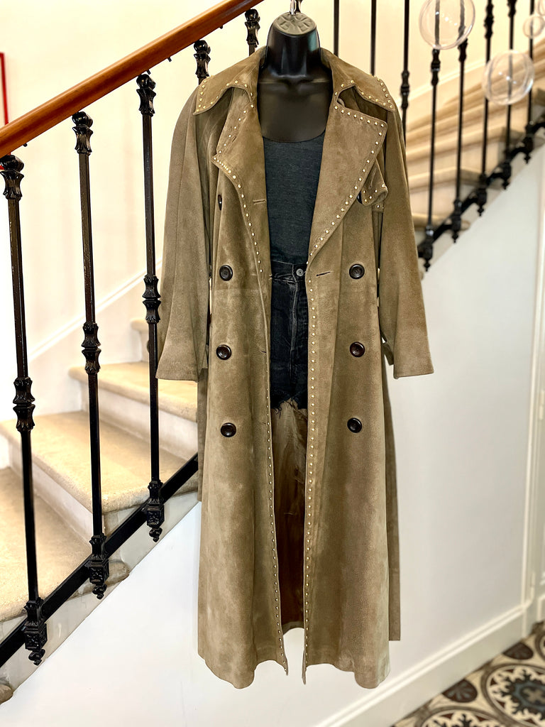 Trench en daim de couleur beige kaki (avec nuances liées à la matière) clous dorés. Coupe oversize avec manches raglan légèrement épaulées, terminées par une patte de serrrage avec bouton. Large col avec patte de protection de gorge, larges revers et bavolet à l'avant gauche. Fermeture par double boutonnage avec boutons façon bois et 2 poches passepoilées. Bavolet fixe dans le dos avec 1 bouton et grande fente d'aisance. Doublé.