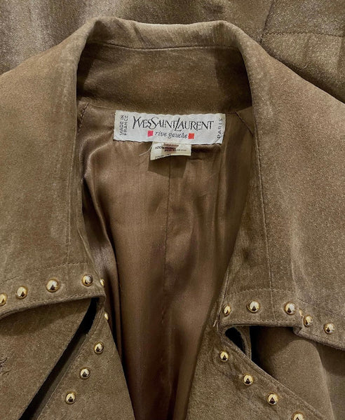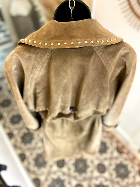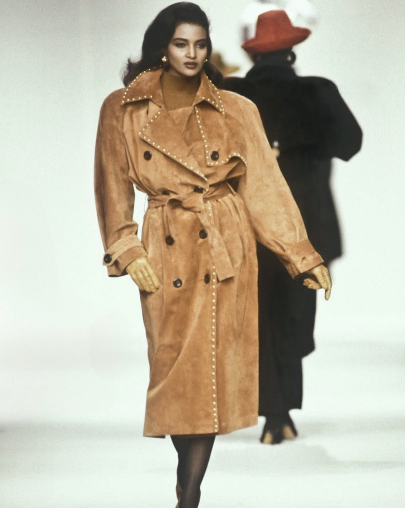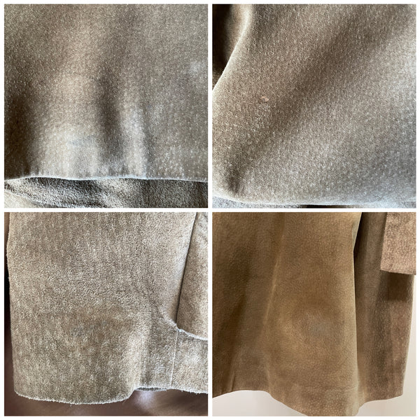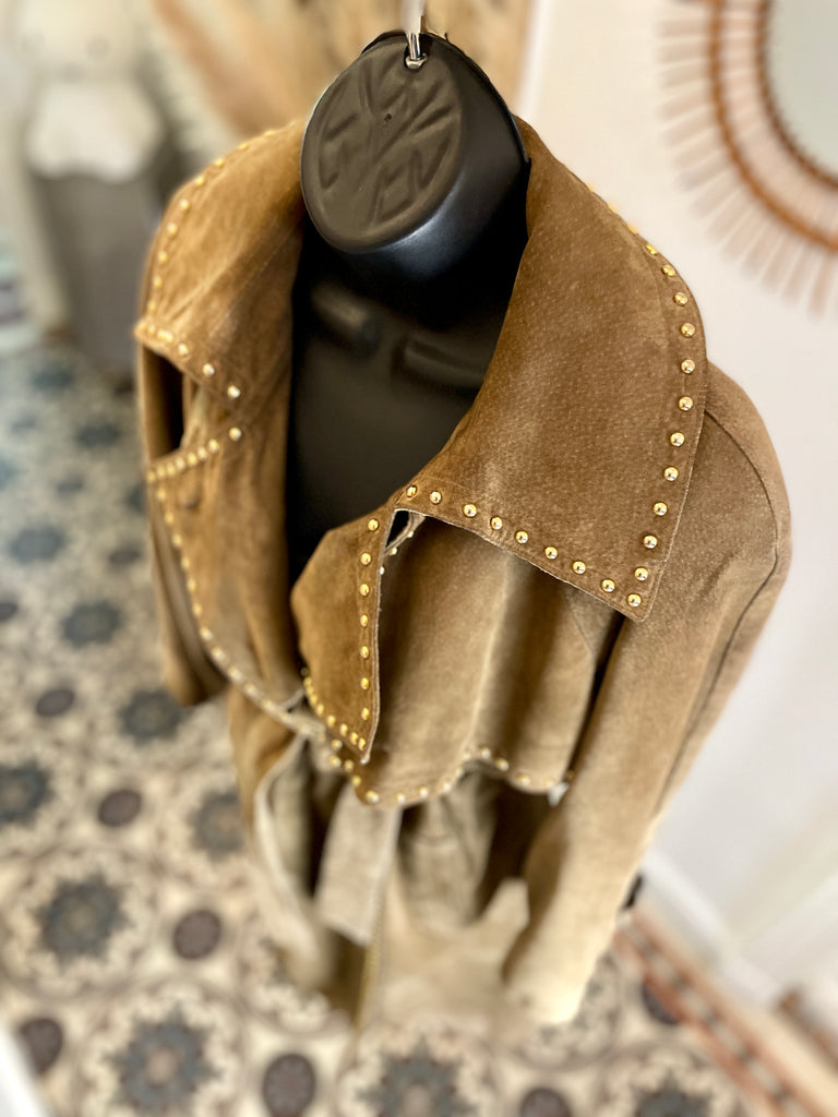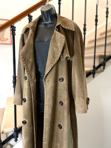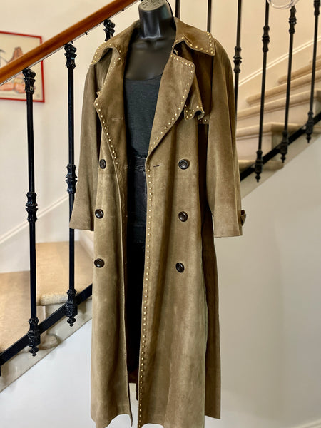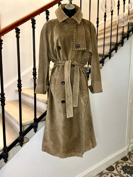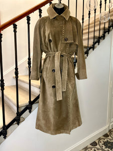 Trench en daim de couleur beige kaki (avec nuances liées à la matière) clous dorés. Coupe oversize avec manches raglan légèrement épaulées, terminées par une patte de serrrage avec bouton. Large col avec patte de protection de gorge, larges revers et bavolet à l'avant gauche. Fermeture par double boutonnage avec boutons façon bois et 2 poches passepoilées. Bavolet fixe dans le dos avec 1 bouton et grande fente d'aisance. Doublé.