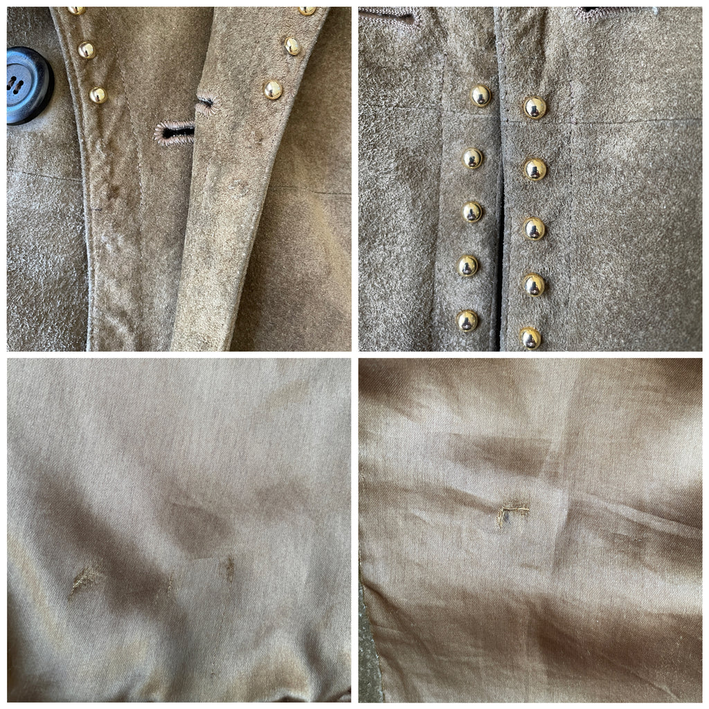 État : Très bon. A noter quelques imperfections sur la doublure et sur l’extérieur, la plus prononcée est située en bas du dos, proche de la fente. Un bouton a été remplacé mais invisible sous le bavolet, 4 clous sont manquants au niveau de la ceinture (invisible). Et pour finir l’épaulette gauche est moins épaisse. (Cf photos).