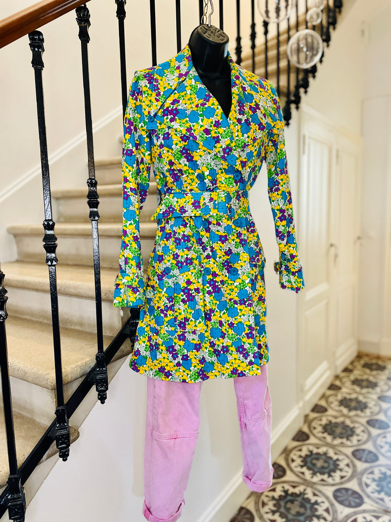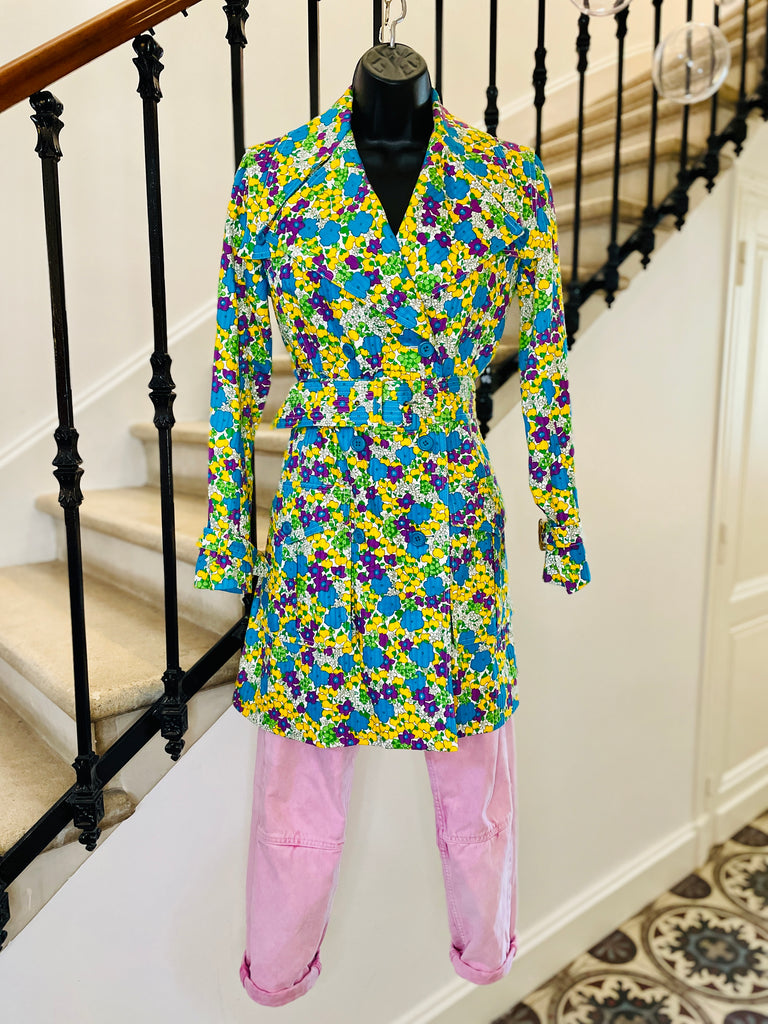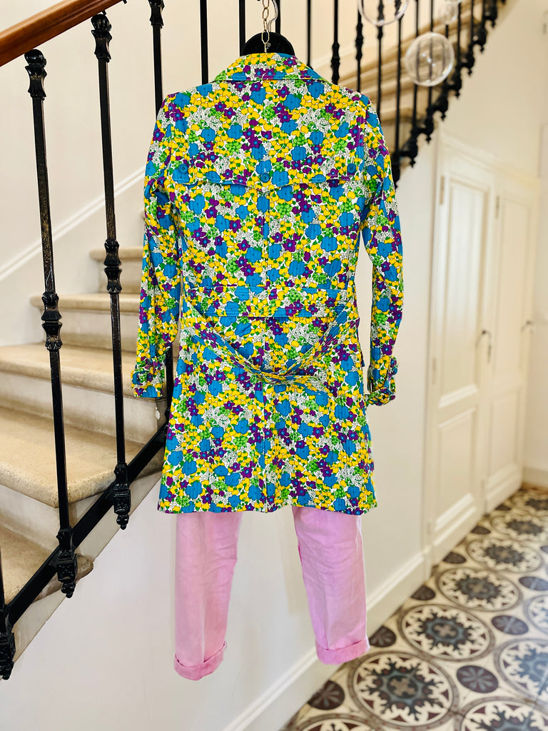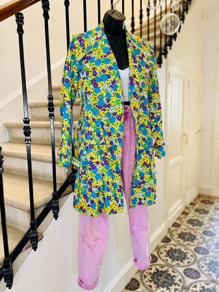 Trench en coton matelassé à l’imprimé floral dans des couleurs turquoise, violet, jaune et vert sur fond blanc. Coupe ajustée, grand col avec maxi pointes et revers. Bas volets à l’avant avec 2 boutons turquoises et dans le dos avec 3 boutons. Fermeture par double boutonnage et ceinture avec boucle recouverte et œillets. Poignets avec galons amovibles avec boucle recouverte et œillets. 2 grandes poches plaquées avec rabat et bouton. 1 soufflet au milieu du dos et 1 fente au bas. Doublé.