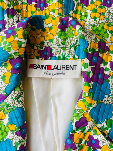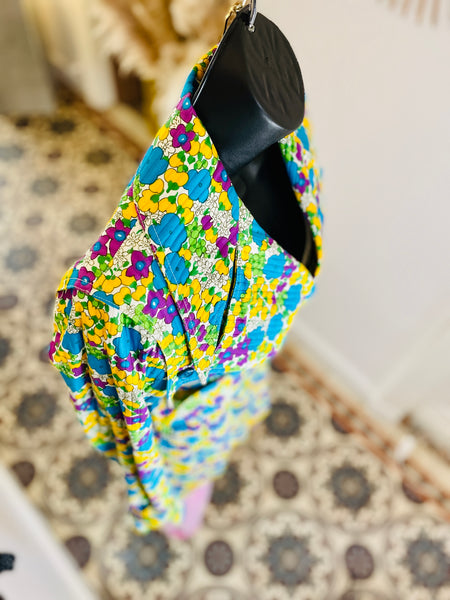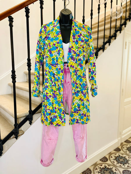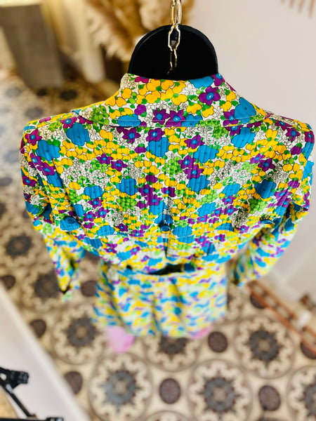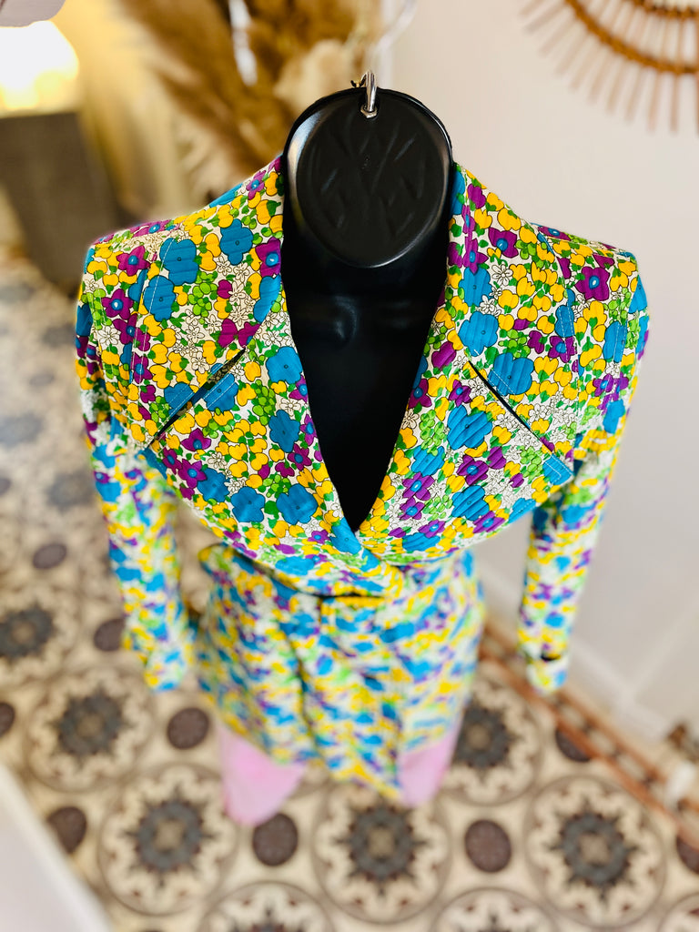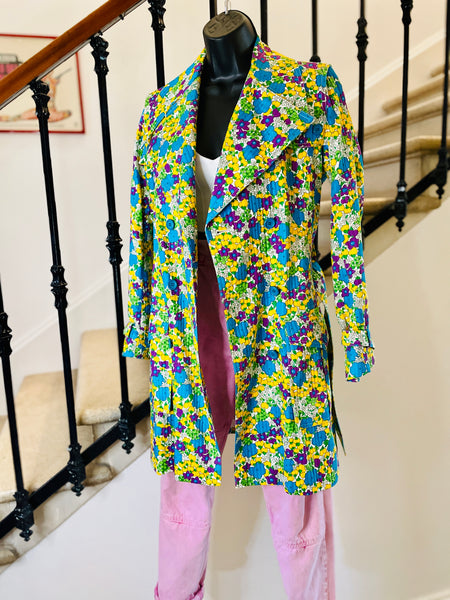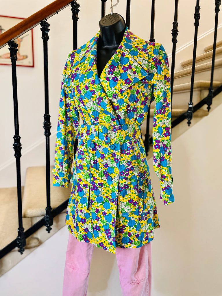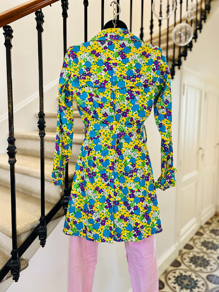 Trench en coton matelassé à l’imprimé floral dans des couleurs turquoise, violet, jaune et vert sur fond blanc. Coupe ajustée, grand col avec maxi pointes et revers. Bas volets à l’avant avec 2 boutons turquoises et dans le dos avec 3 boutons. Fermeture par double boutonnage et ceinture avec boucle recouverte et œillets. Poignets avec galons amovibles avec boucle recouverte et œillets. 2 grandes poches plaquées avec rabat et bouton. 1 soufflet au milieu du dos et 1 fente au bas. Doublé.