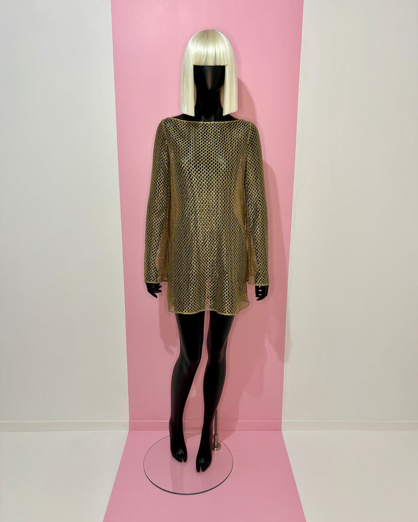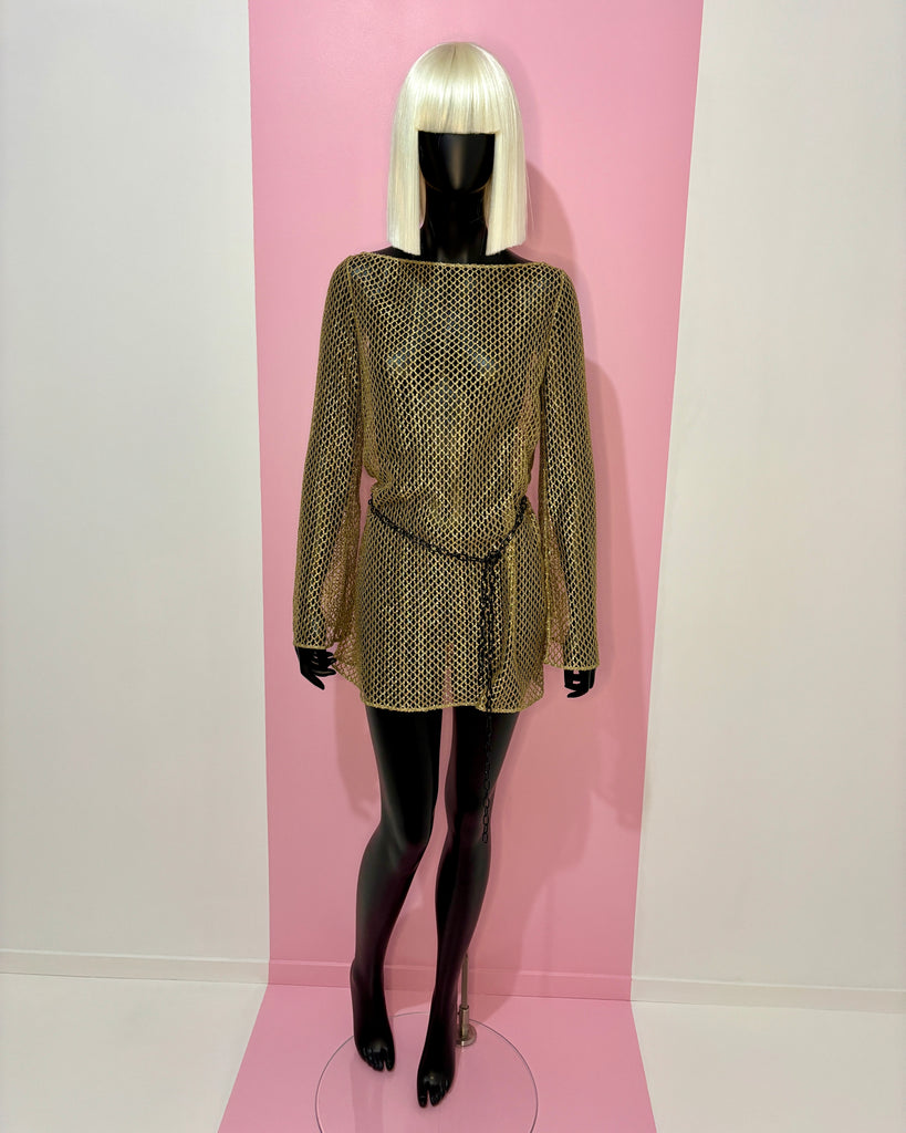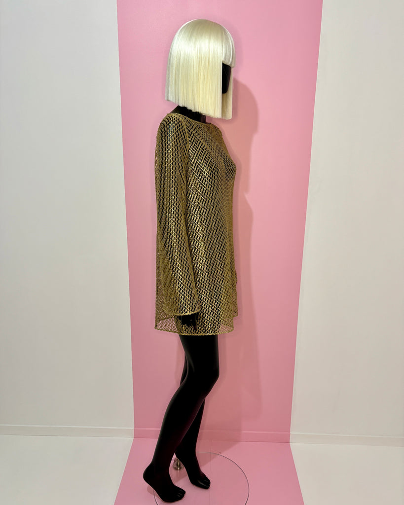 Tunique ou Mini robe en maille ajourée métallisée de couleur dorée. Encolure bateau, coupe droite et manches évasées.