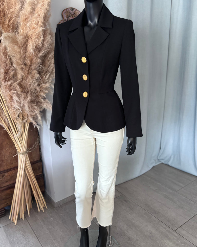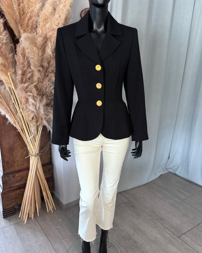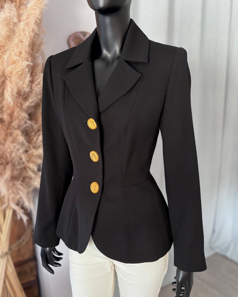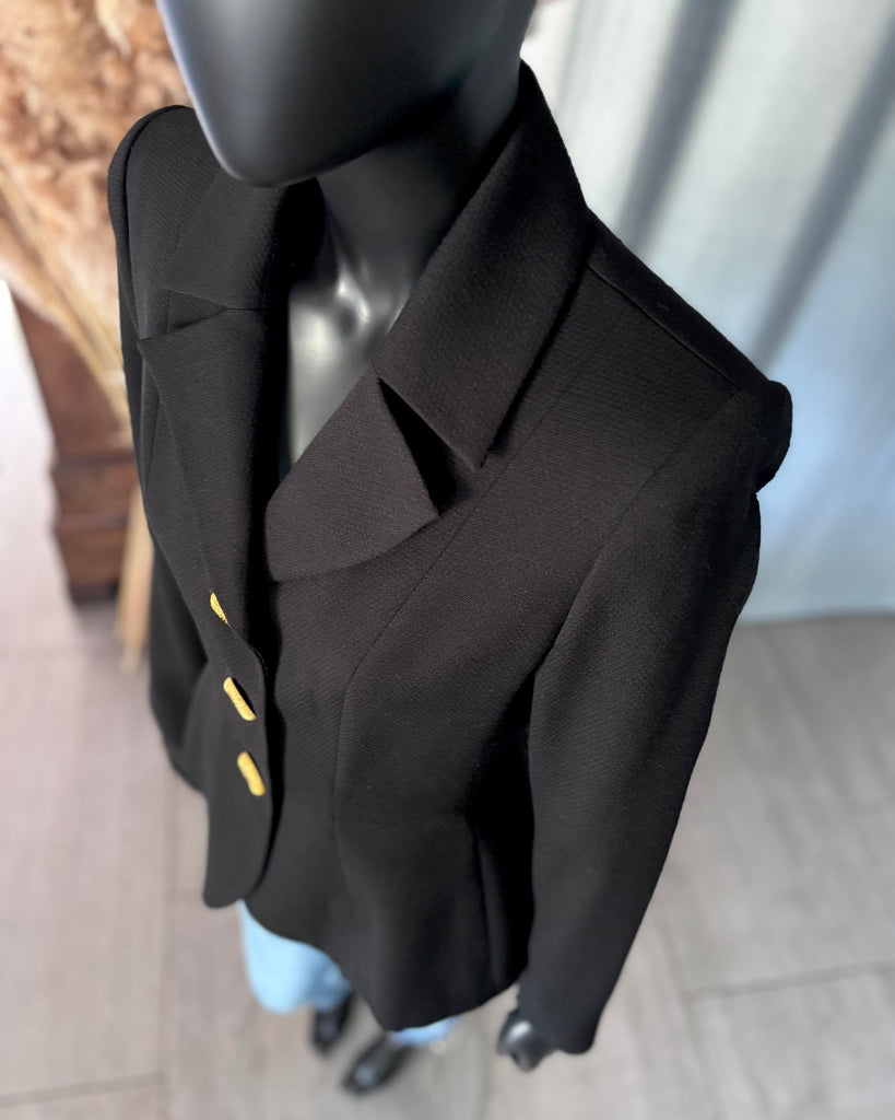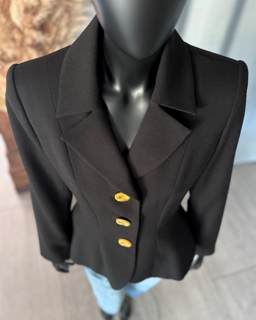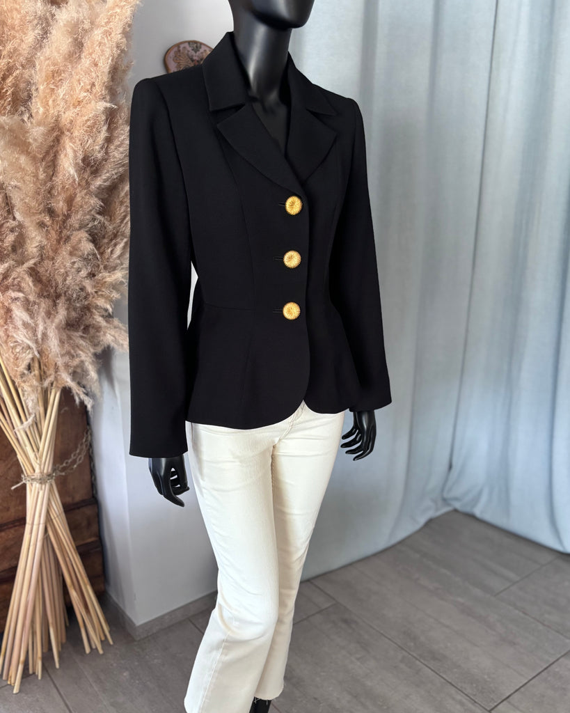 Veste en laine fine au tissage texturé de couleur noire. Coupe ajustée avec épaulettes et taille marquée et fermeture par 3 gros boutons dorés. Col et revers à la découpe graphique, basques à la découpe en arrondi avec fente à l’arrière. Doublée.