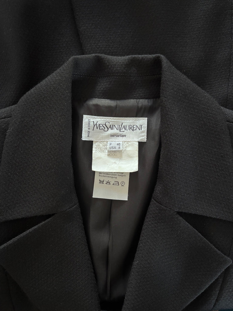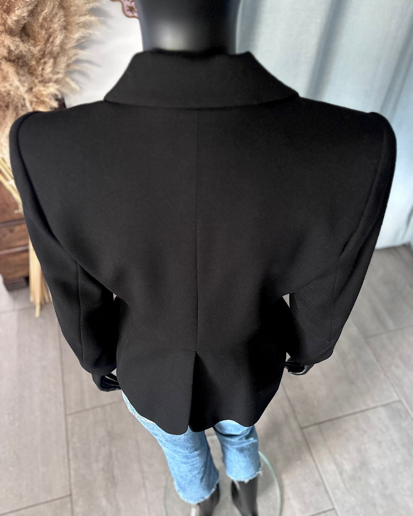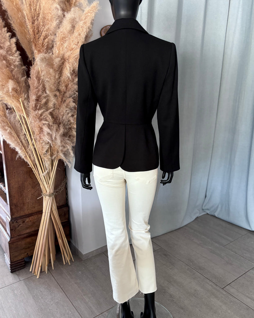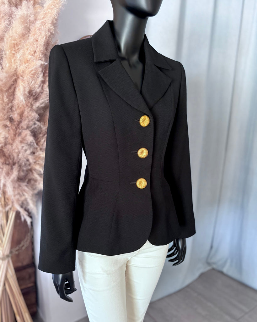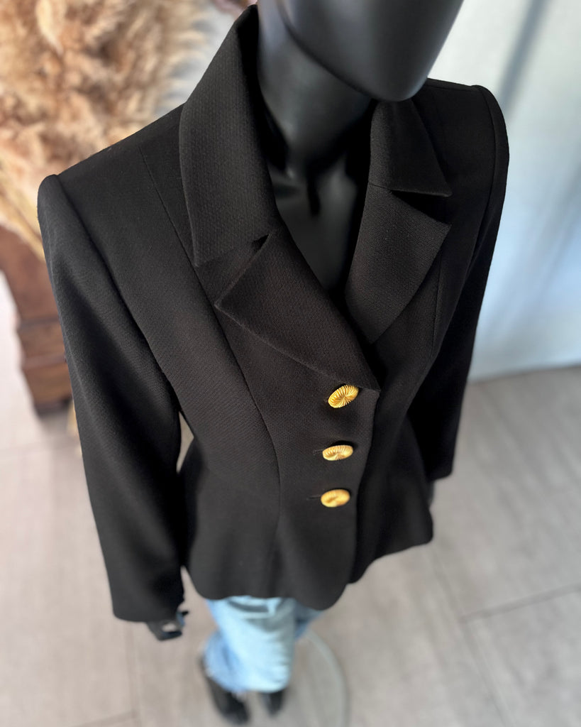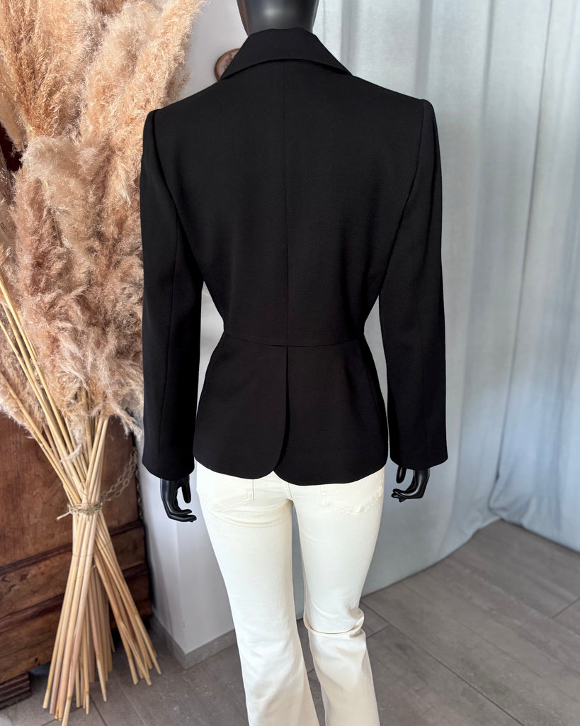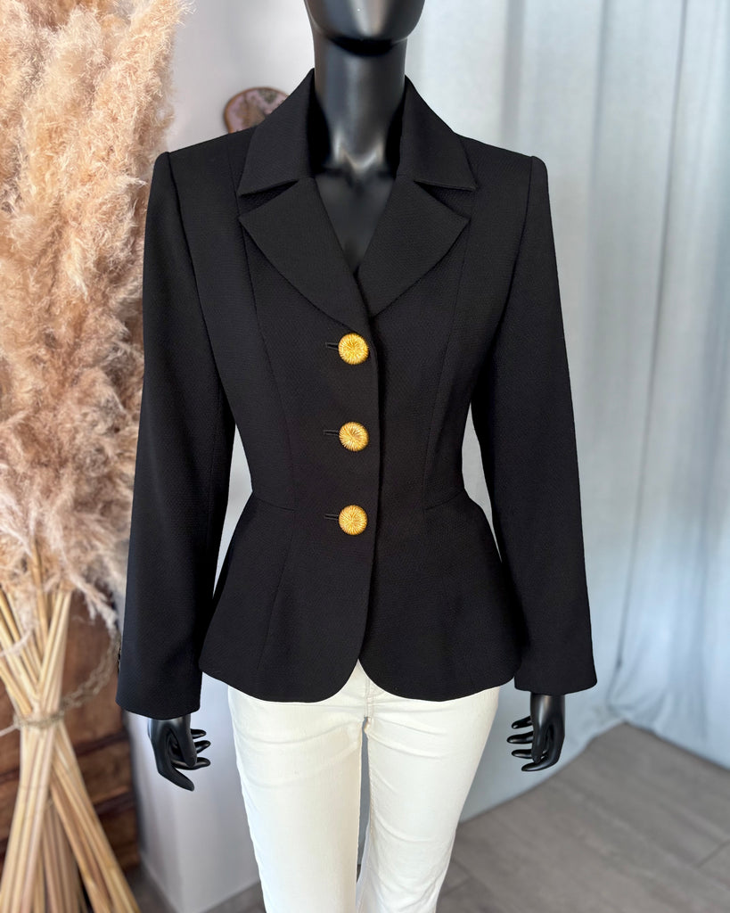 Veste en laine fine au tissage texturé de couleur noire. Coupe ajustée avec épaulettes et taille marquée et fermeture par 3 gros boutons dorés. Col et revers à la découpe graphique, basques à la découpe en arrondi avec fente à l’arrière. Doublée.