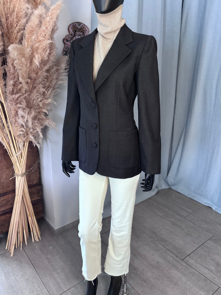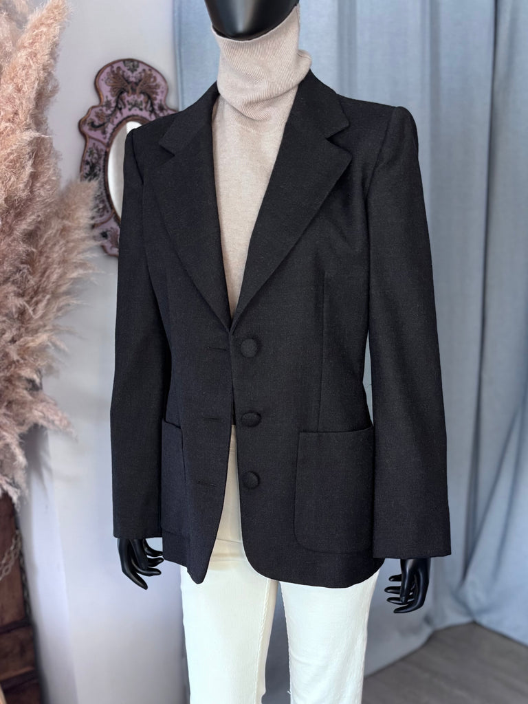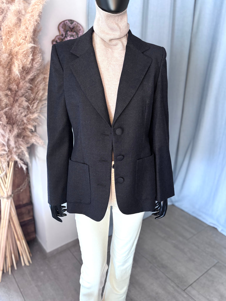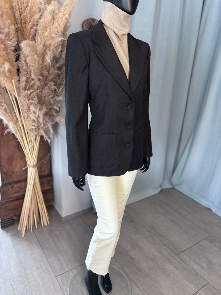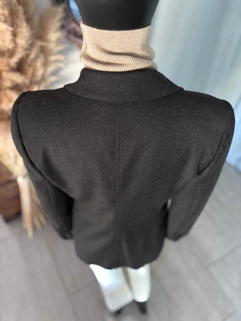 Veste en laine de couleur gris anthracite. Coupe ajustée avec épaulettes, col plat et larges revers et fermeture par 3 boutons recouverts. 2 grandes poches plaquées et poignet terminés par 3 boutons décoratifs. Doublure partielle sur le haut du dos et les manches.