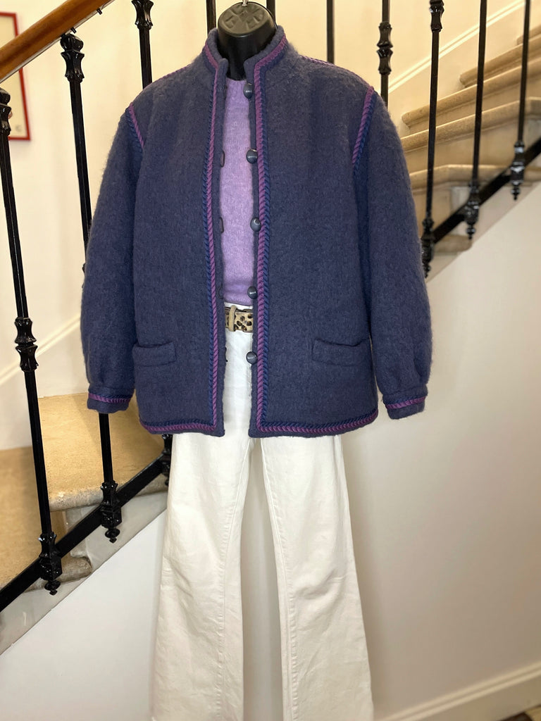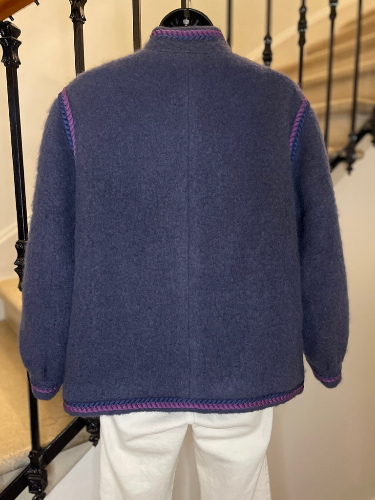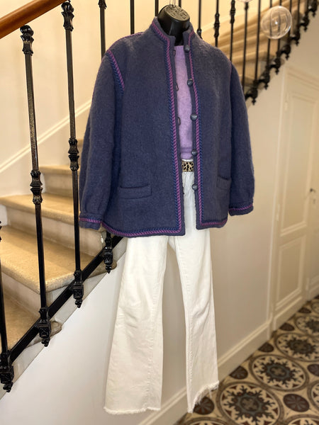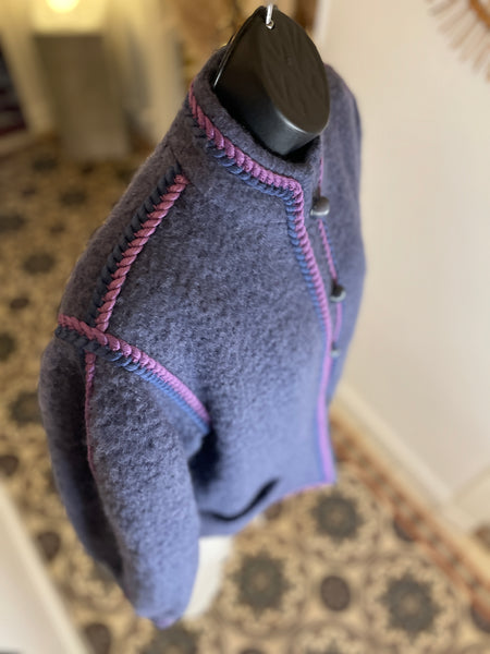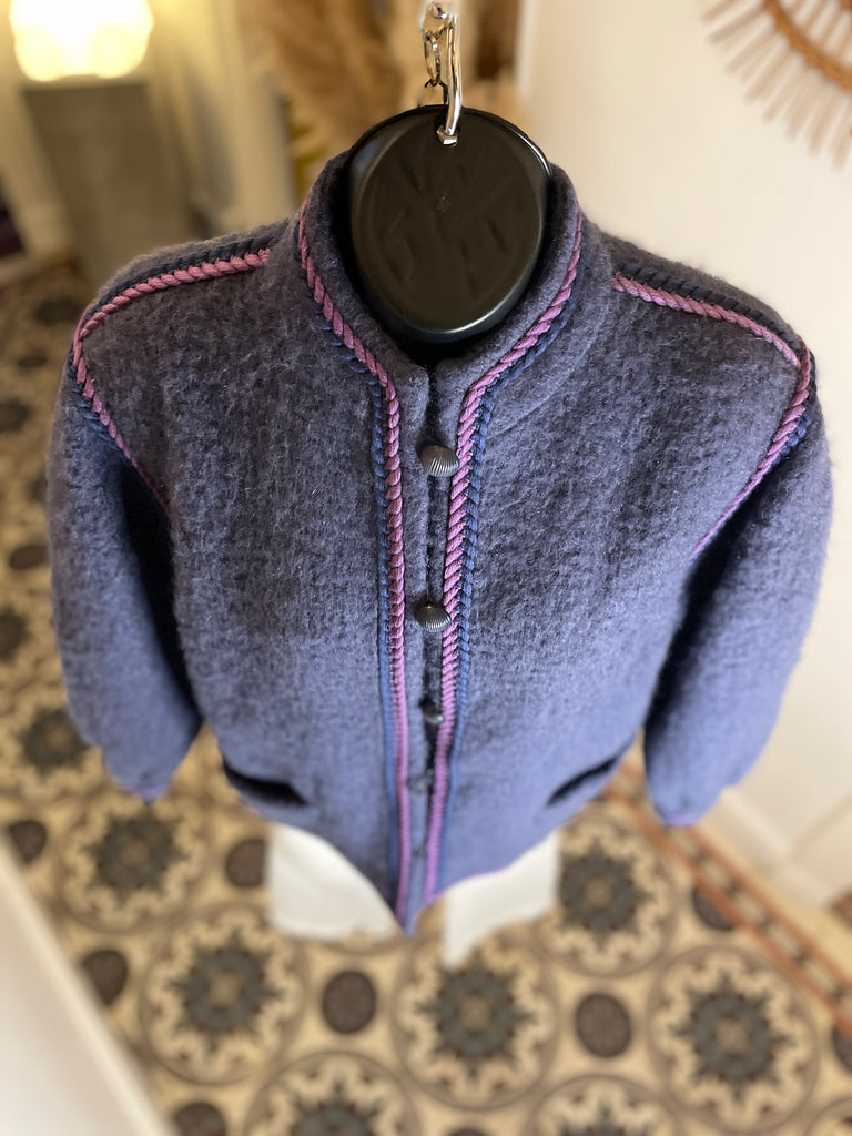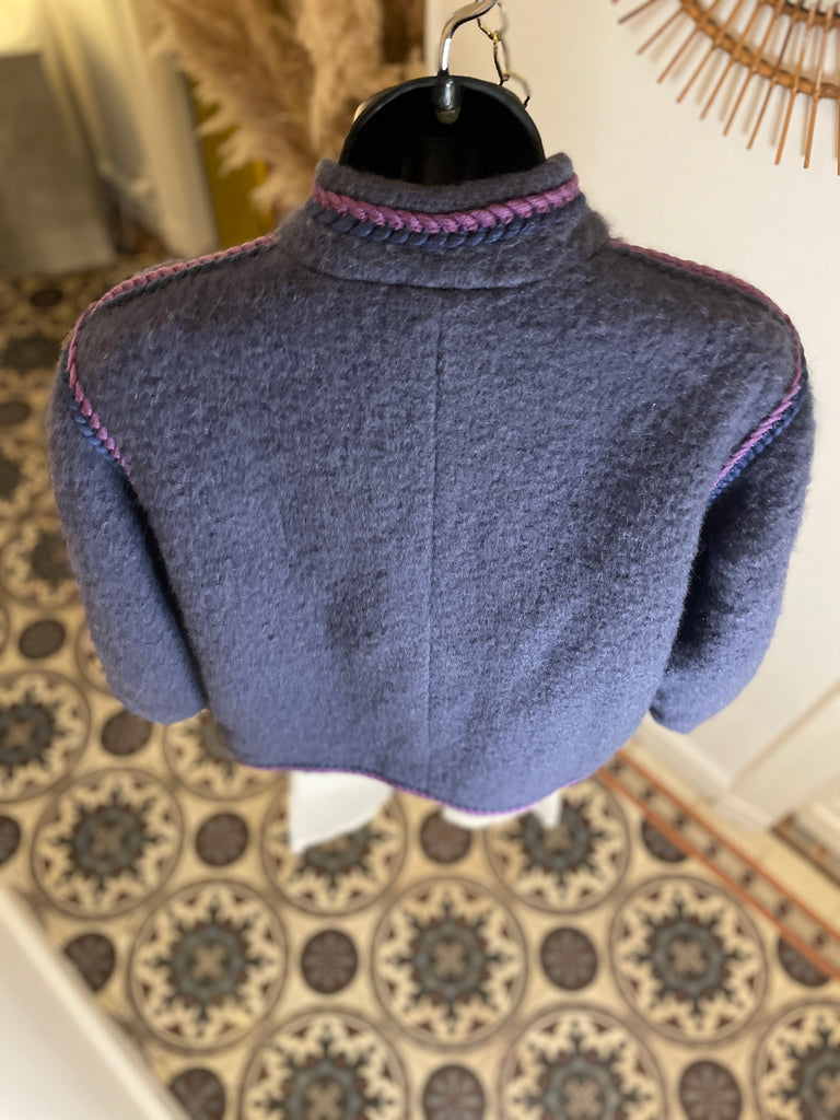 Veste en laine bouillie de couleur mauve tirant sur le gris et gansée d’un double cordon tressé de couleurs violet et rose. Coupe droite légèrement oversize avec épaules basses et manches bouffantes. Petit col montant et fermeture par boutons ronds et texturés de couleur grise. 2 poches plaquées. Doublée.