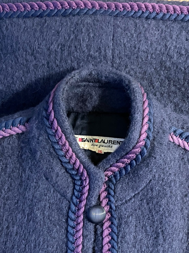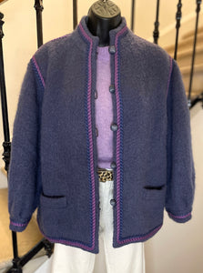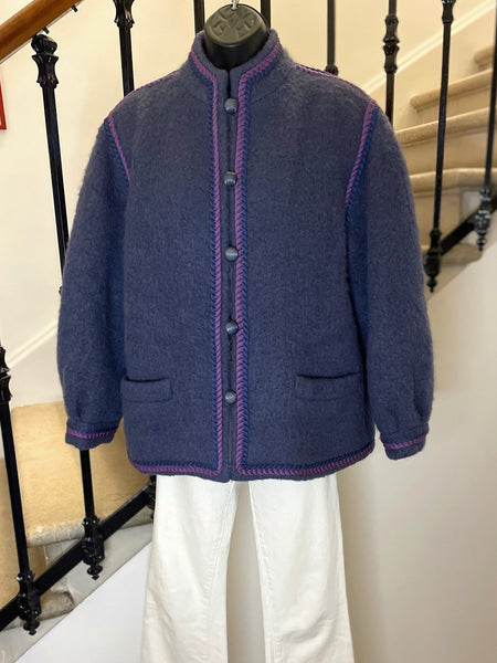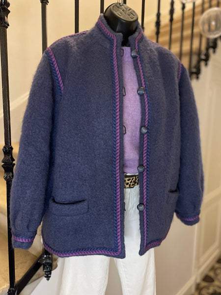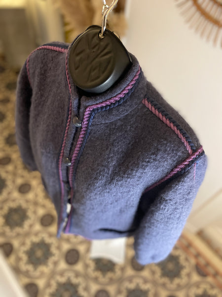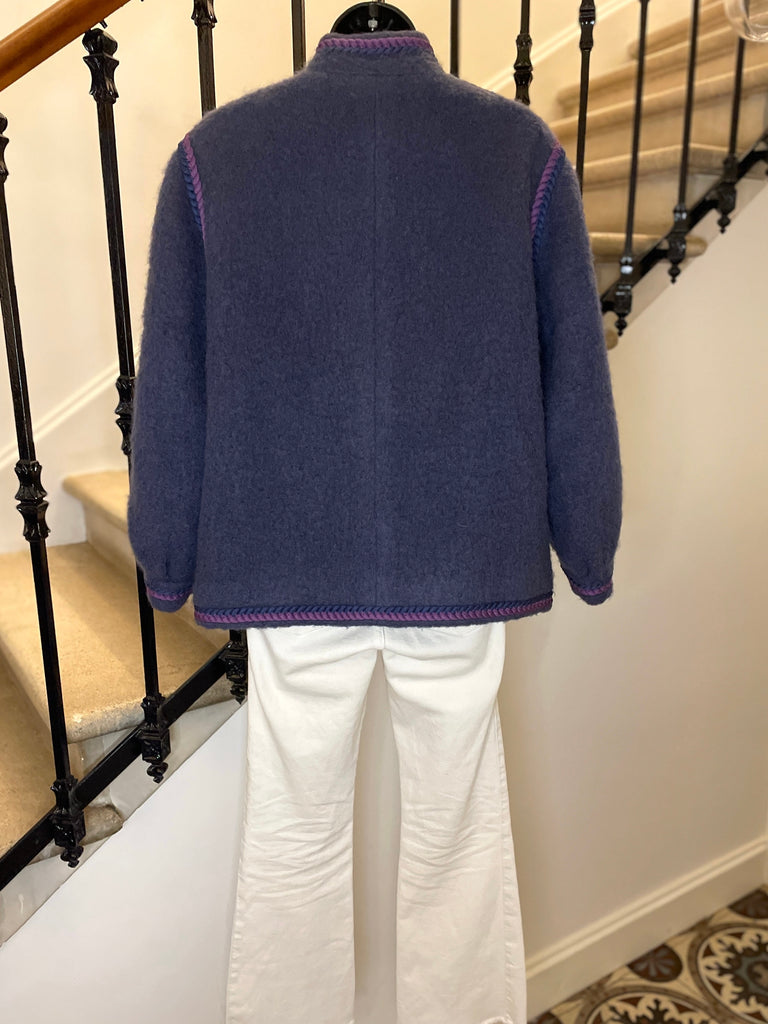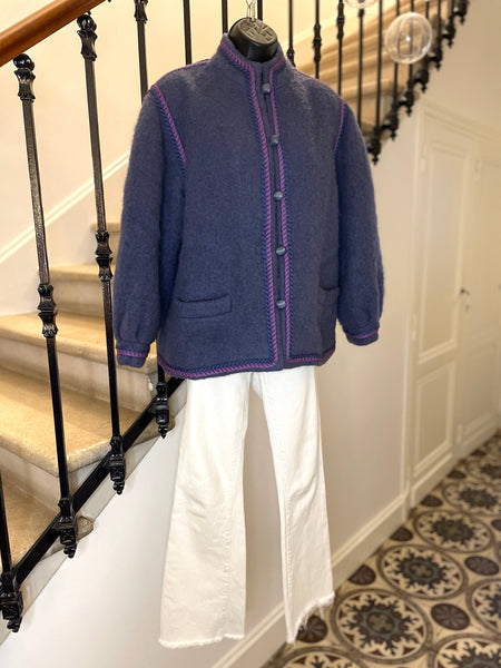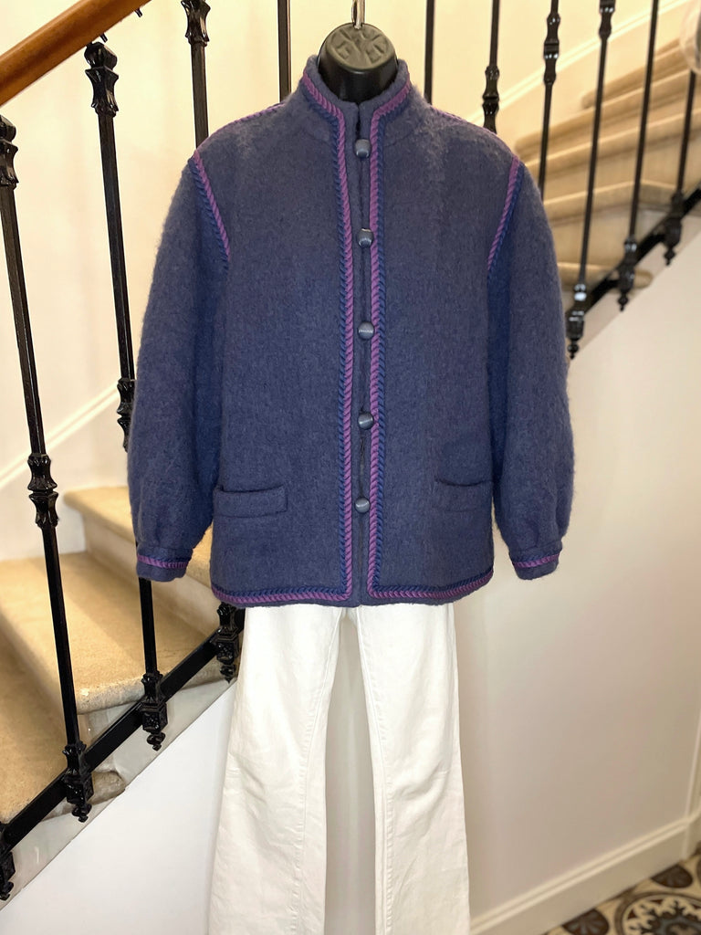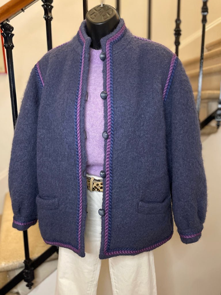 Veste en laine bouillie de couleur mauve tirant sur le gris et gansée d’un double cordon tressé de couleurs violet et rose. Coupe droite légèrement oversize avec épaules basses et manches bouffantes. Petit col montant et fermeture par boutons ronds et texturés de couleur grise. 2 poches plaquées. Doublée.