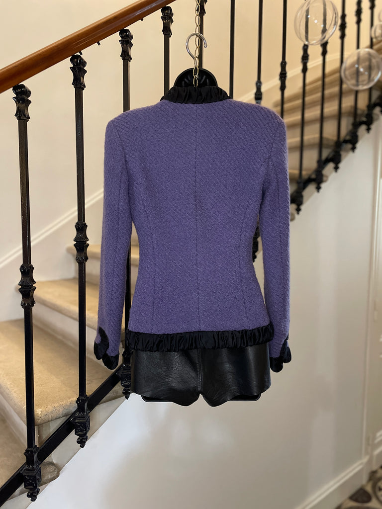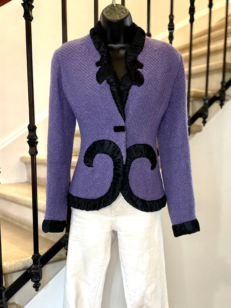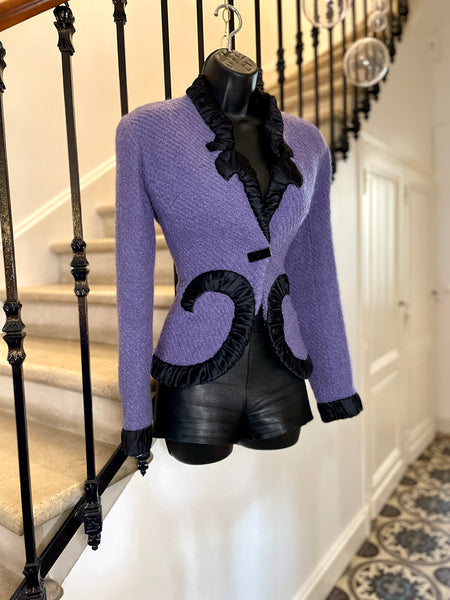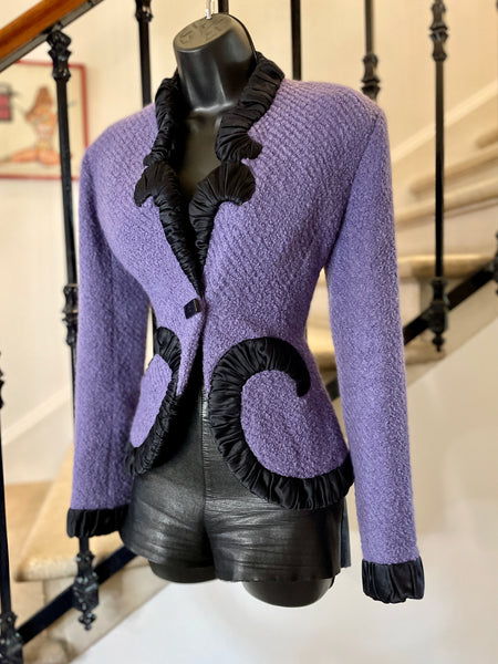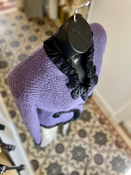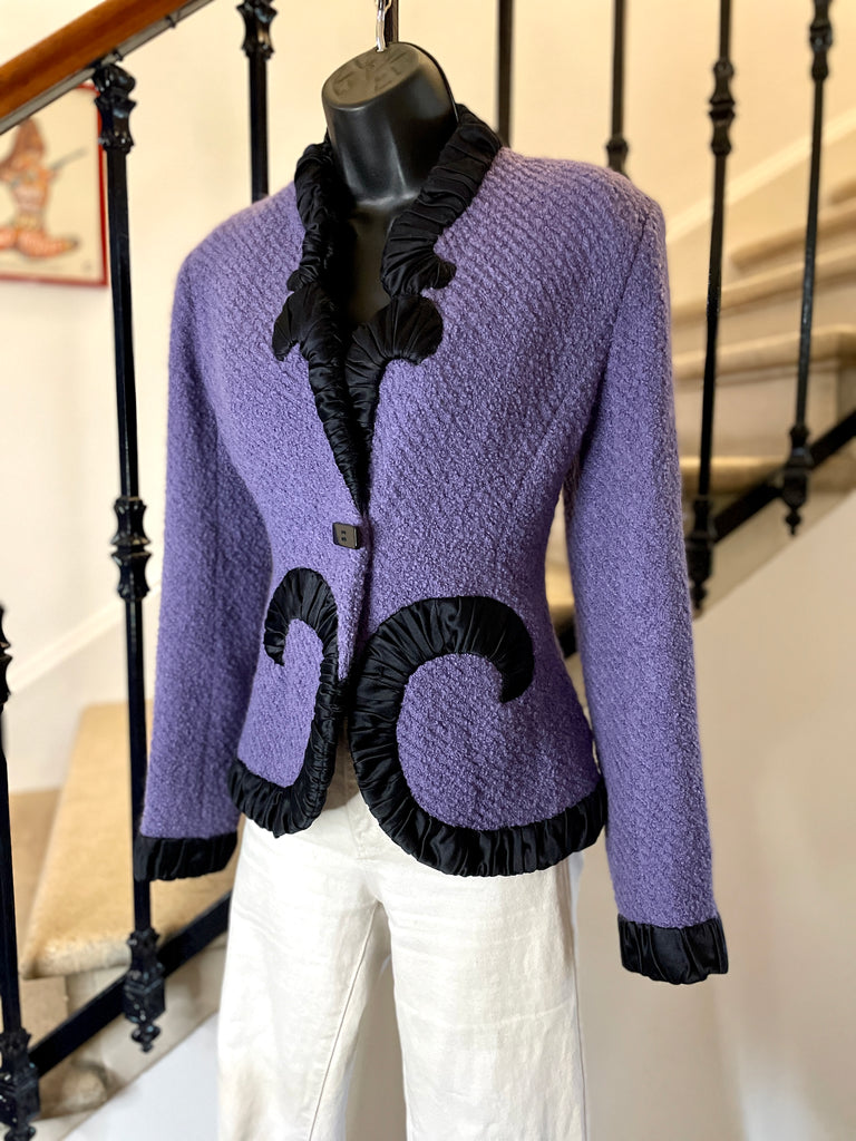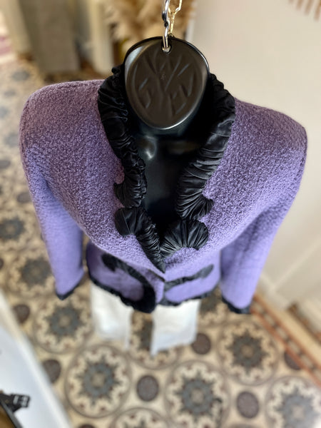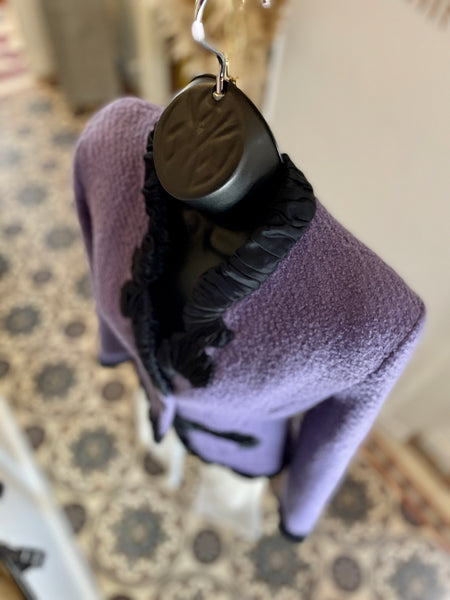 Veste en laine bouclée au tissage côtelé de couleur lilas, bordée d’un galon plissé de couleur noire aux formes d’arabesques. Coupe ajustée et taille appuyée par les arabesques. Décolleté prononcé et fermeture par 1 bouton rectangulaire noir et un petit crochet, qui permet de la garder fermée sur les hanches. Très légèrement épaulée. Doublure en soie noire.
