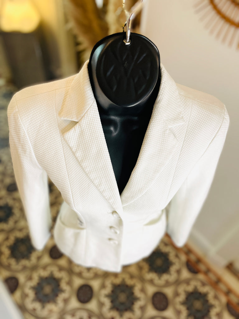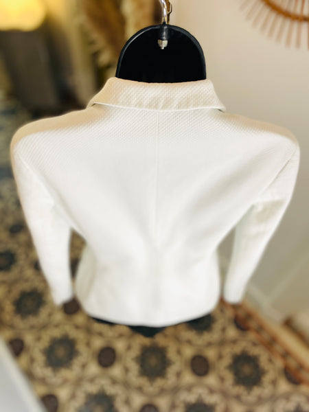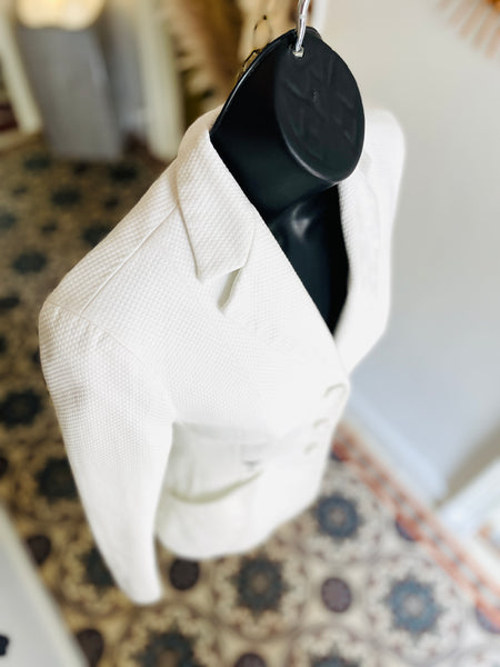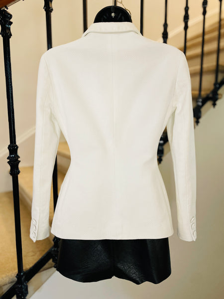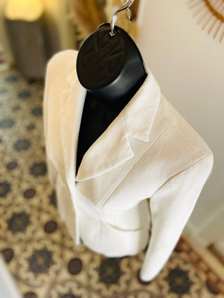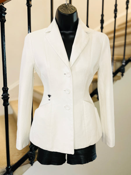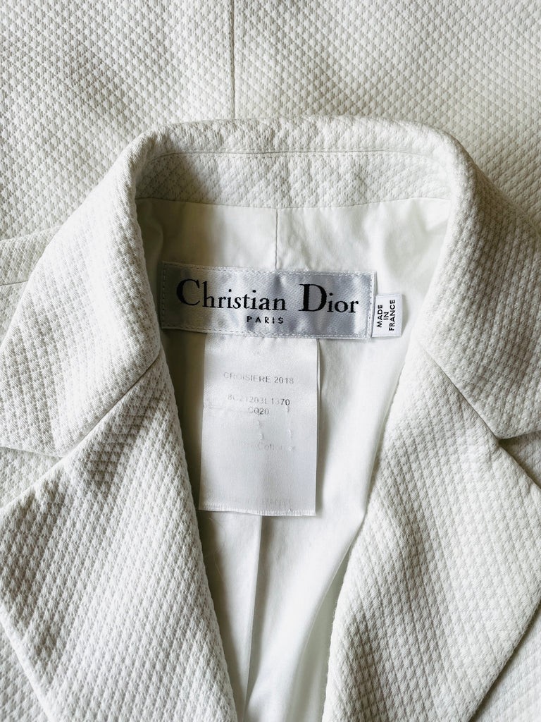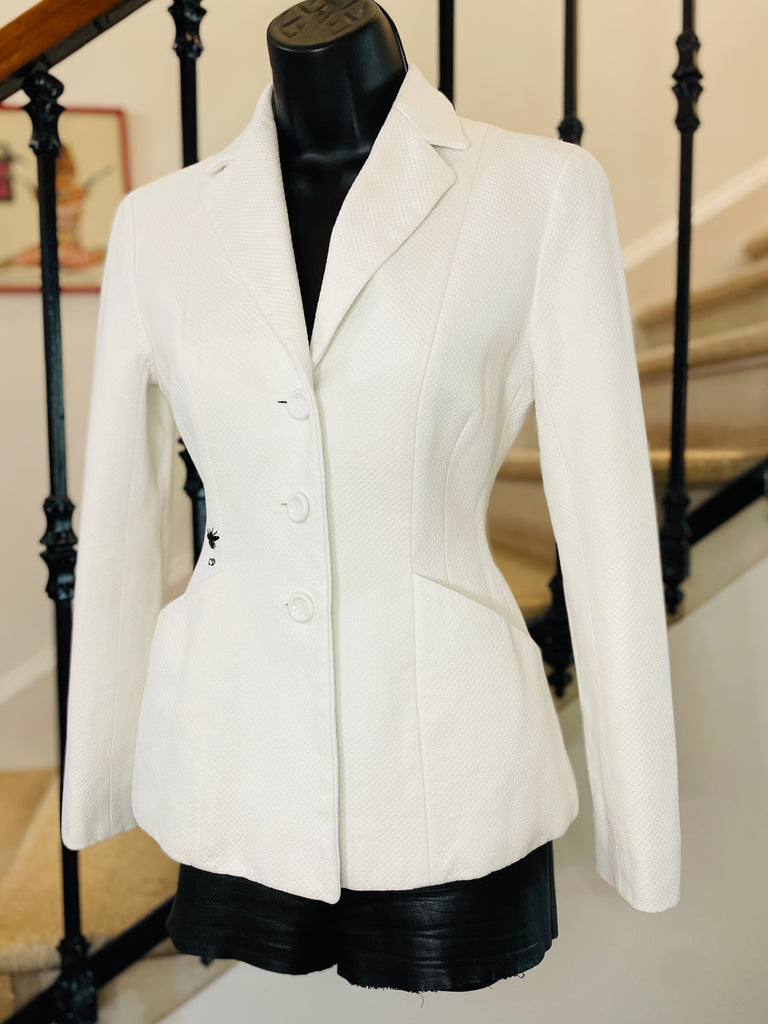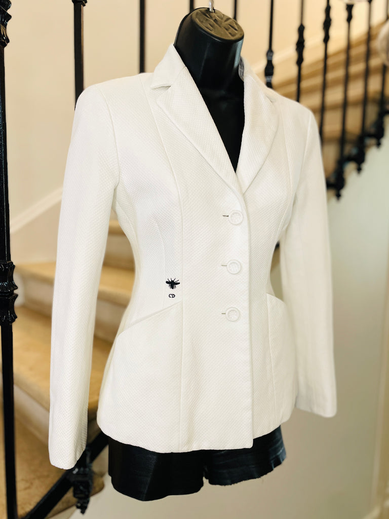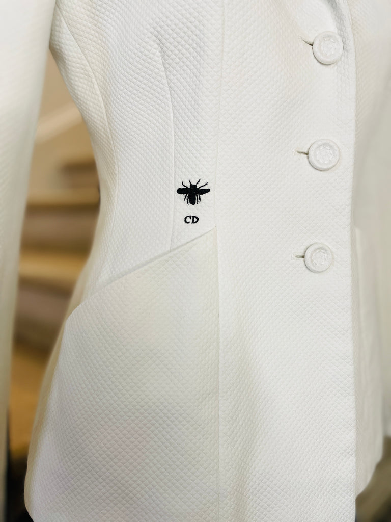 Veste en piquĂ© de coton de couleur blanche avec broderie abeille et monogramme CD de couleur noire. Coupe bar, taille ajustĂ©e et hanches soulignĂ©es par 2 grandes poches plaquĂ©es avec dĂ©coupe en biais, pas dâĂ©paulettes. Fermeture par 3 boutons recouverts emblĂ©matiques de la maison et poignets terminĂ©s par 3 boutons dĂ©coratifs. Doublure coton.Â