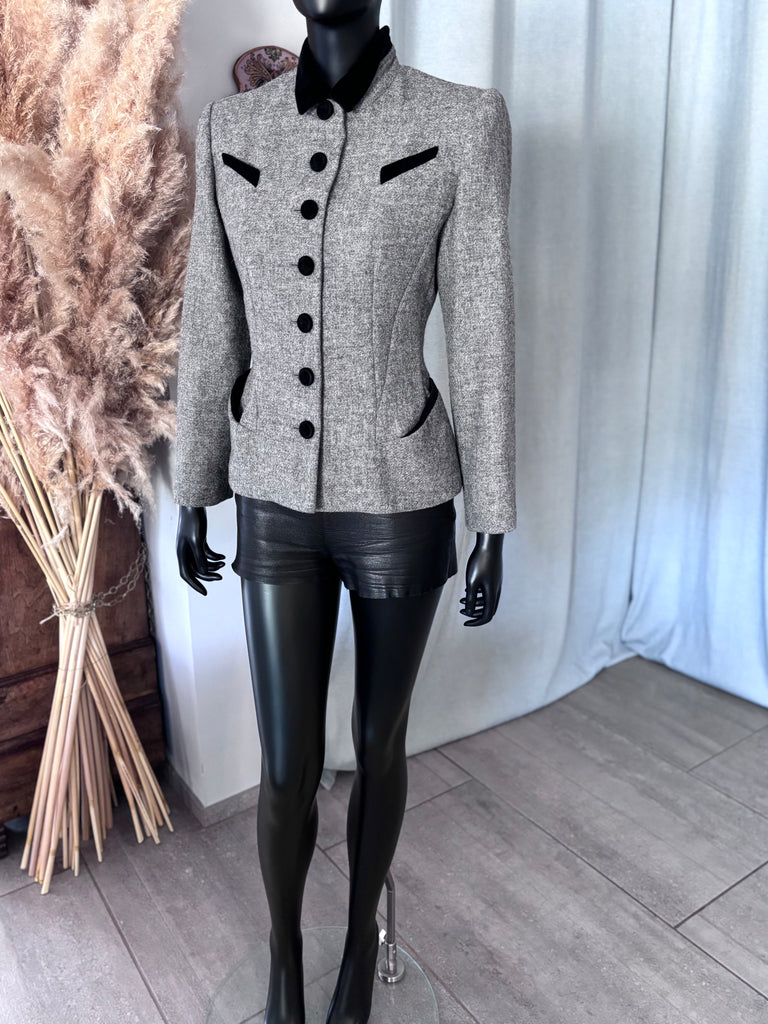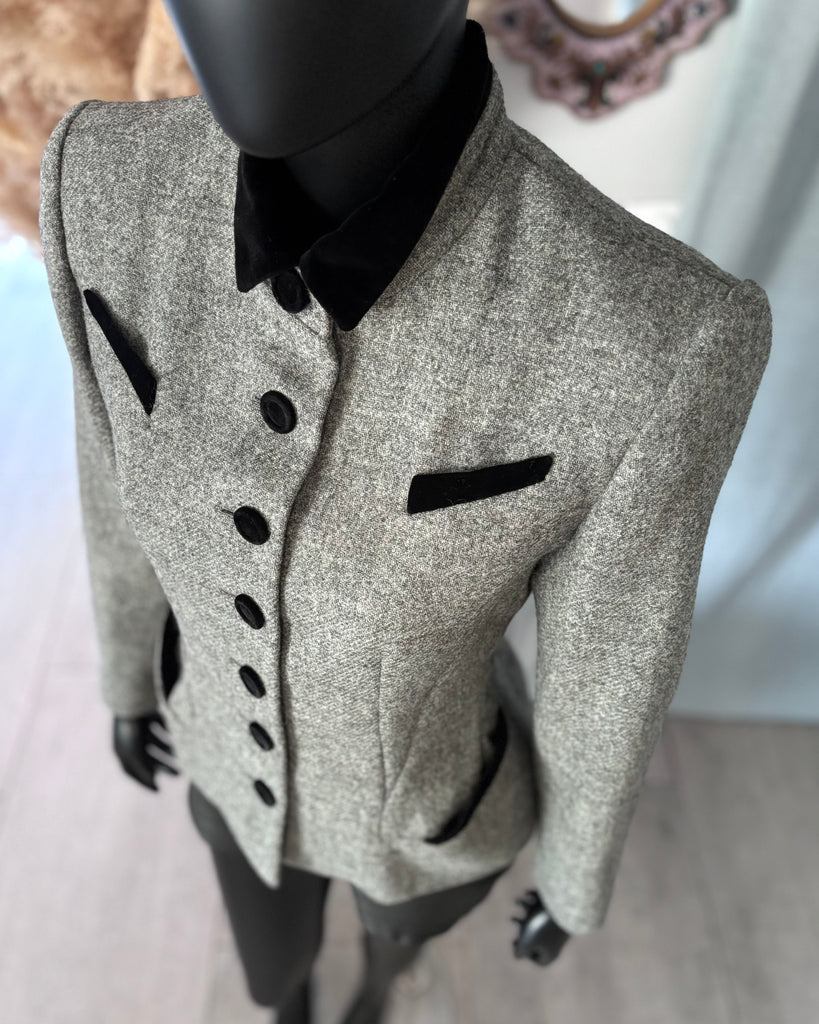Veste en laine de couleur grise légèrement chinée avec du blanc et détails en velours noir. Coupe ajustée avec épaulettes, petit col montant à la découpe structurée et fermeture par boutons recouvert de velours. 2 pochettes en biais passepoilées de velours et 2 sublimes poches qui soulignent les hanches aussi passepilées de velours. 2 boutons décoratifs au dos. Doublée.
