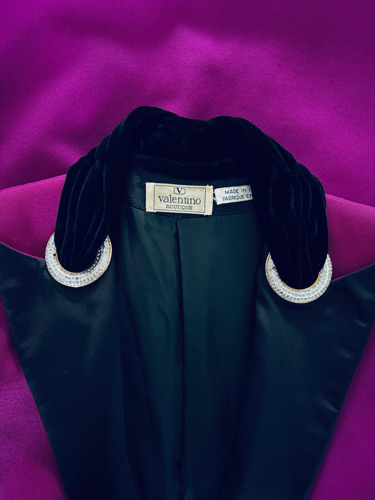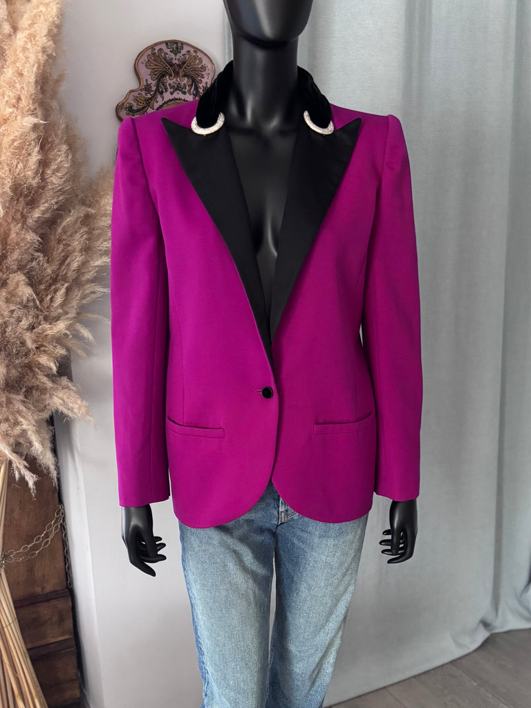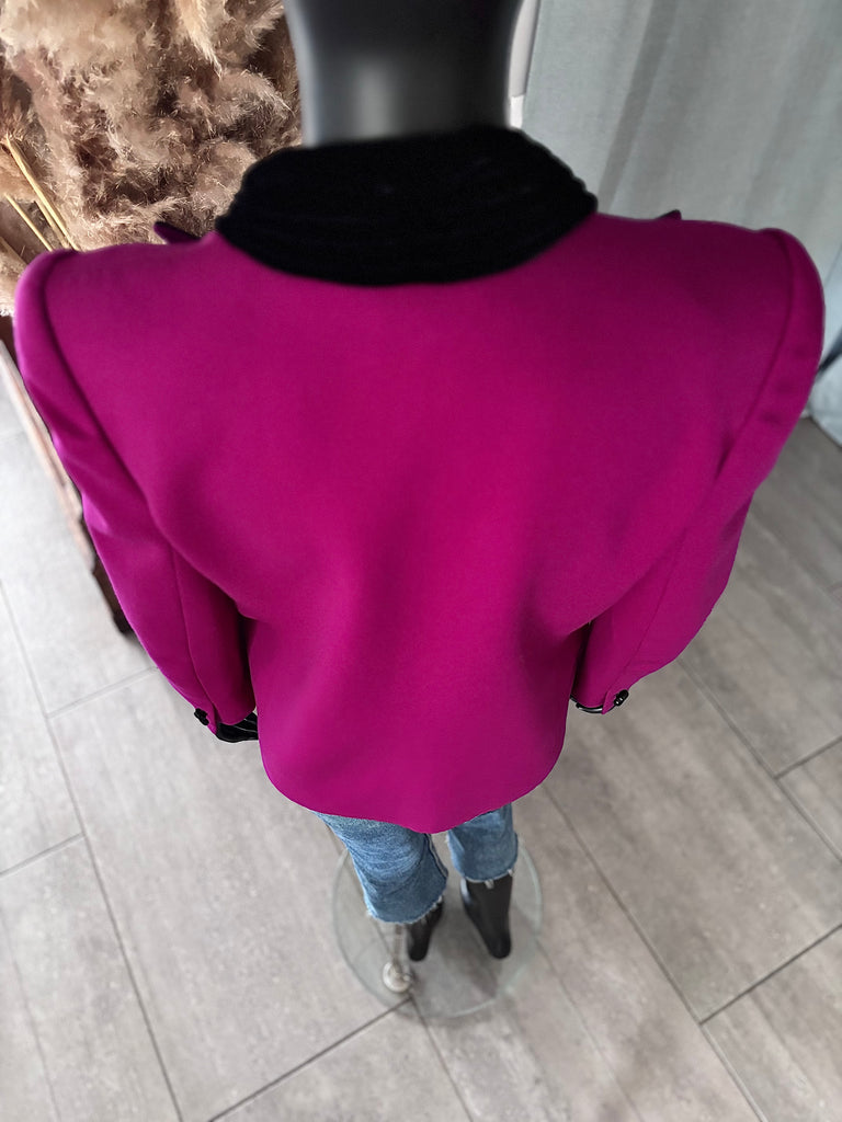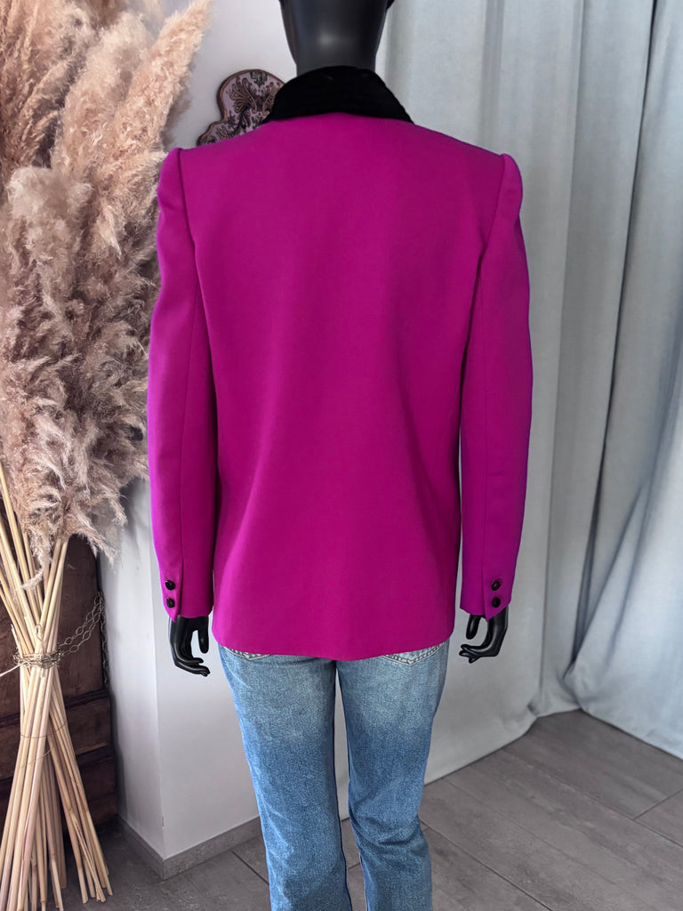 Veste en laine fine de couleur fuchsia soutenu allant sur le violine avec détails de velours et de soie noirs. Col avec effet plissé drapé en velours terminé par 2 anneaux en métal doré et strass. Longs revers de soie noire au tissage finement côtelé et à la découpe en pointe. Coupe légèrement resserrée sur les hanches avec fermeture basse par 1 bouton en velours. Épaules structurées par des épaulettes et poignets terminés par 2 boutons décoratifs. 2 poches passepoilées. Doublée.