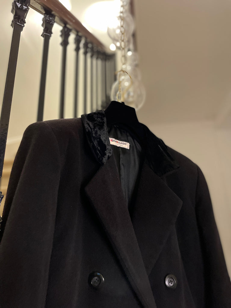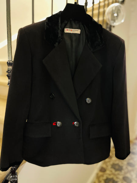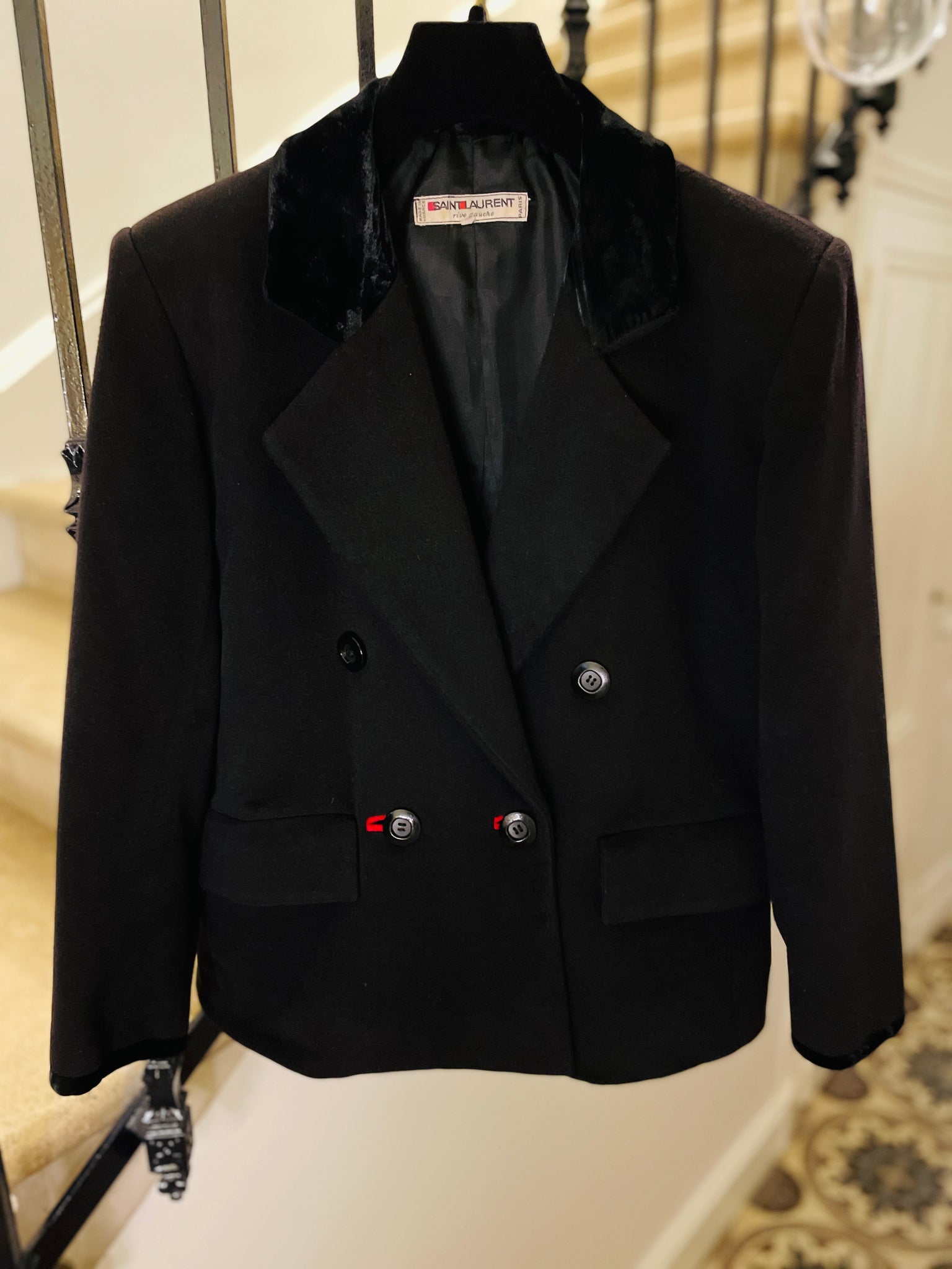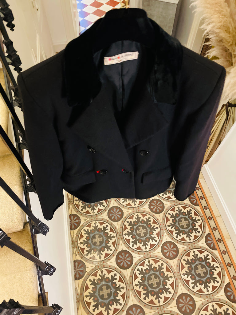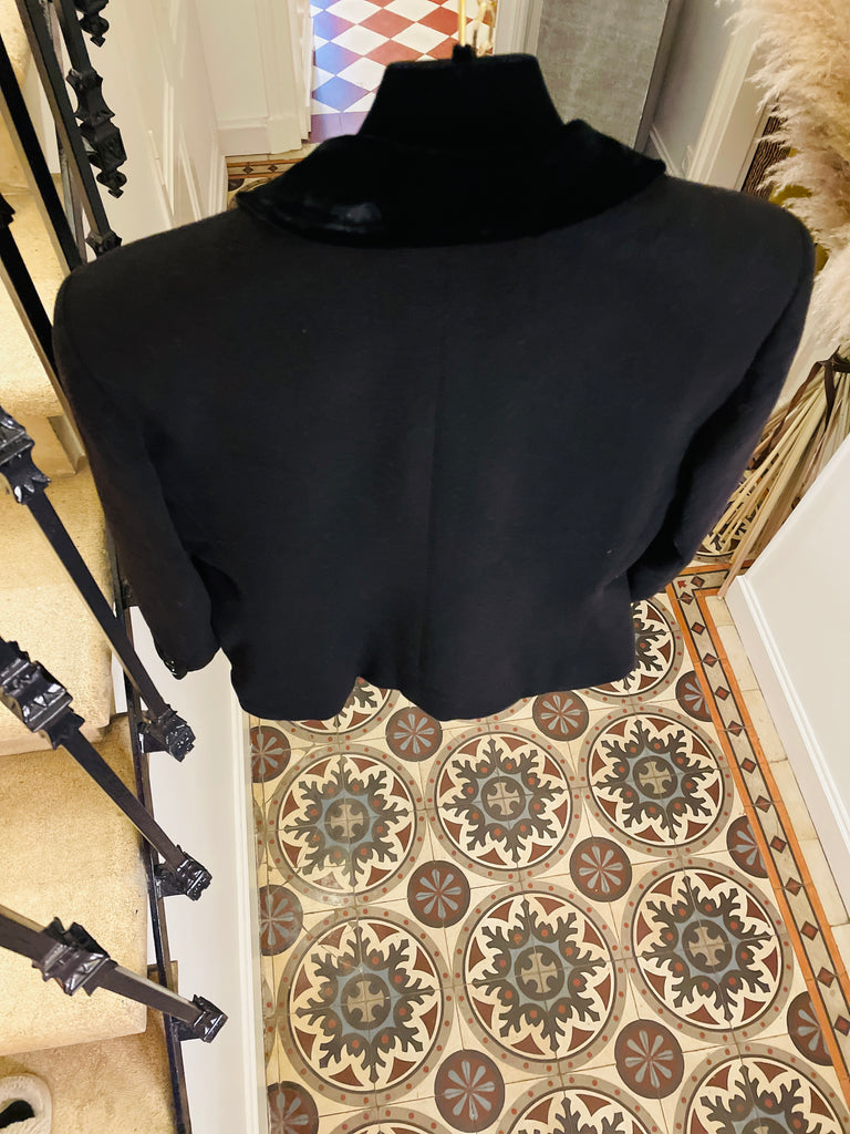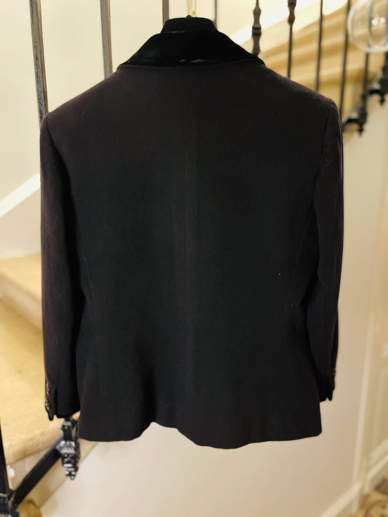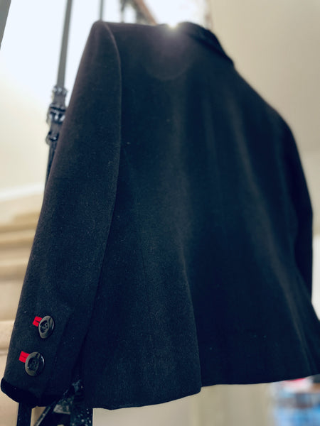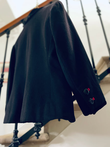 Veste en cachemire de couleur bleu marine foncé (presque noir). Fermeture croisée avec boutonnières rouges. 2 poches plaquées avec rabat. Col en velours. Poignets gansés de velours avec 2 boutons décoratifs et boutonnières rouges .