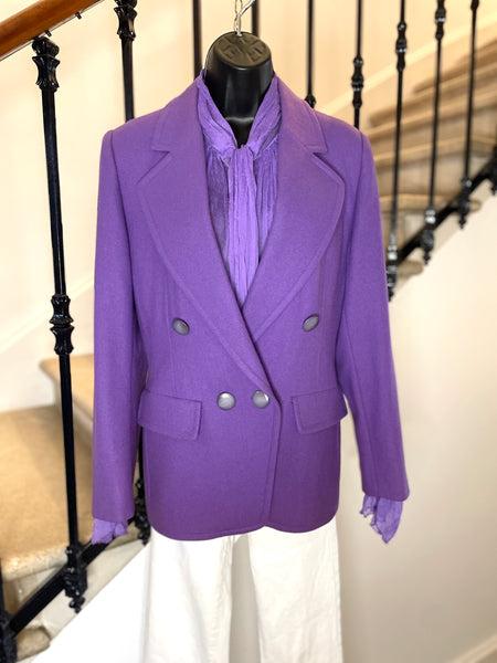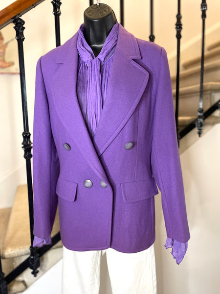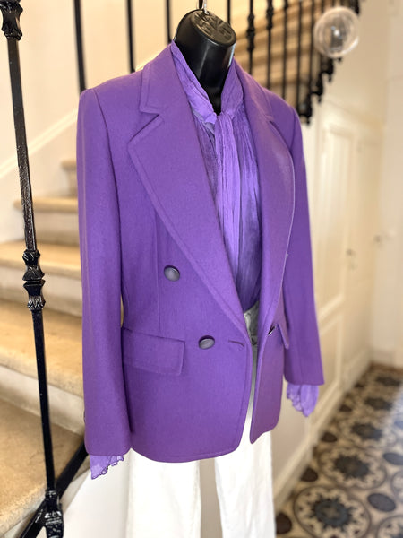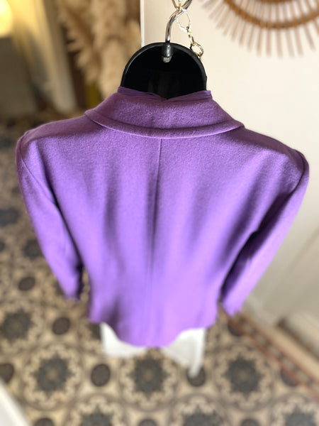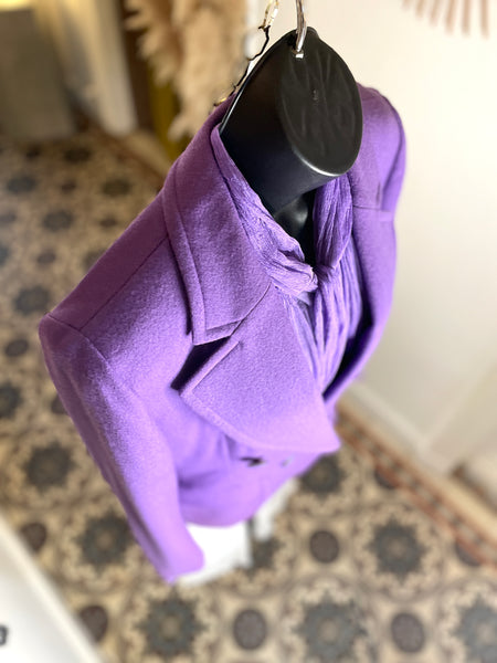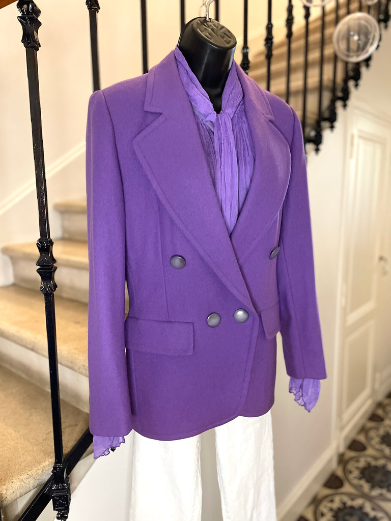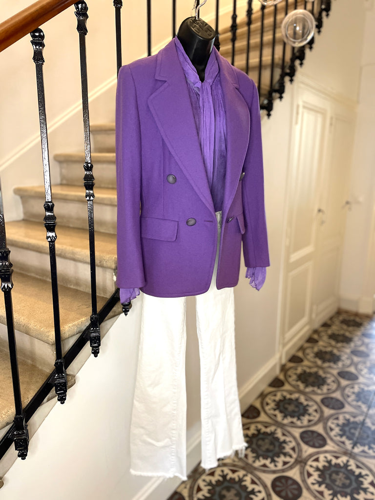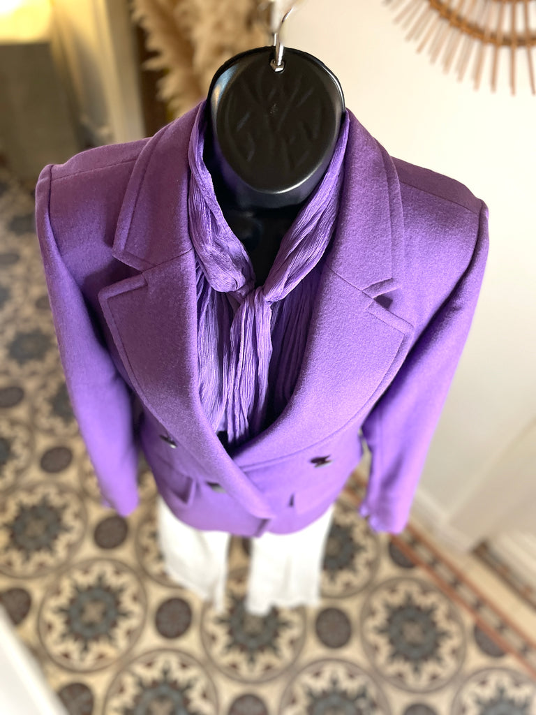 Veste en laine de couleur mauve soutenu (ou violet clair ;). Coupe légèrement ajustée, encolure avec larges revers et fermeture croisée par double boutonnage avec boutons gris/mauves. 2 pochettes poitrine et 2 poches latérales avec rabat. Poignets avec 1 bouton décoratif.