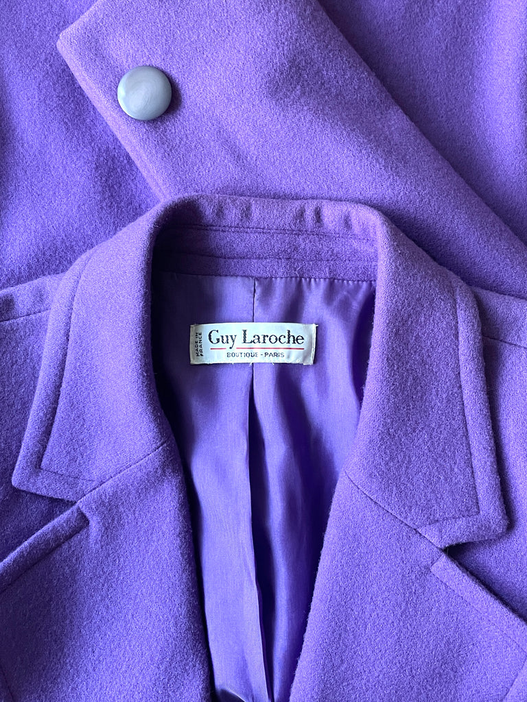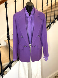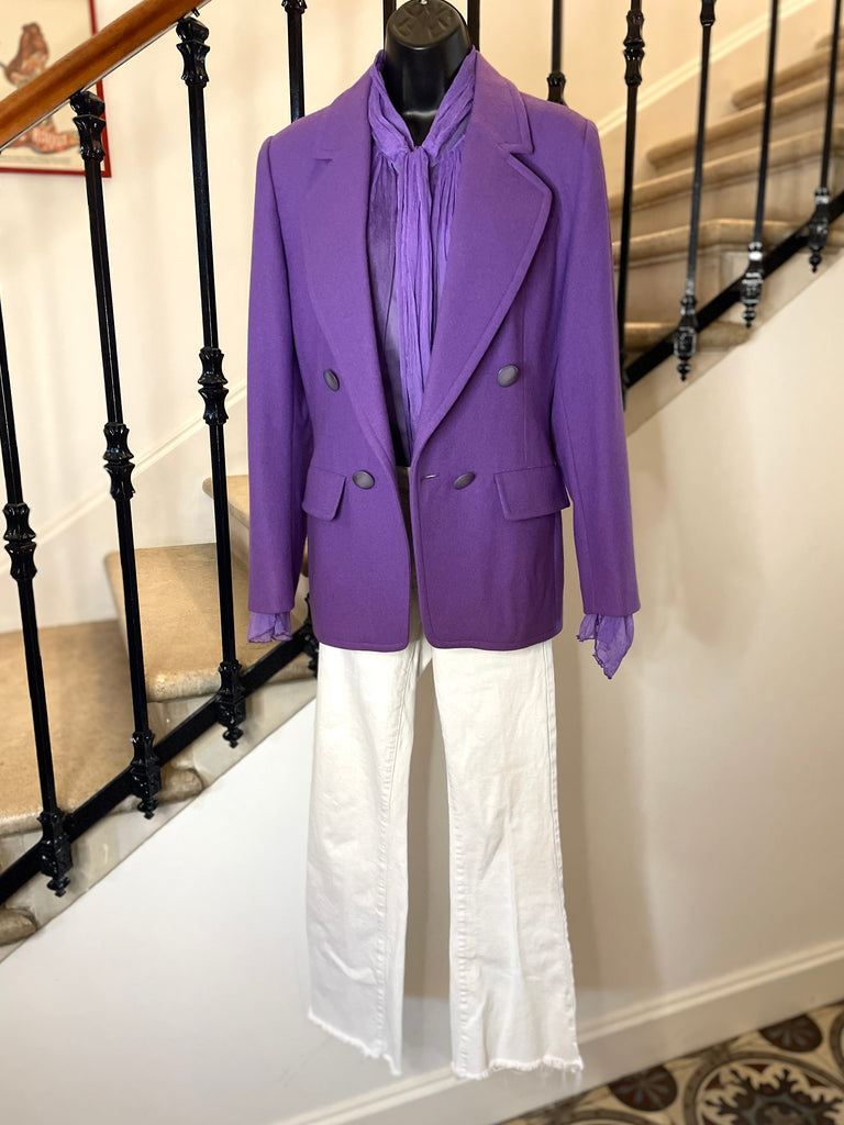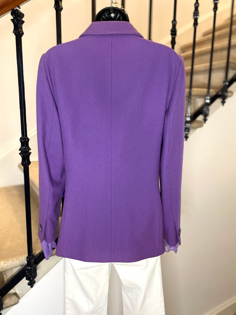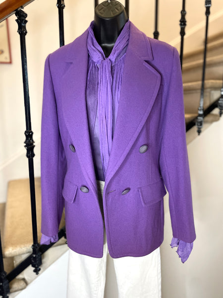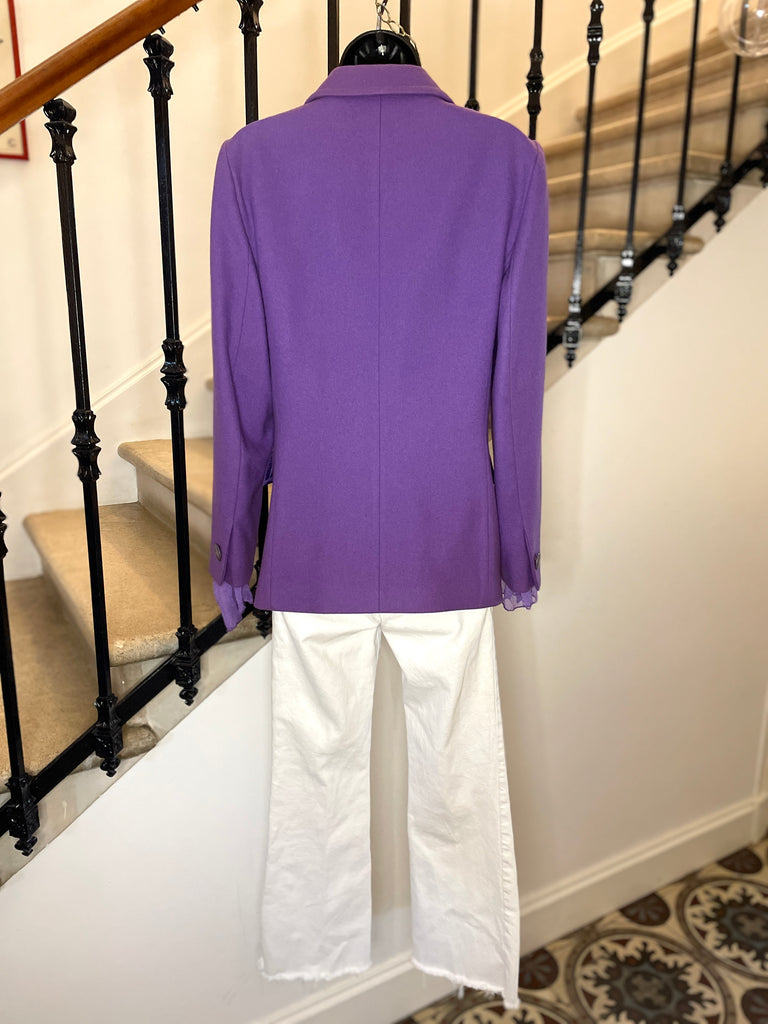 Veste en laine de couleur mauve soutenu (ou violet clair ;). Coupe légèrement ajustée, encolure avec larges revers et fermeture croisée par double boutonnage avec boutons gris/mauves. 2 pochettes poitrine et 2 poches latérales avec rabat. Poignets avec 1 bouton décoratif.