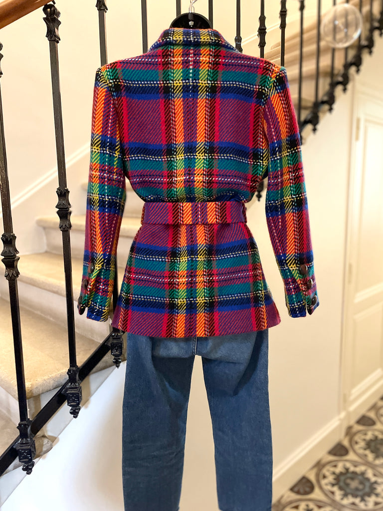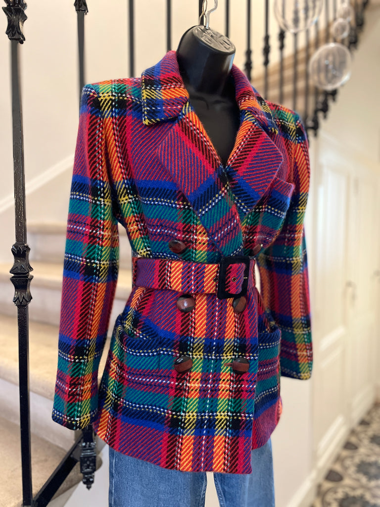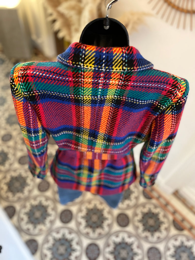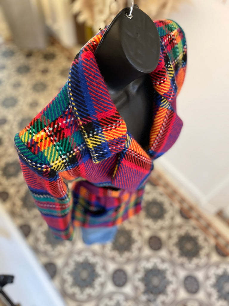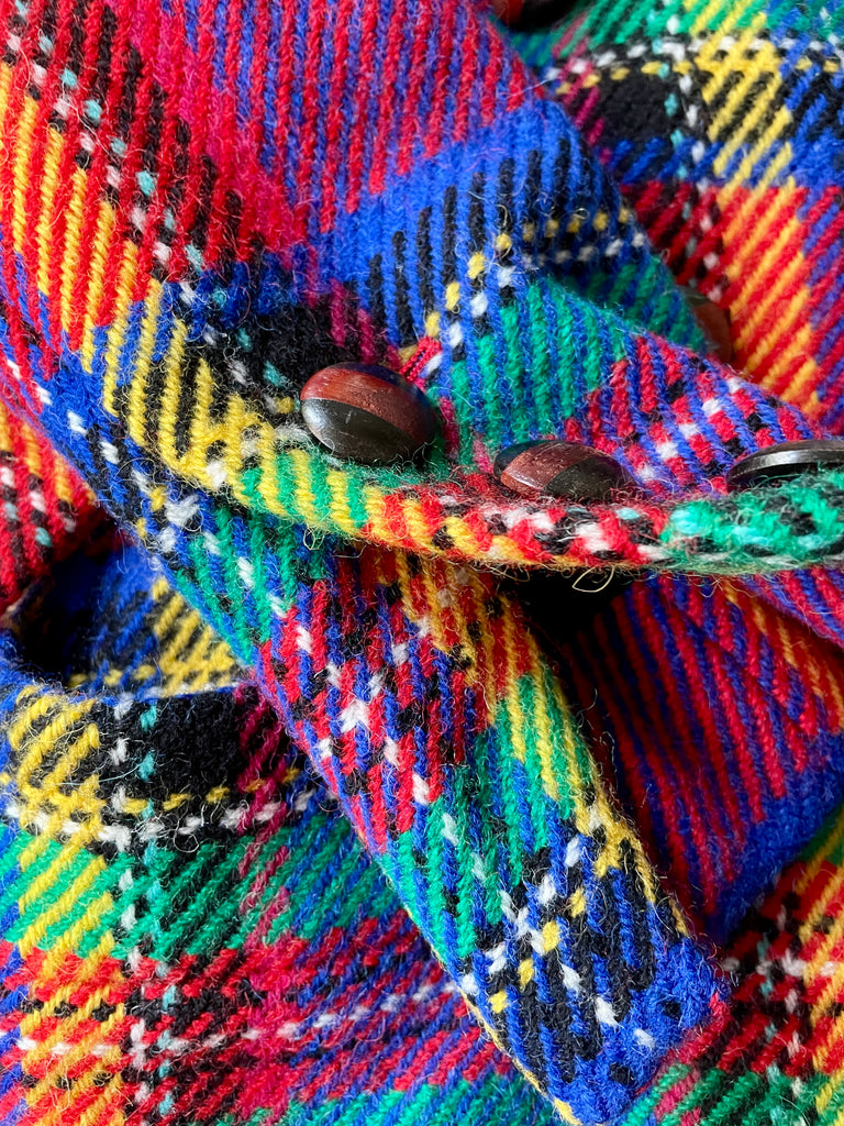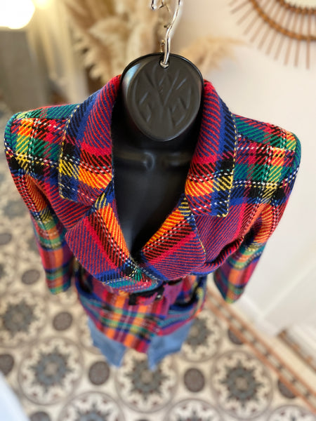 Veste épaisse ou Caban en laine épaisse à l’imprimé tartan dans des couleurs rouge, bleu, fuchsia, jaune, vert, noir et blanc. Coupe droite et croisée par double boutonnage avec boutons bicolores en bois, ceinture maintenue par 4 passants avec boucle en velours noir et épaules structurées par des épaulettes. 2 poches passepoilées et poignets terminés par 3 boutons décoratifs.