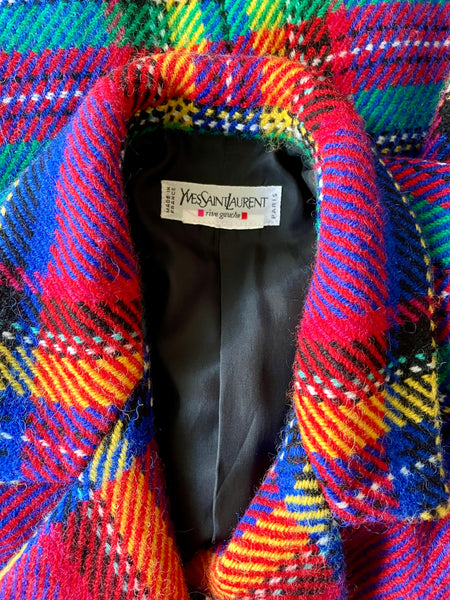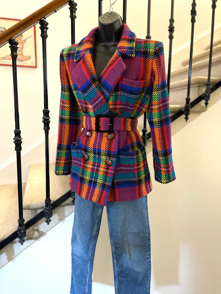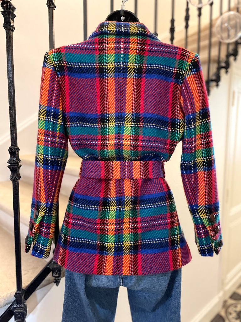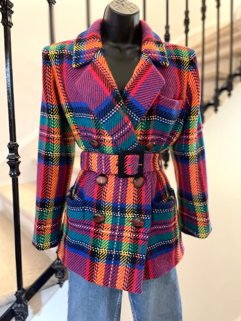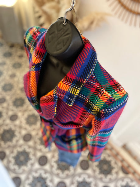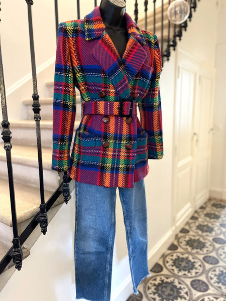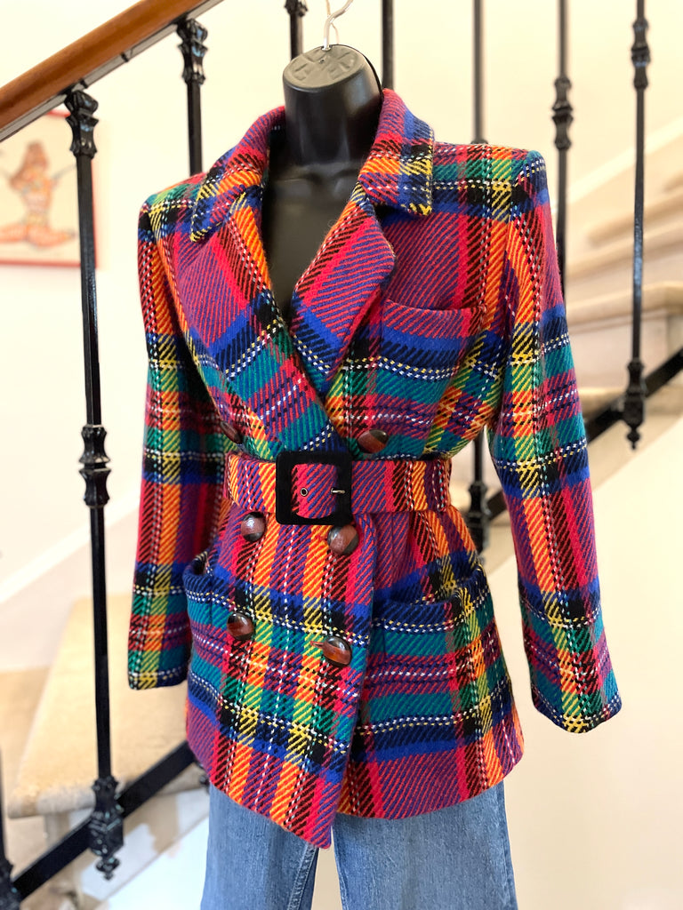 Veste épaisse ou Caban en laine épaisse à l’imprimé tartan dans des couleurs rouge, bleu, fuchsia, jaune, vert, noir et blanc. Coupe droite et croisée par double boutonnage avec boutons bicolores en bois, ceinture maintenue par 4 passants avec boucle en velours noir et épaules structurées par des épaulettes. 2 poches passepoilées et poignets terminés par 3 boutons décoratifs.