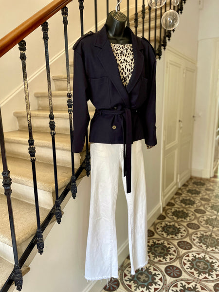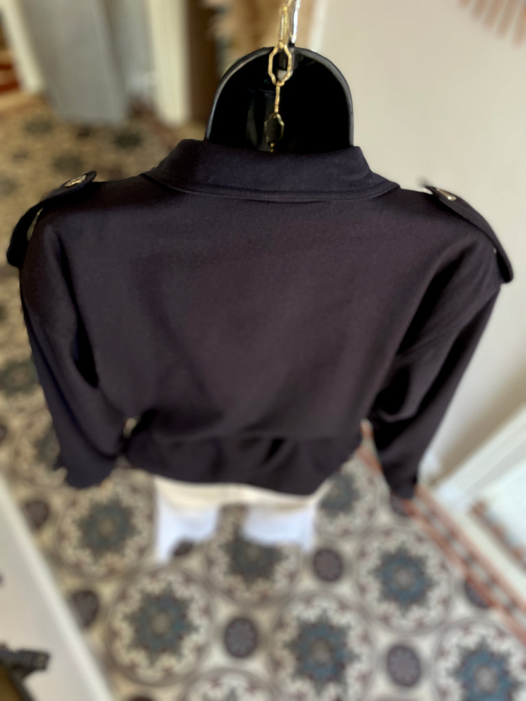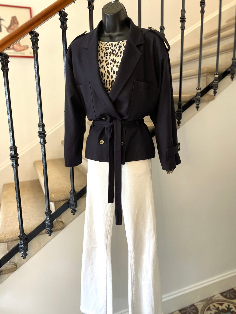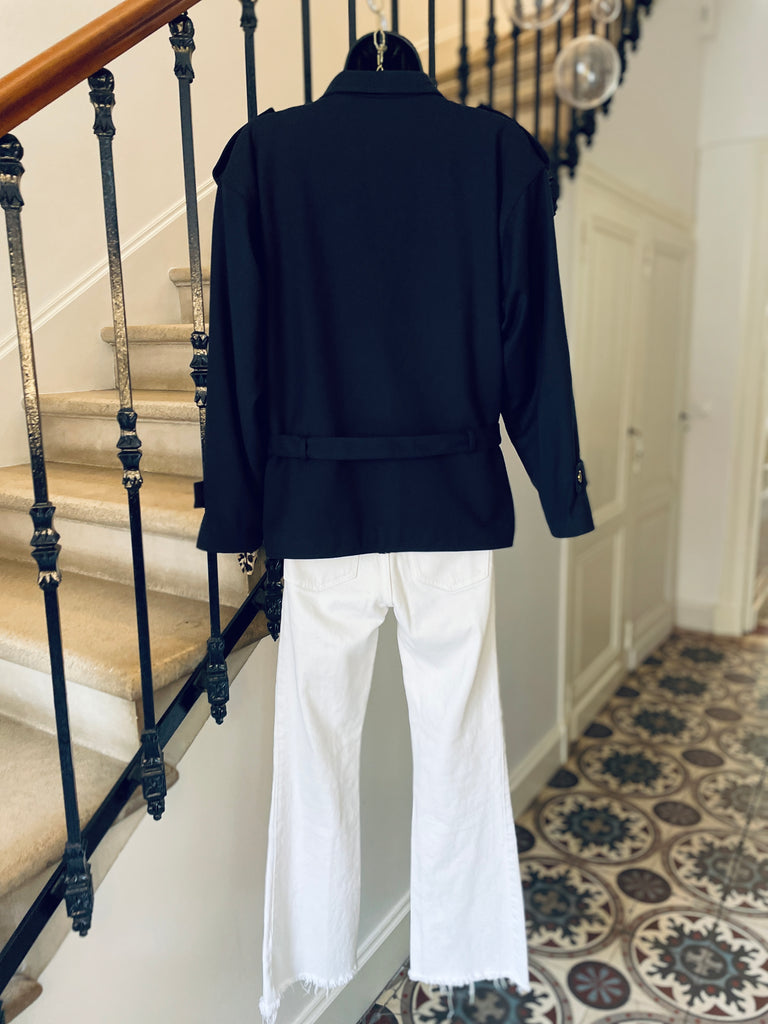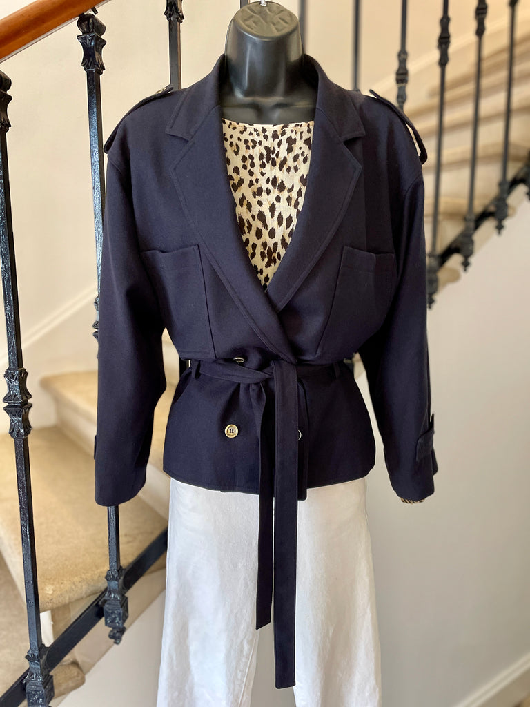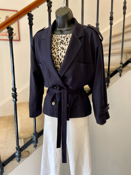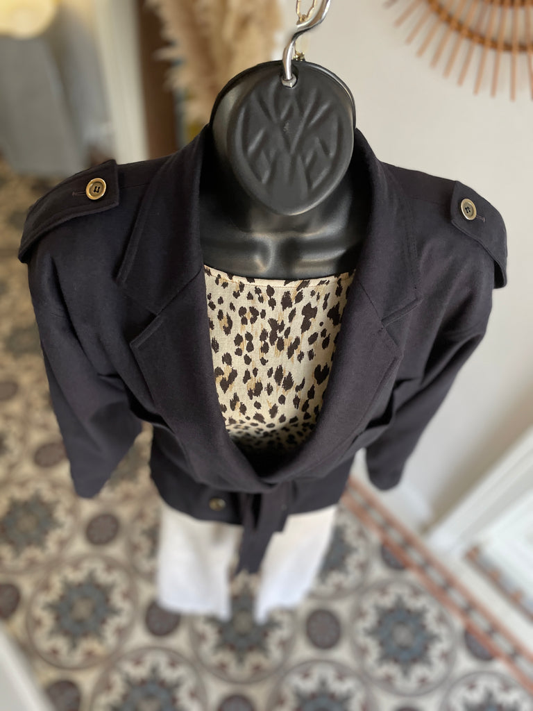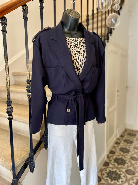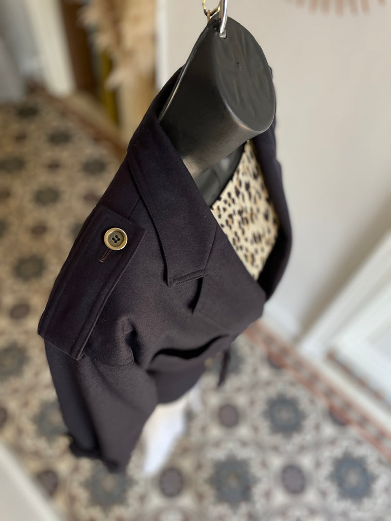 Veste de couleur bleu marine. Coupe droite, fermeture croisée par boutons en métal texturé et ceinture amovible. Epaules basses avec patte et bouton, 2 grandes poches plaquées sur la poitrine. Poignets avec patte et bouton. Doublée.