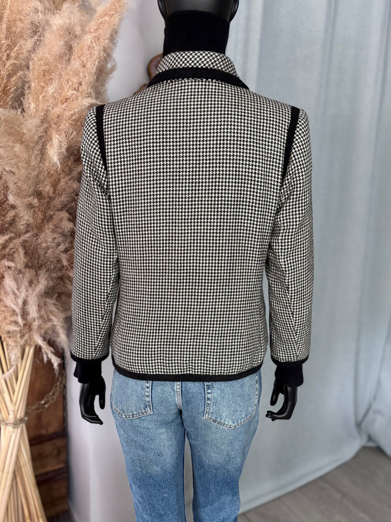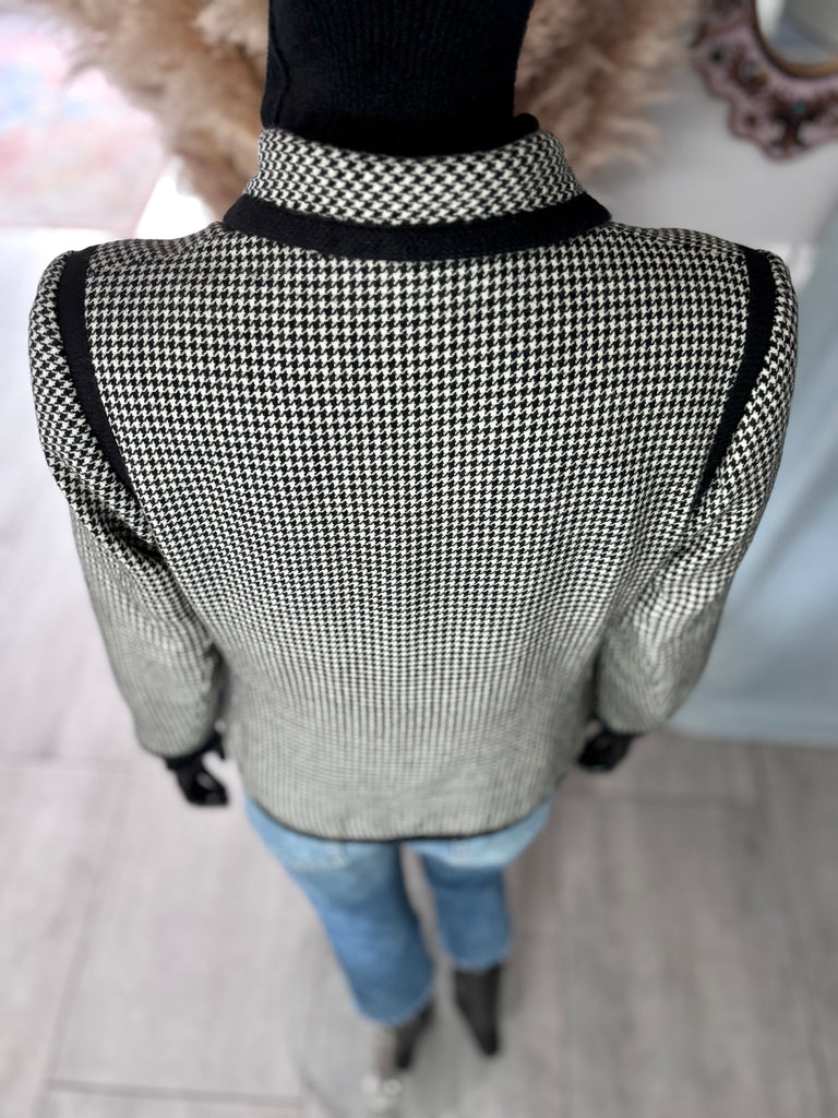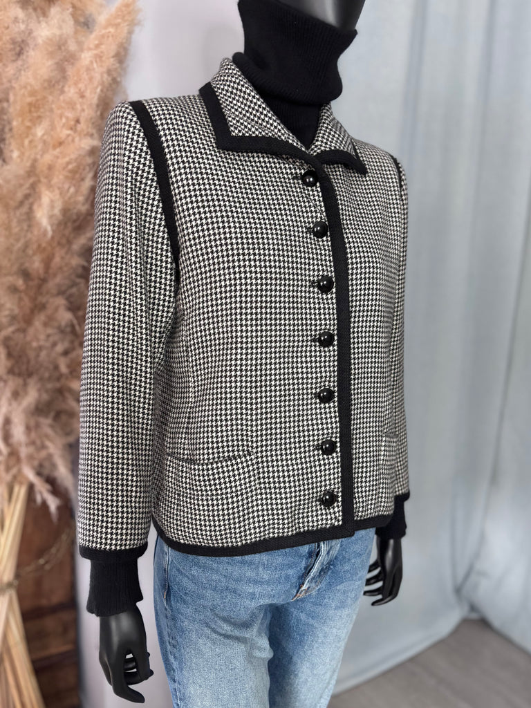 Veste en laine Ă lâimprimĂ© pied de poule noir et blanc gansĂ©e dâun galon en laine noire. Coupe droite, large col plat sans revers, fermeture haute par boutons ronds et noirs. Ăpaulettes, manches 7/8 et 2 poches passepoilĂ©es. DoublĂ©e.Â