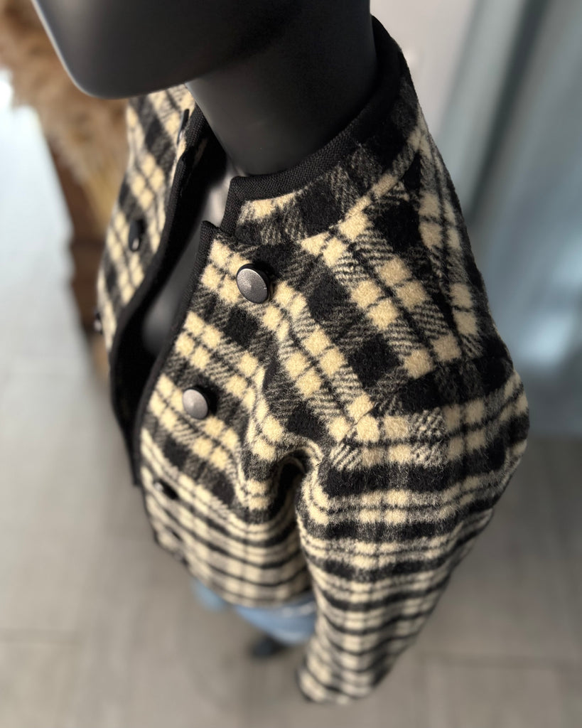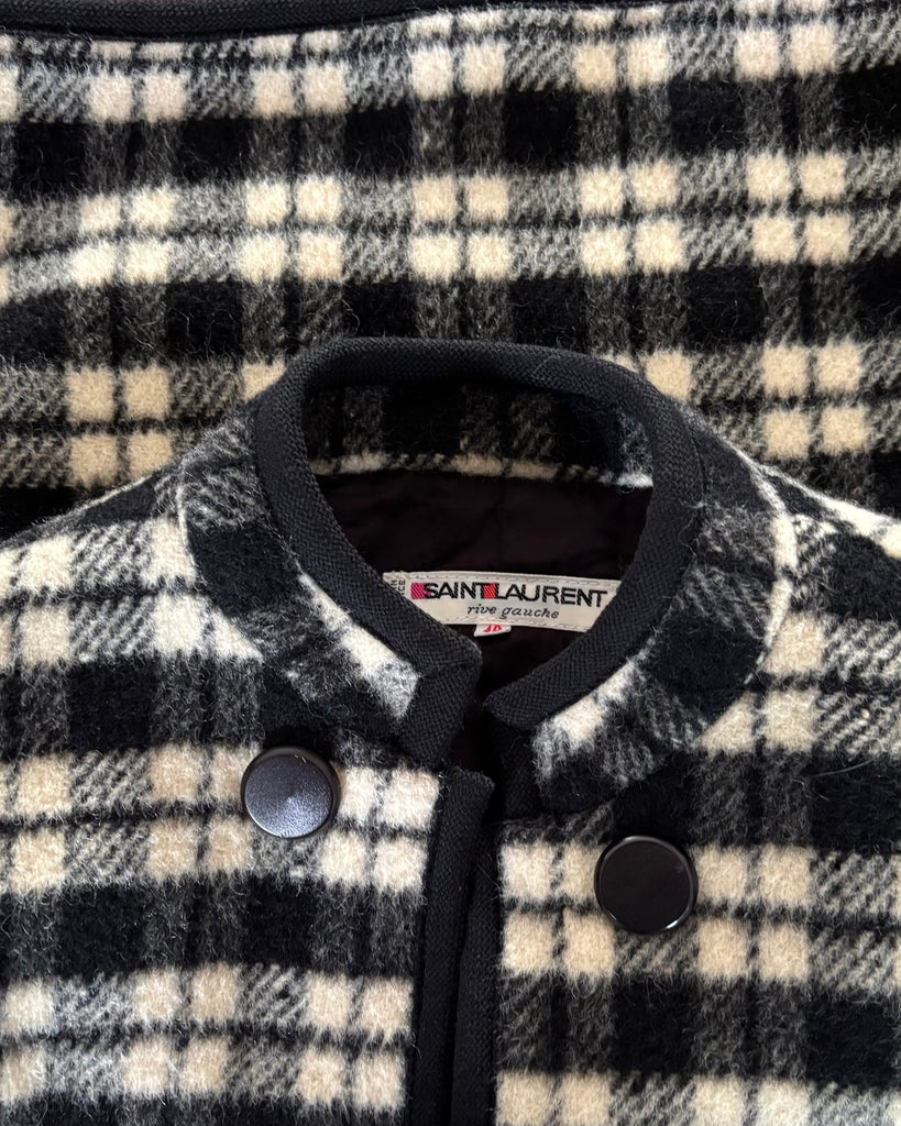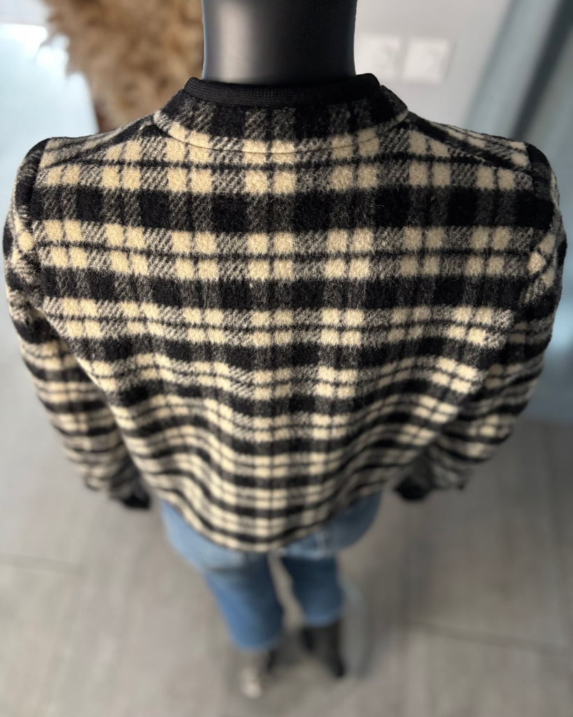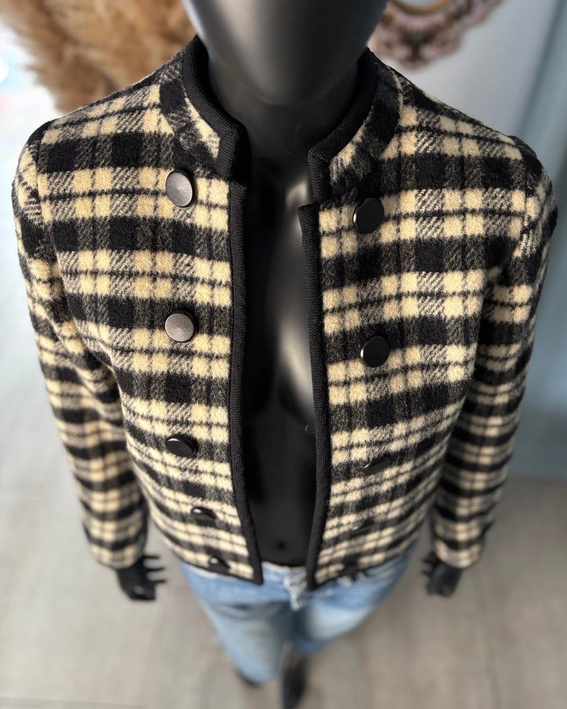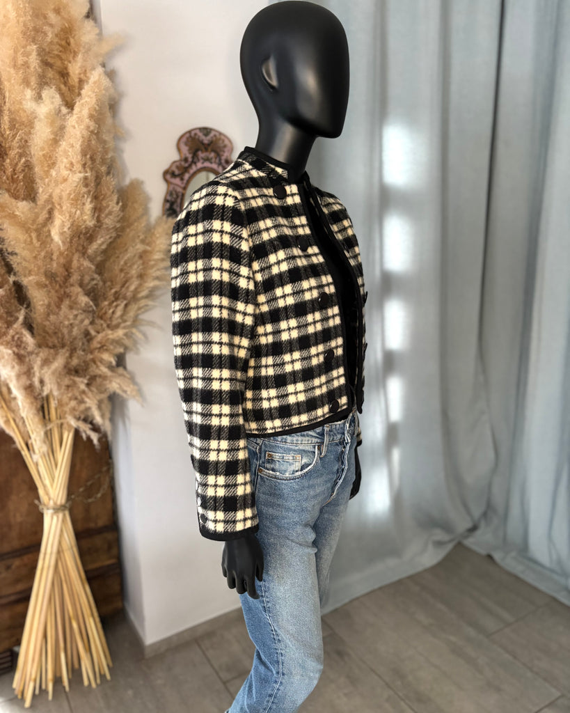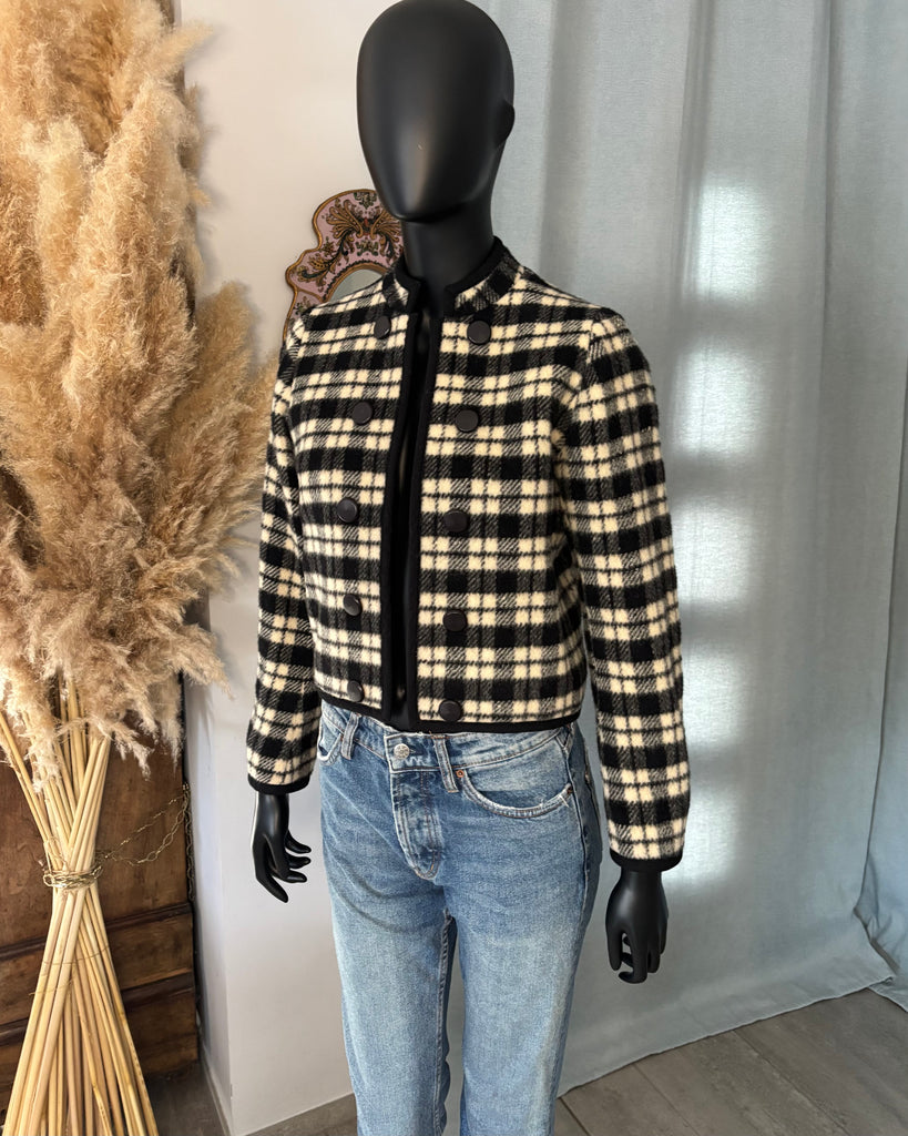 Veste courte en laine épaisse au motif tartan de couleurs noir et blanc crème, gansée d’un galon noir. Coupe façon boléro, droite et sans fermeture, boutons décoratifs. Manches resserrées aux poignets avec 3 boutons. Doublé.