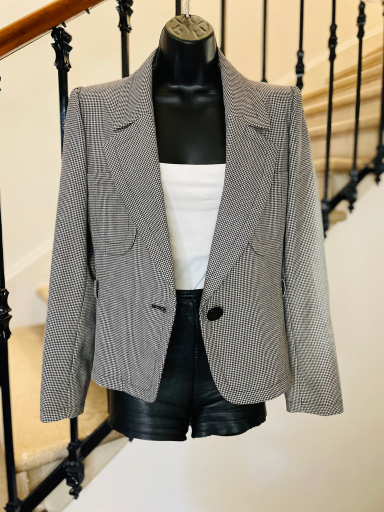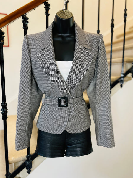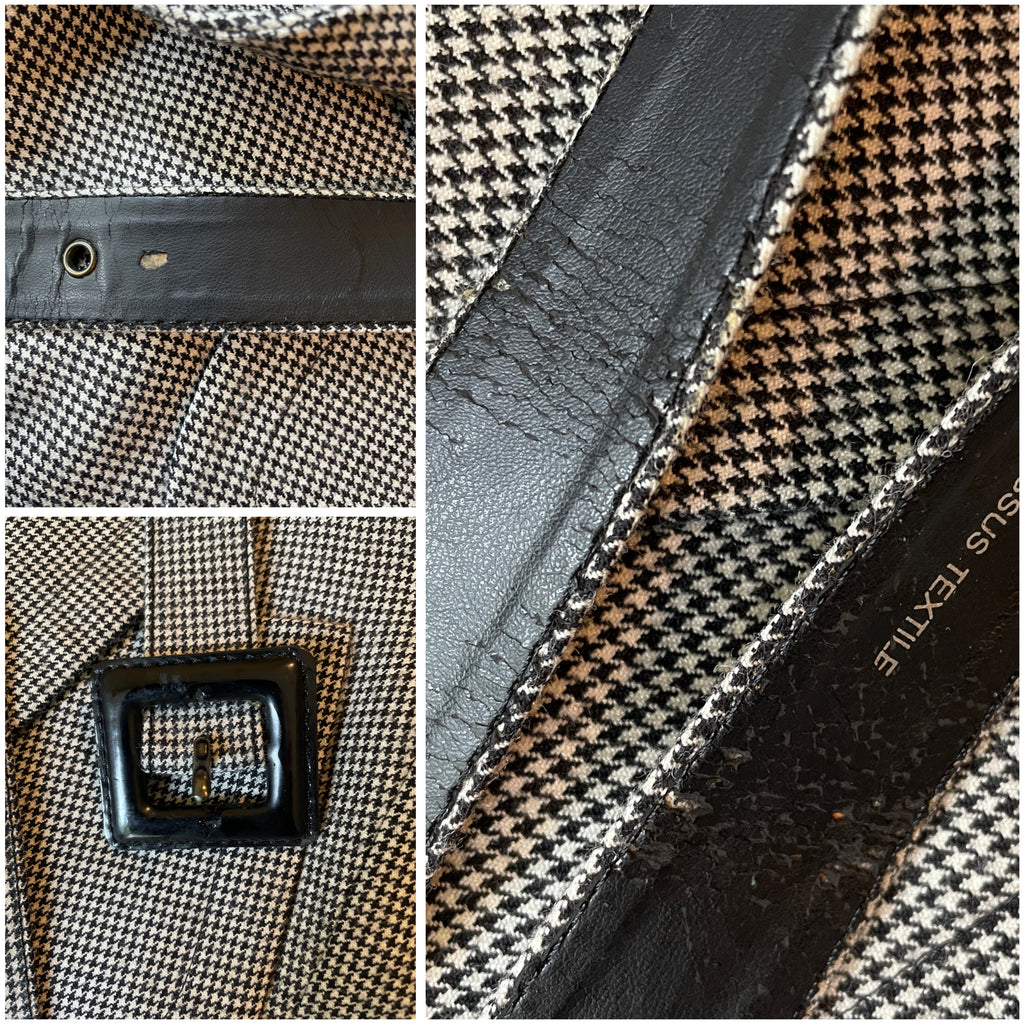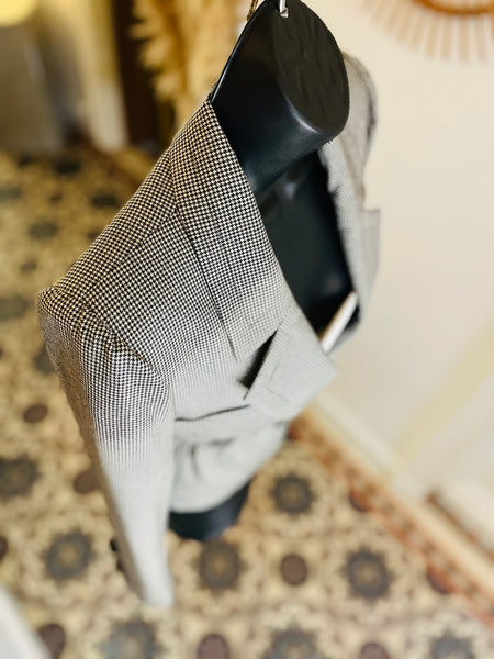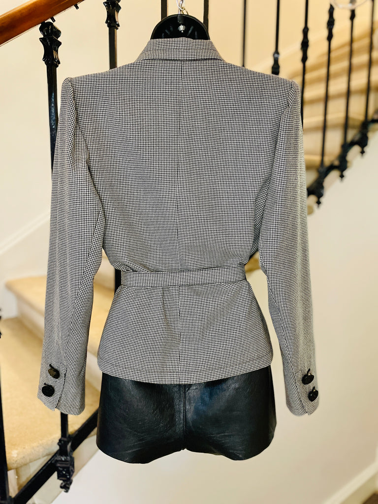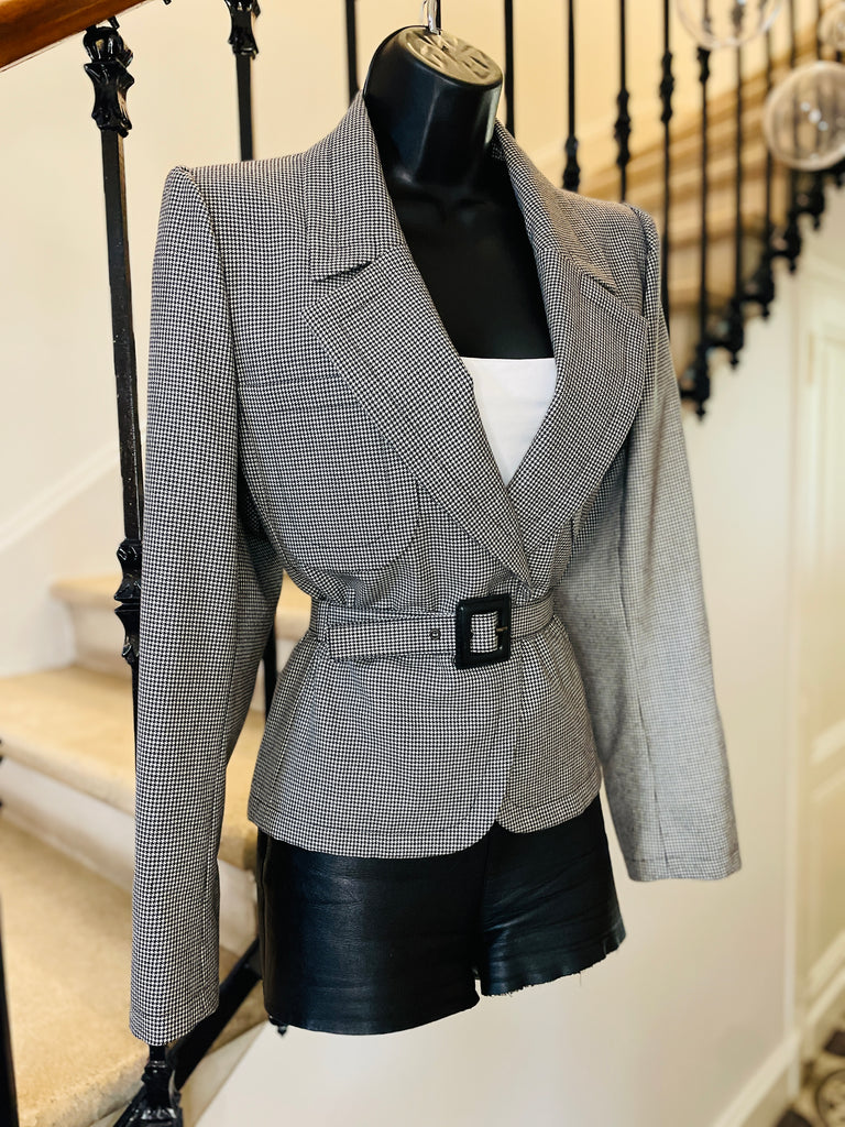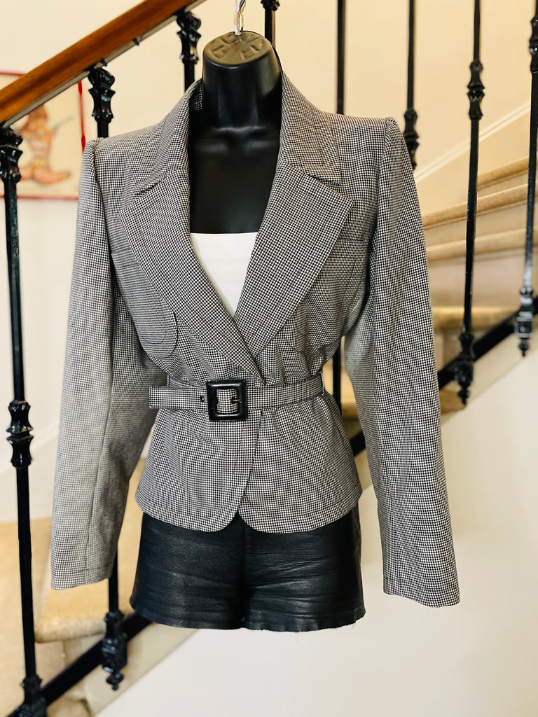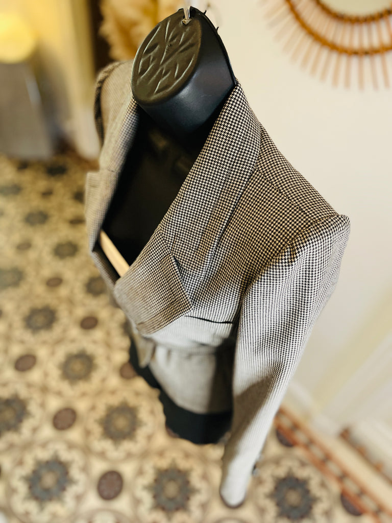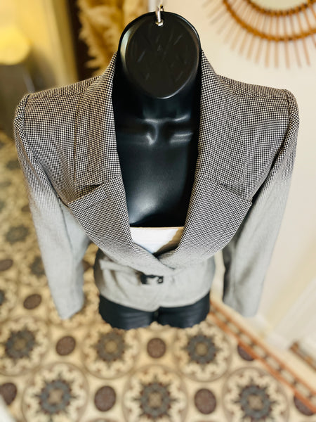 Veste courte en laine à l’imprimé pied de poule et de couleurs noir et blanc. Coupe cintrée, fermeture par 1 bouton noir texturé et une ceinture recouverte avec une boucle noire. 2 poches plaquées sur la poitrine. Épaulettes et manches terminées par 2 petits boutons.