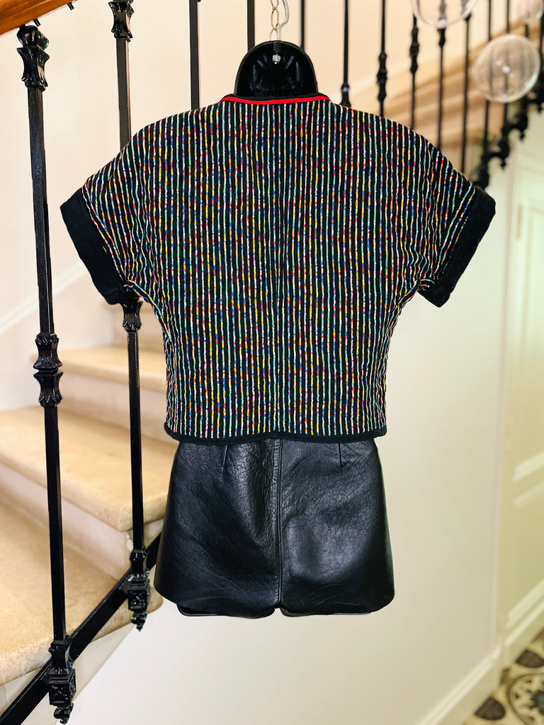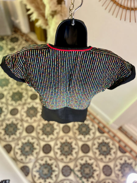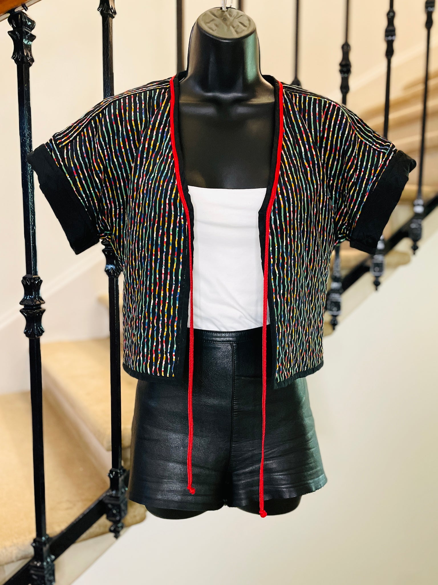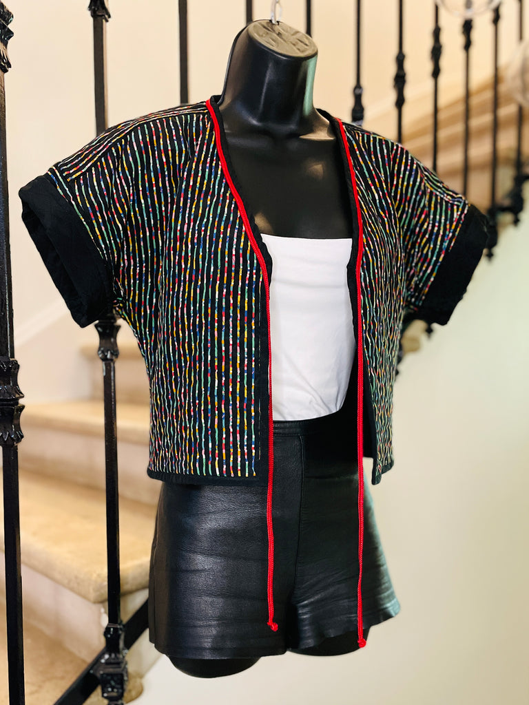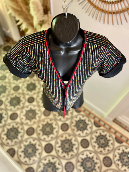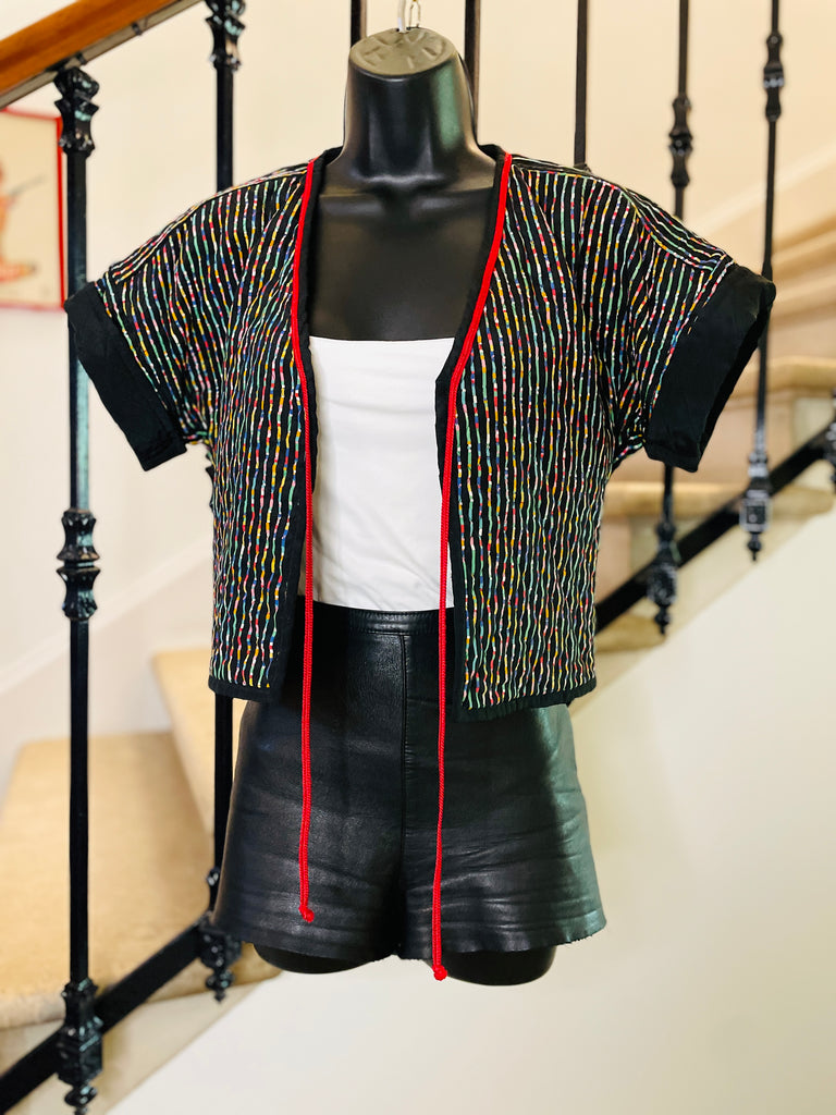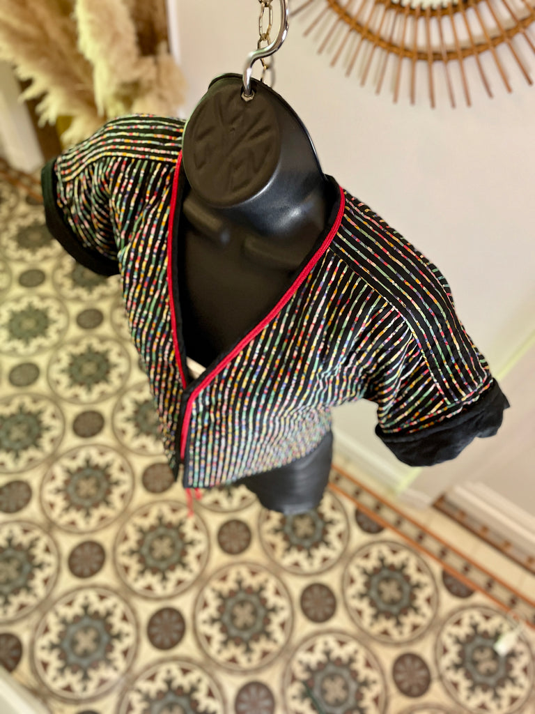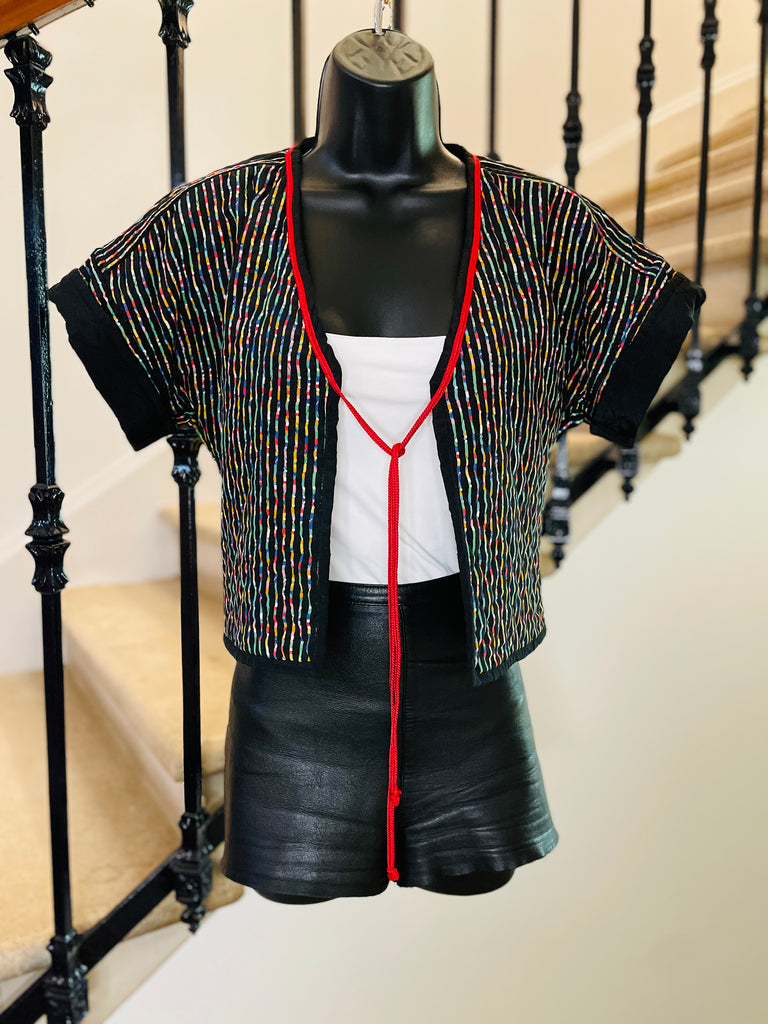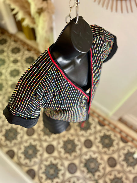 Veste courte et légère, matelassée avec surpiqûres noires, en coton à l’imprimé multicolore sur fond noir. Coupe façon kimono resserrée à la taille, bordée d’un cordon rouge à nouer ou pas ;). Manches courtes avec revers non fixes.