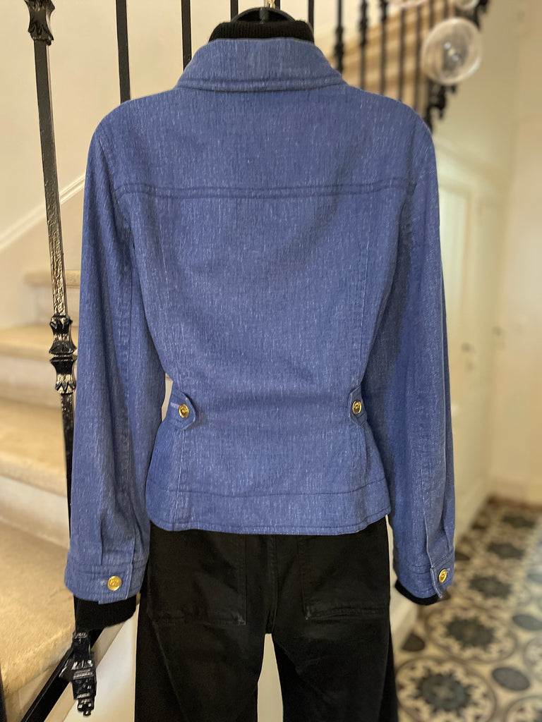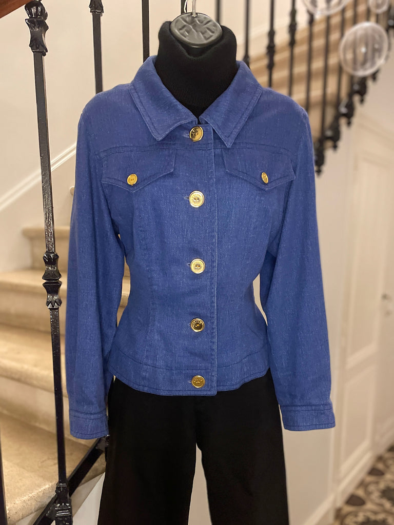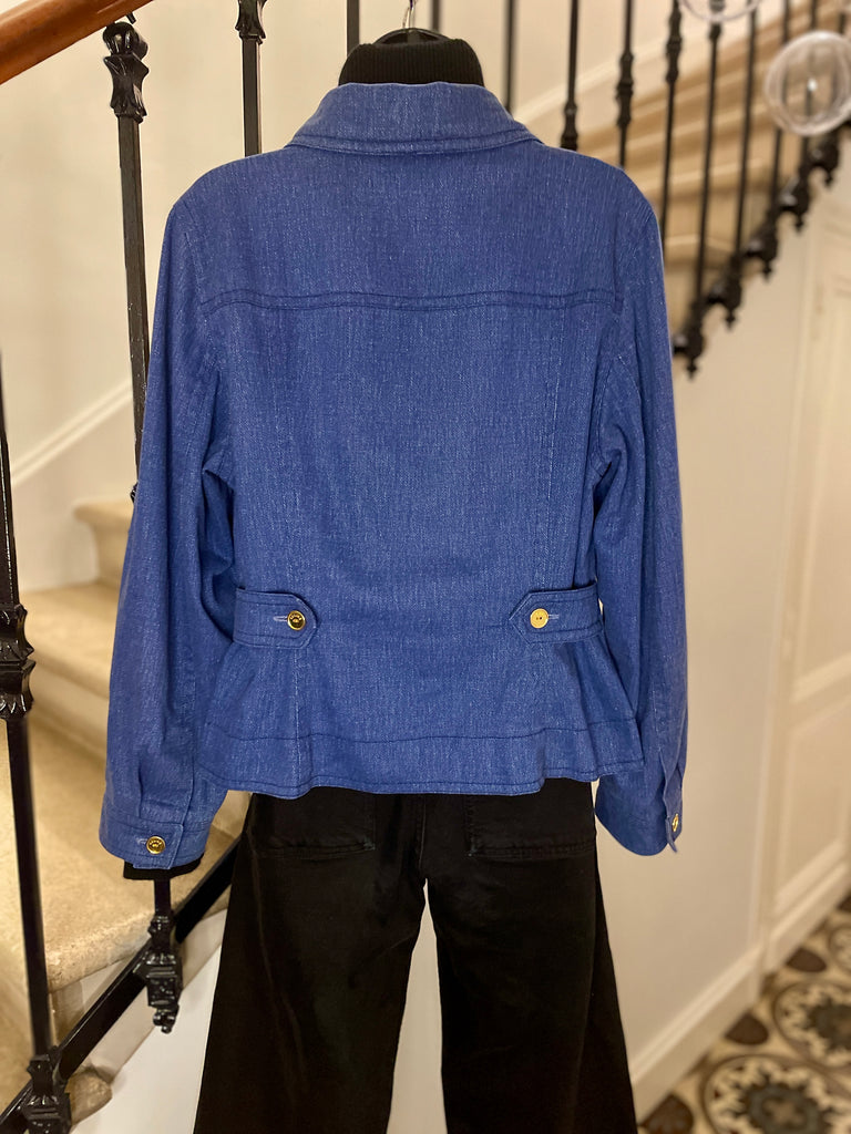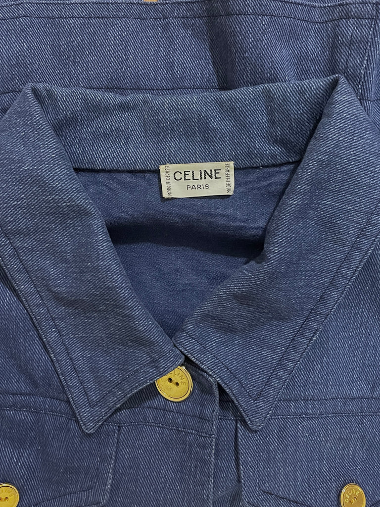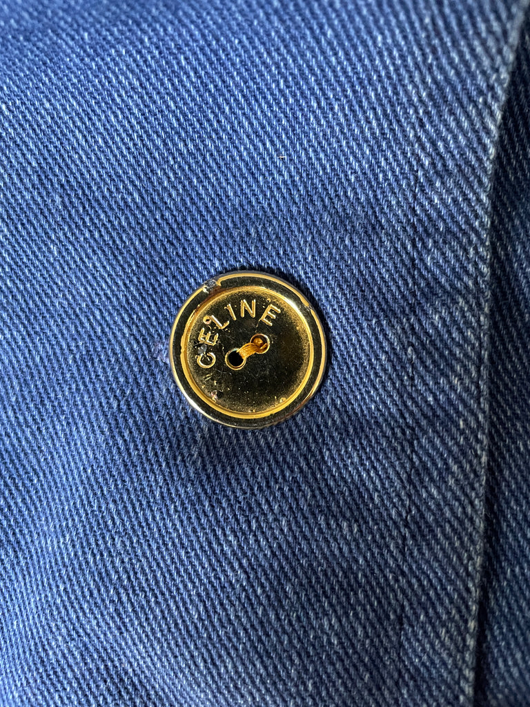 Veste façon jeans de couleur bleue. Coupe cintrée à la taille et ajustée sur les hanches. Fermeture par boutons dorés et siglés CELINE, 2 pochettes factices avec rabat et bouton et poignets fermés par 1 bouton. Non doublée.
