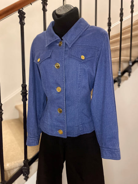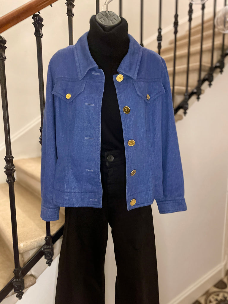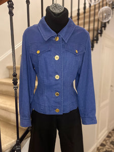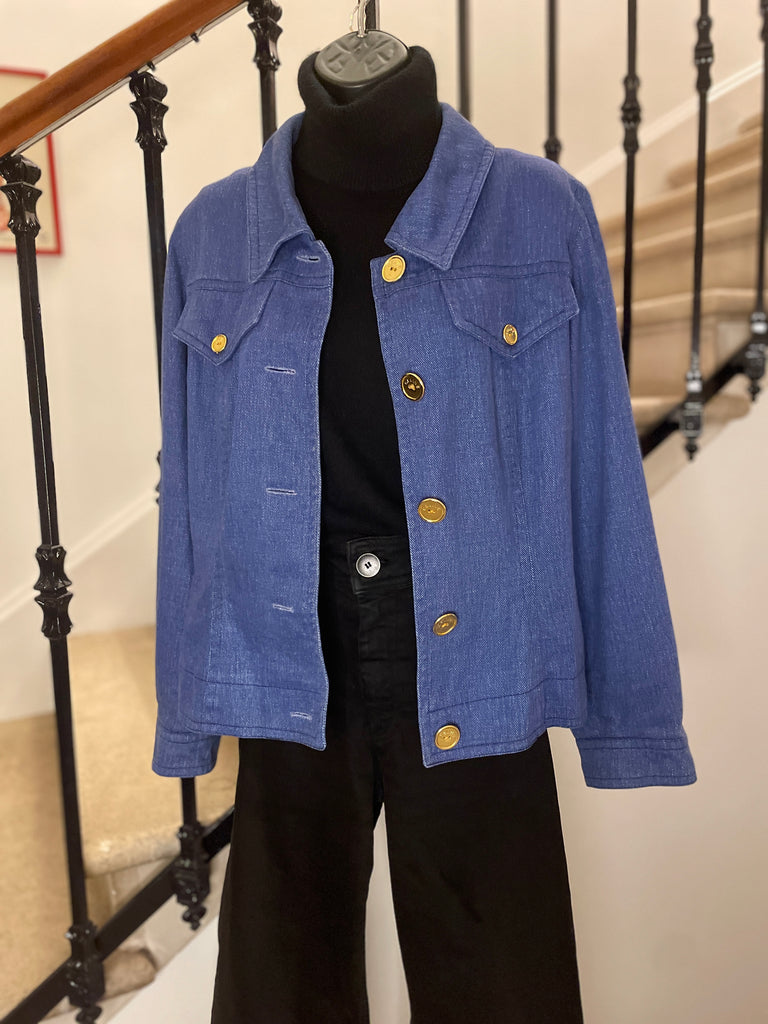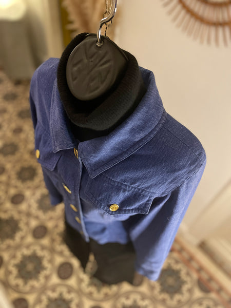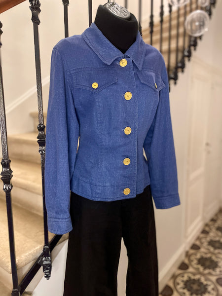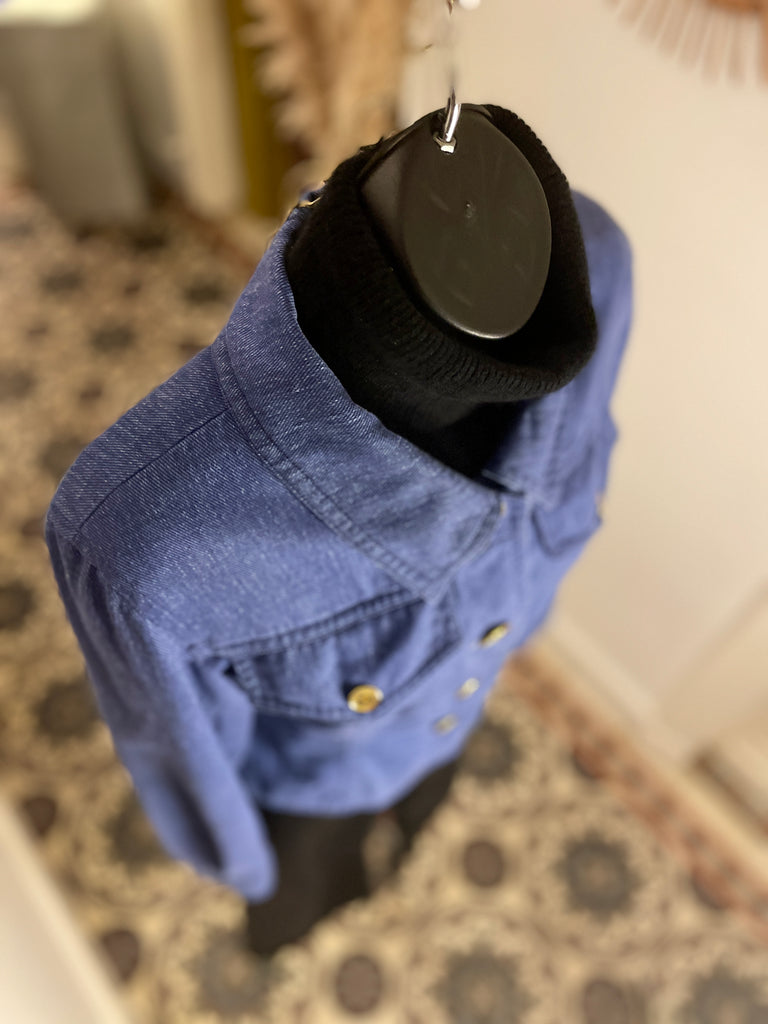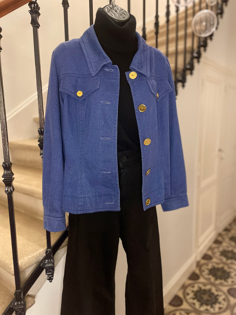 Veste façon jeans de couleur bleue. Coupe cintrée à la taille et ajustée sur les hanches. Fermeture par boutons dorés et siglés CELINE, 2 pochettes factices avec rabat et bouton et poignets fermés par 1 bouton. Non doublée.