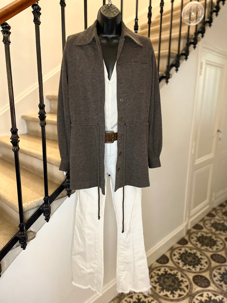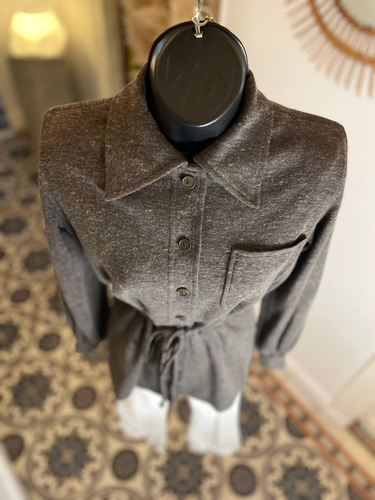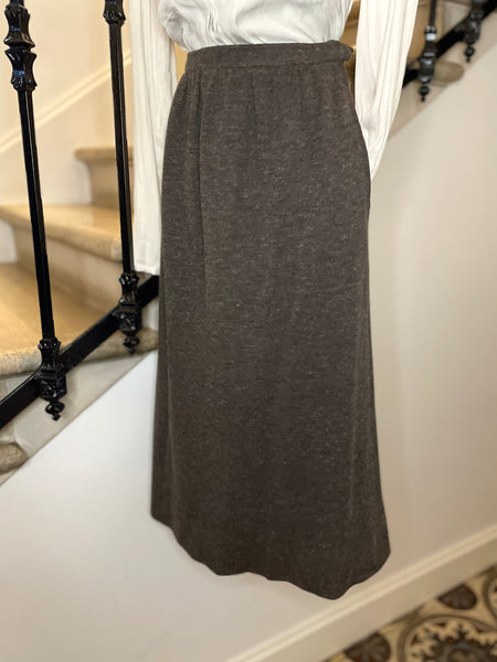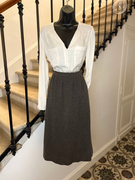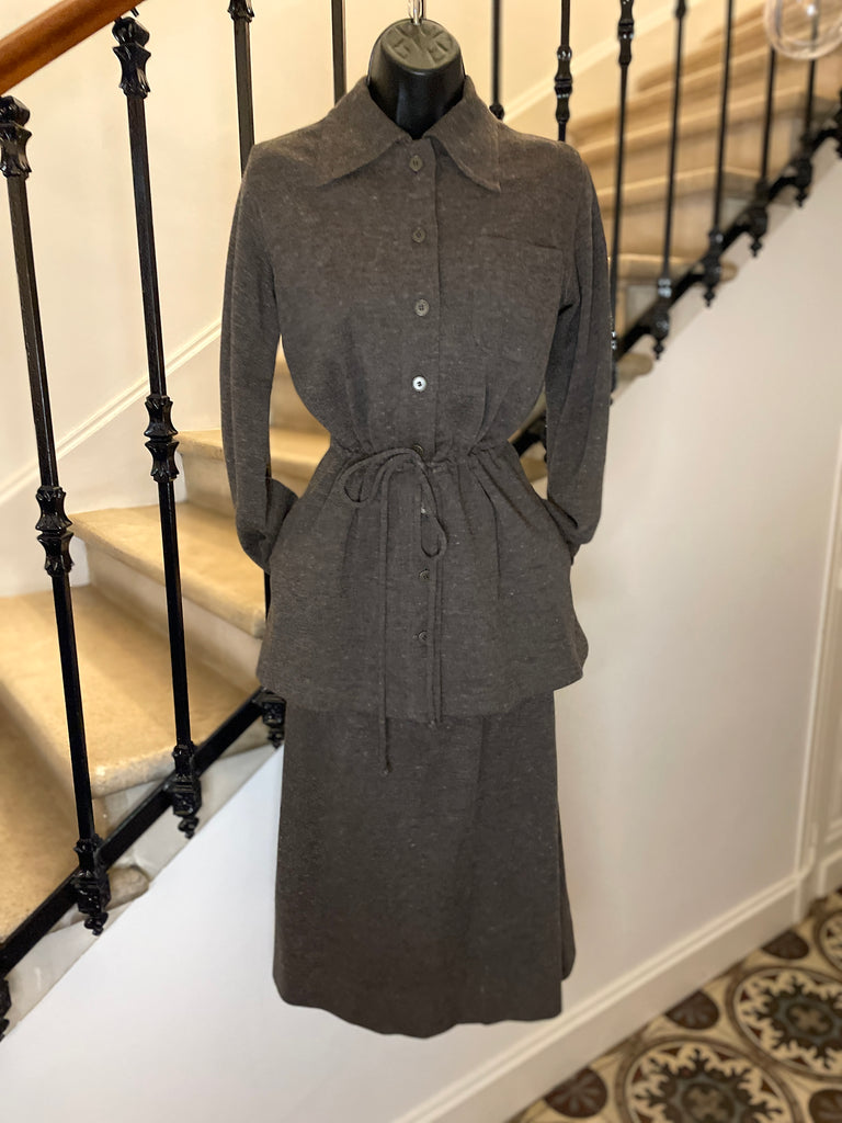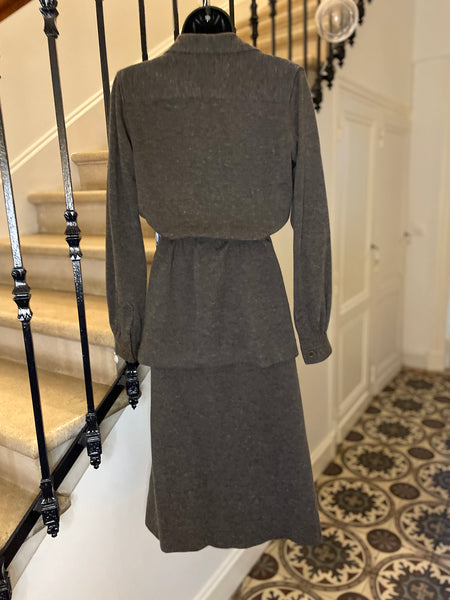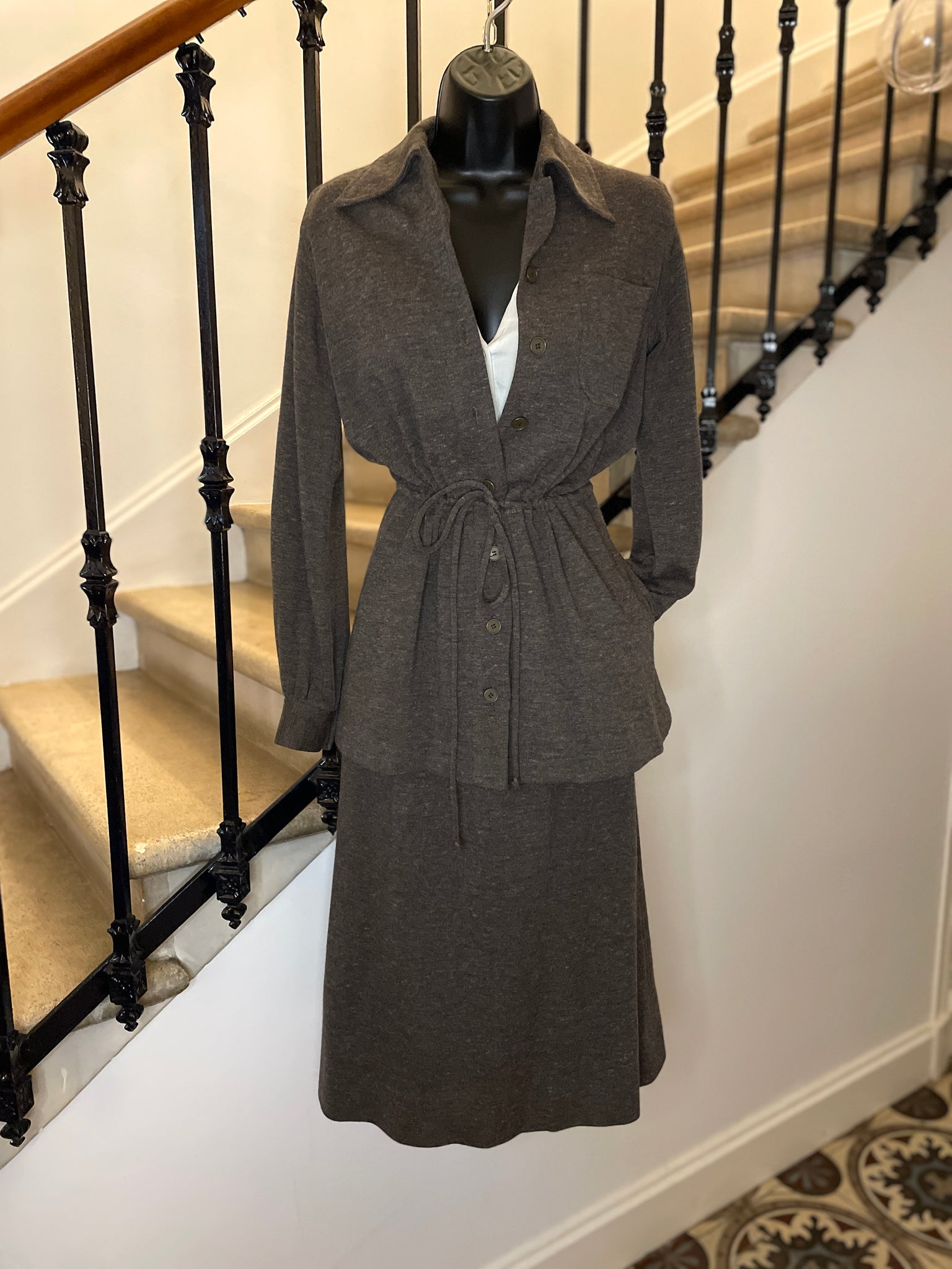 Ensemble Veste longue et jupe mi-longue en laine mélangée de couleur taupe chinée gris anthracite et banc.