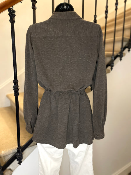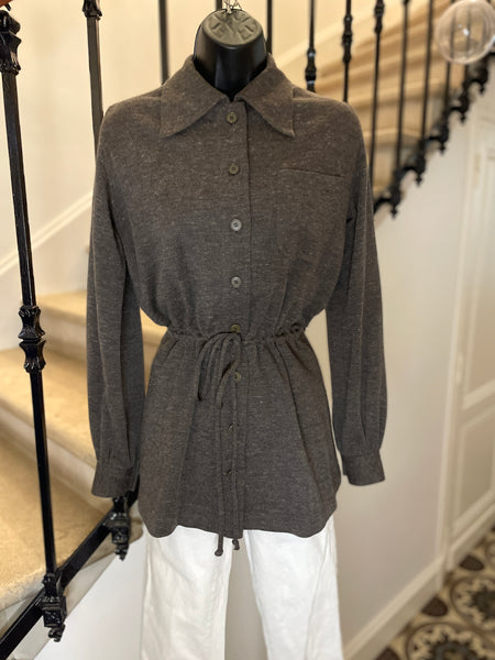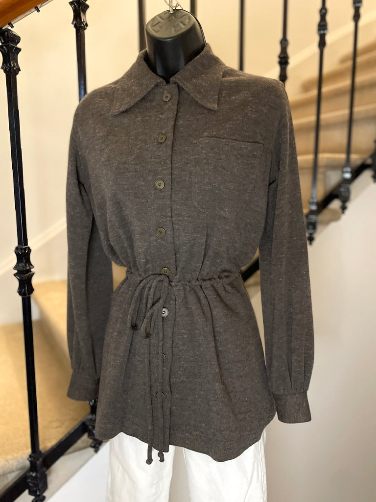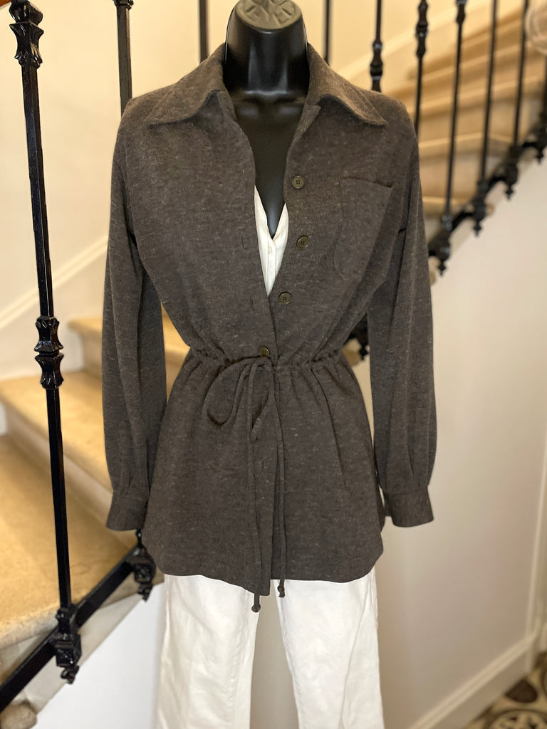 Veste : Coupe droite jusquâĂ la ceinture coulissante puis lĂ©gĂšrement Ă©vasĂ©e. Col plat en pointe, manches avec jeu de plis aux poignets, fermĂ©s par 1 bouton. 1 pochette plaquĂ©e et 2 poches dans le biais. Non doublĂ©e.Â