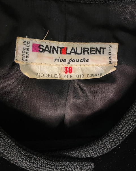 Veste courte en laine noire, coupe droite. Col officier. Pas de fermeture se porte ouverte. Légèrement épaulée.