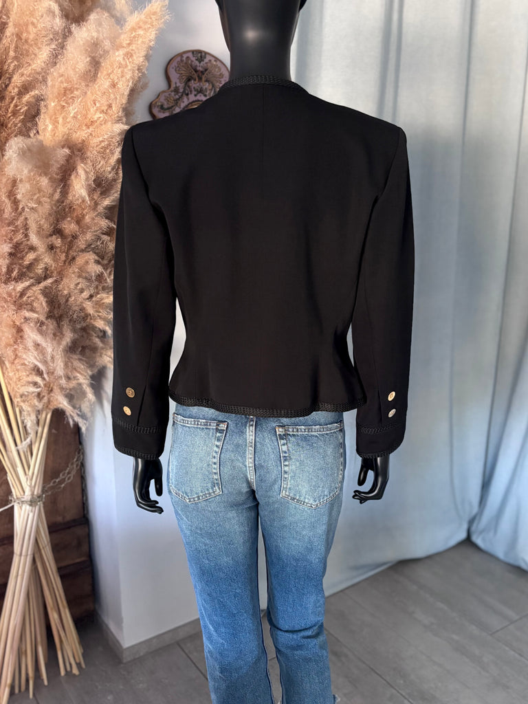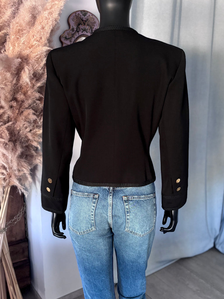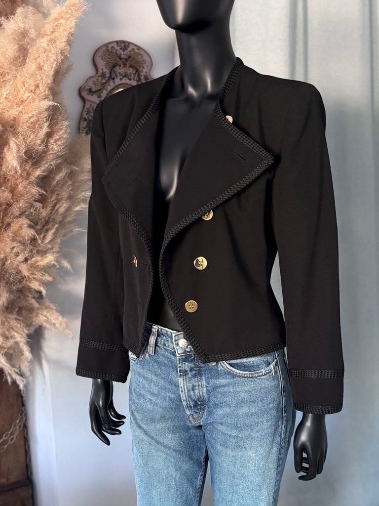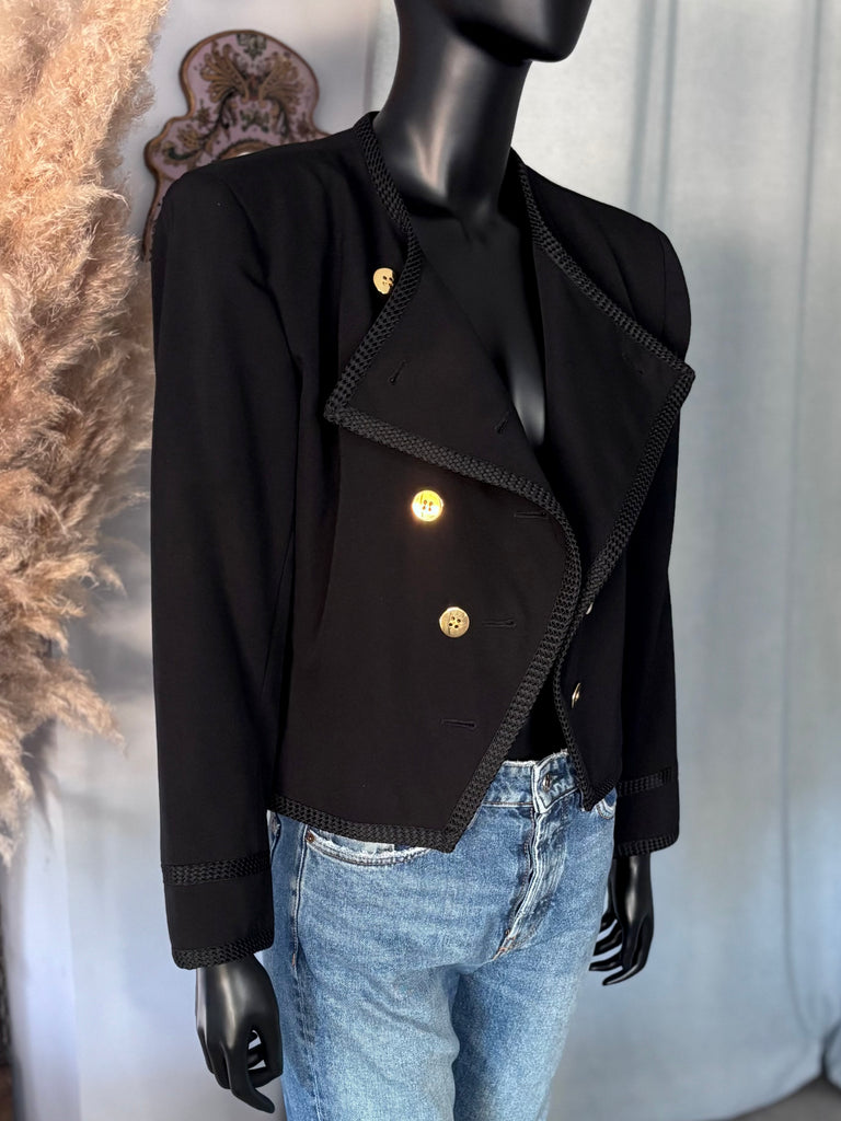 Veste courte en laine fine de couleur noire gansée d’un galon tressé et soyeux. Coupe très ajustée à la taille et croisée avec fermeture par boutons dorés et découpe légèrement en pointe sur l’avant. Epaules structurées par des épaulettes, poignets décorés d’un galon et de 2 boutons. Doublée.