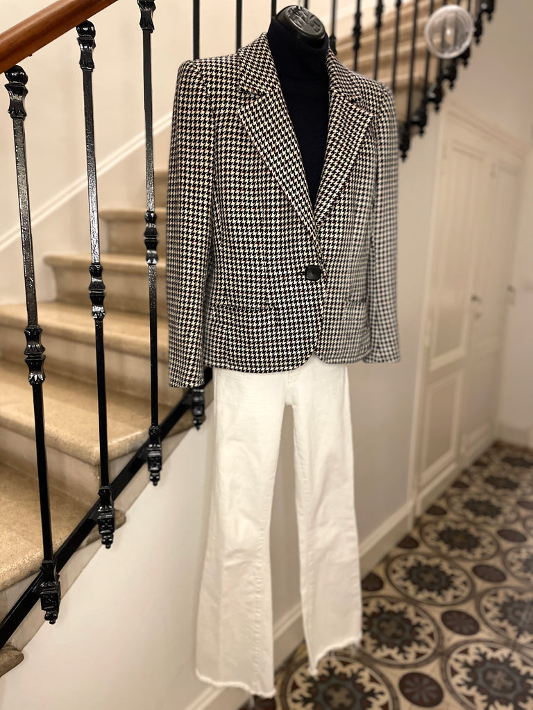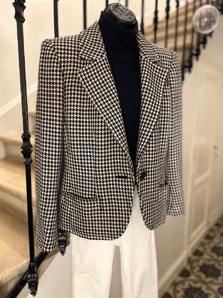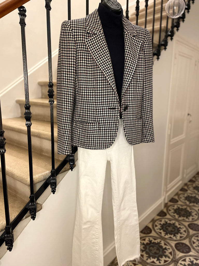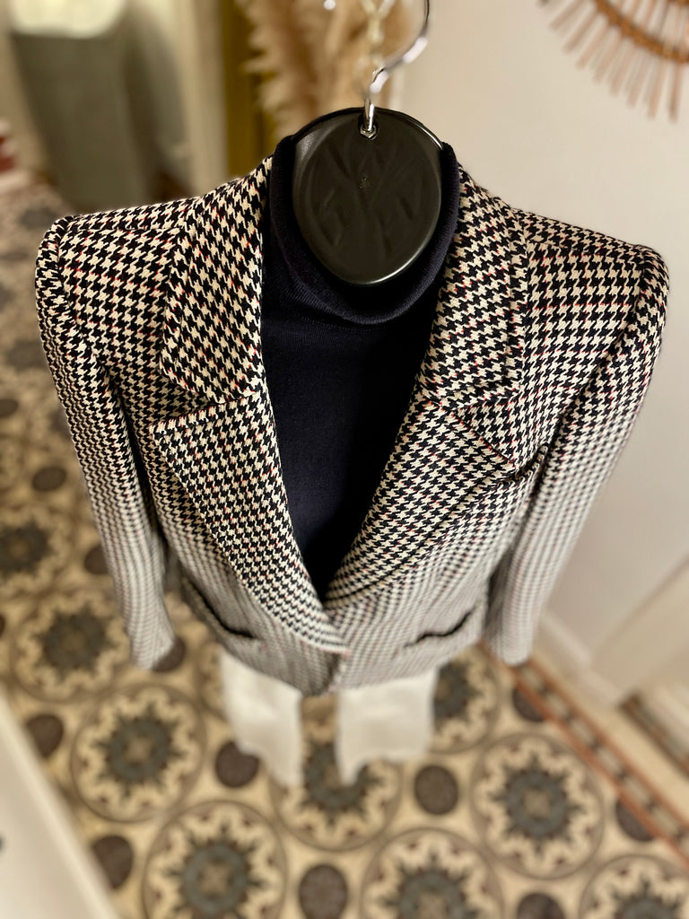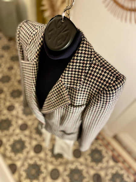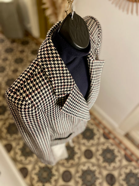 Veste en laine épaisse, pour un maximum de tenue, au motif pied de coq dans des couleurs blanc et bleu nuit (quasiment noir) avec une touche de rouge. Coupe droite structurée par des épaulettes épaisses, fermeture par 1 gros bouton noir texturé. 2 poches passepoilées et poignets terminés par 3 boutons. Doublée.