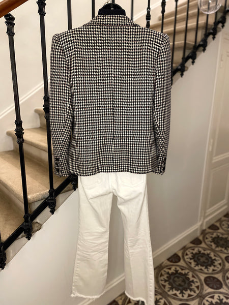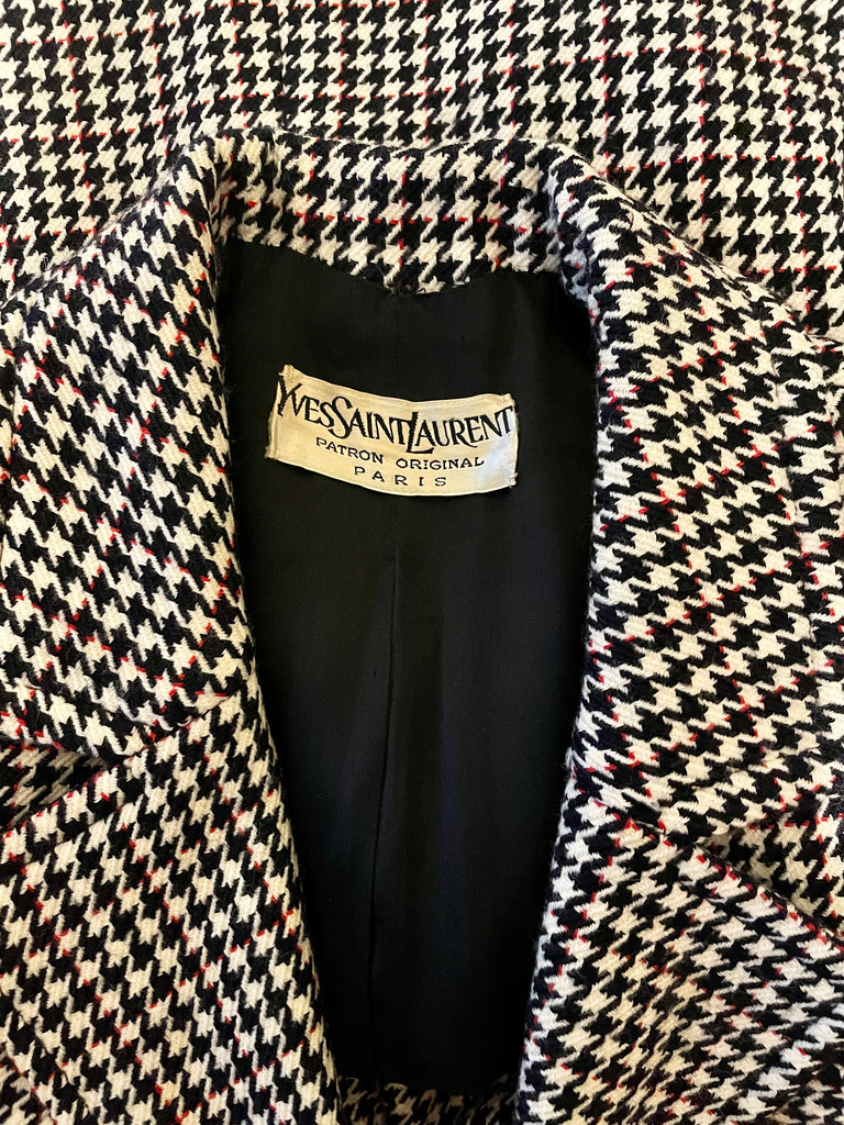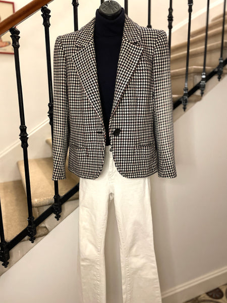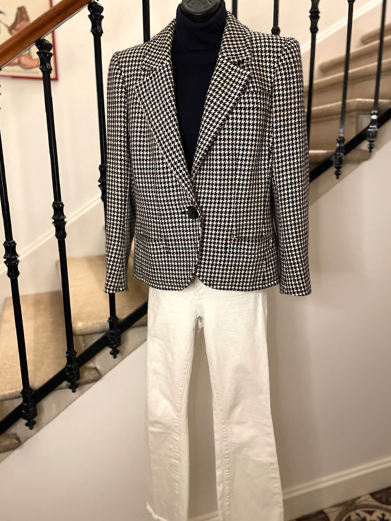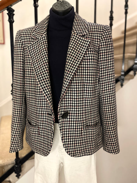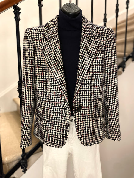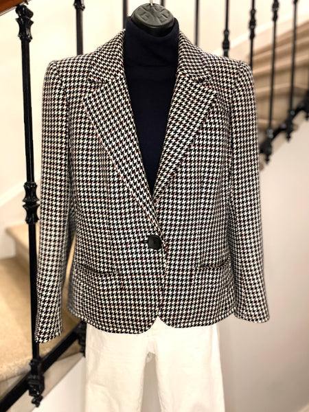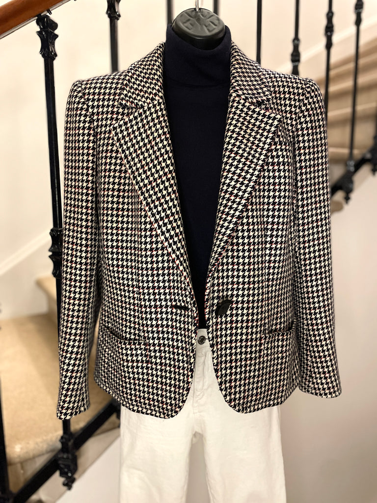 Veste en laine épaisse, pour un maximum de tenue, au motif pied de coq dans des couleurs blanc et bleu nuit (quasiment noir) avec une touche de rouge. Coupe droite structurée par des épaulettes épaisses, fermeture par 1 gros bouton noir texturé. 2 poches passepoilées et poignets terminés par 3 boutons. Doublée.
