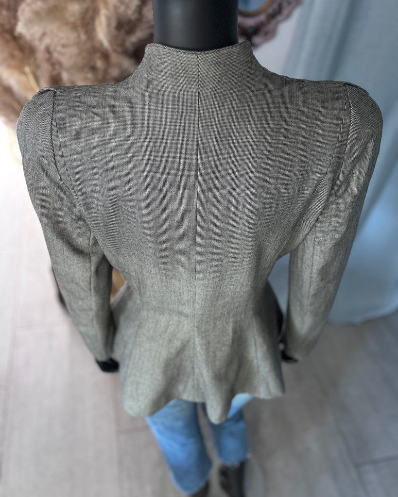 Veste en laine à l’imprimé pied de poule XXS de couleur noir et blanc. Coupe très ajustée et structurée avec fermeture croisée par boutons recouverts et épaulettes épaisses en arrondi. Doublée.