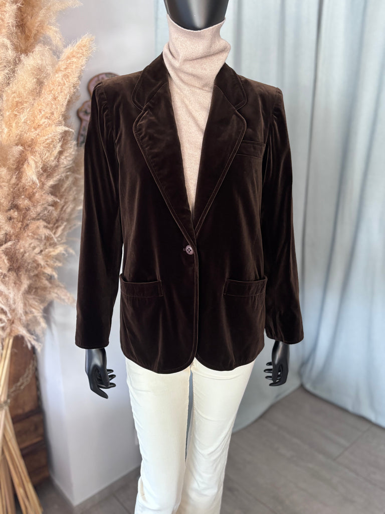 Veste en velours marron. Coupe droite, col plat et long revers lĂ©gĂšrement en arrondi, fermeture 1 bouton. Ăpaules structurĂ©es par des Ă©paulettes, 2 grandes poches passepoilĂ©es, une pochette et poignets avec 1 bouton dĂ©coratif.Â